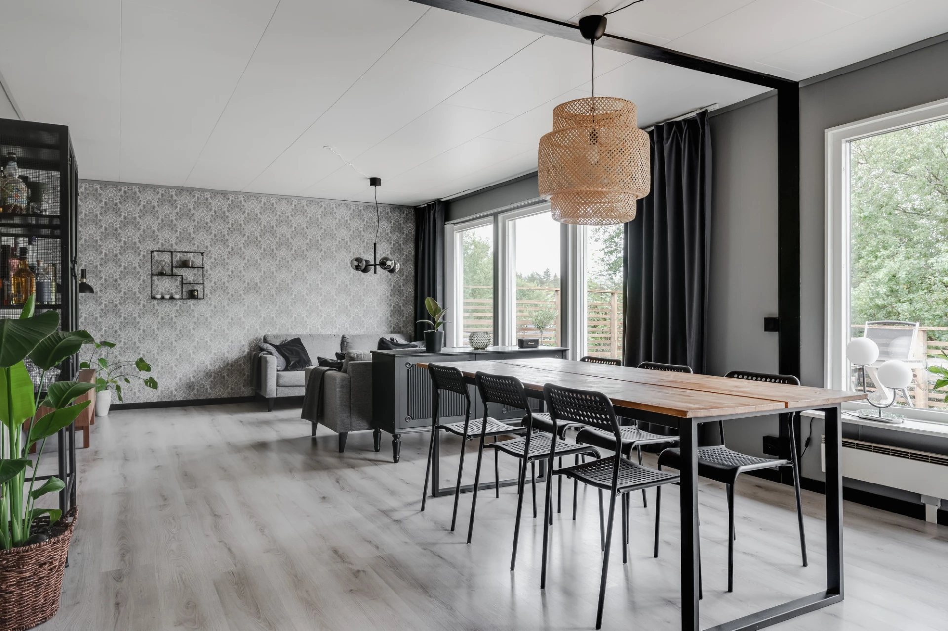 Luftigt vardagsrum med plats soffgrupp och tillhörande möblemang. Matplats i öppen planlösning mellan kök och vardagsrum. Här får ett större matsalsbord plats. Trevligt ljusinsläpp från flera fönster. Härifrån når ni ut till bostadens altan på baksidan som rymmer både loungedel, grill och utebord.