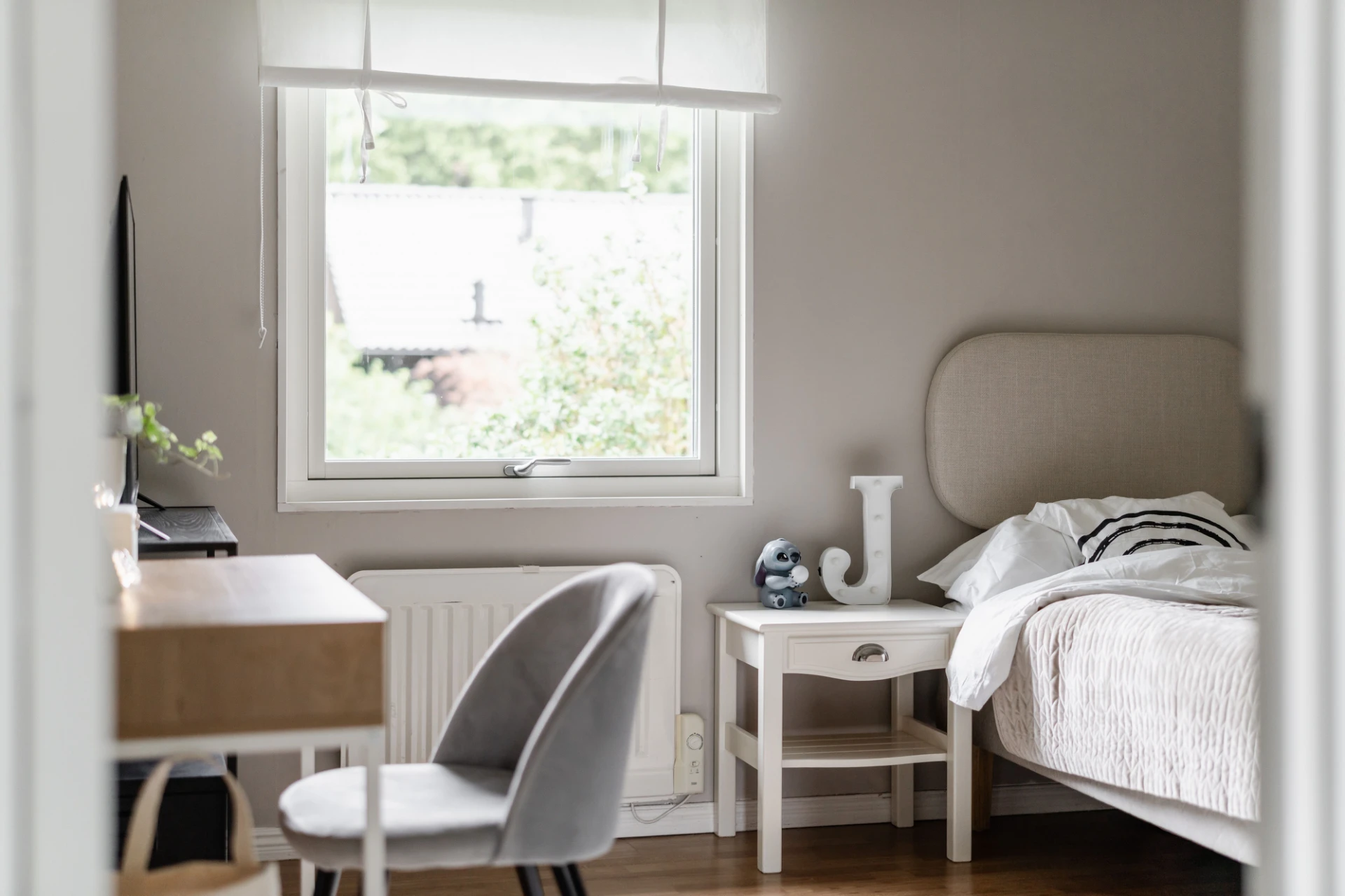 Bostadens första sovrum är inrett med enkelsäng, byrå och skrivbord. Vitmålade väggar och laminatgolv.