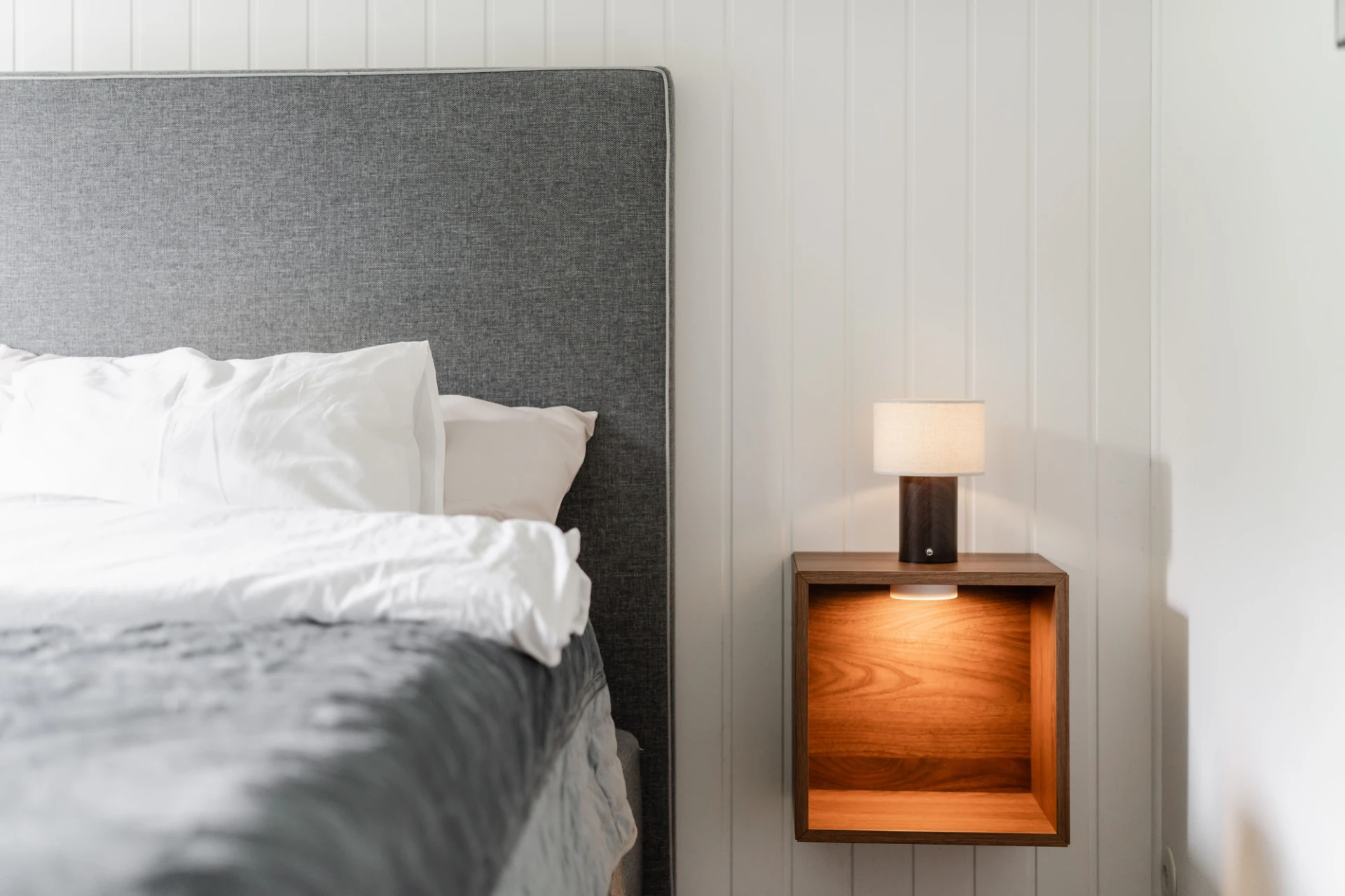 Det större sovrummet är inrett med dubbelsäng och tillhörande sängbord. Här finns en hel vägg med garderober till förvaring. Vit panel längst ena väggen annars vitmålade väggar och mörkt laminatgolv.