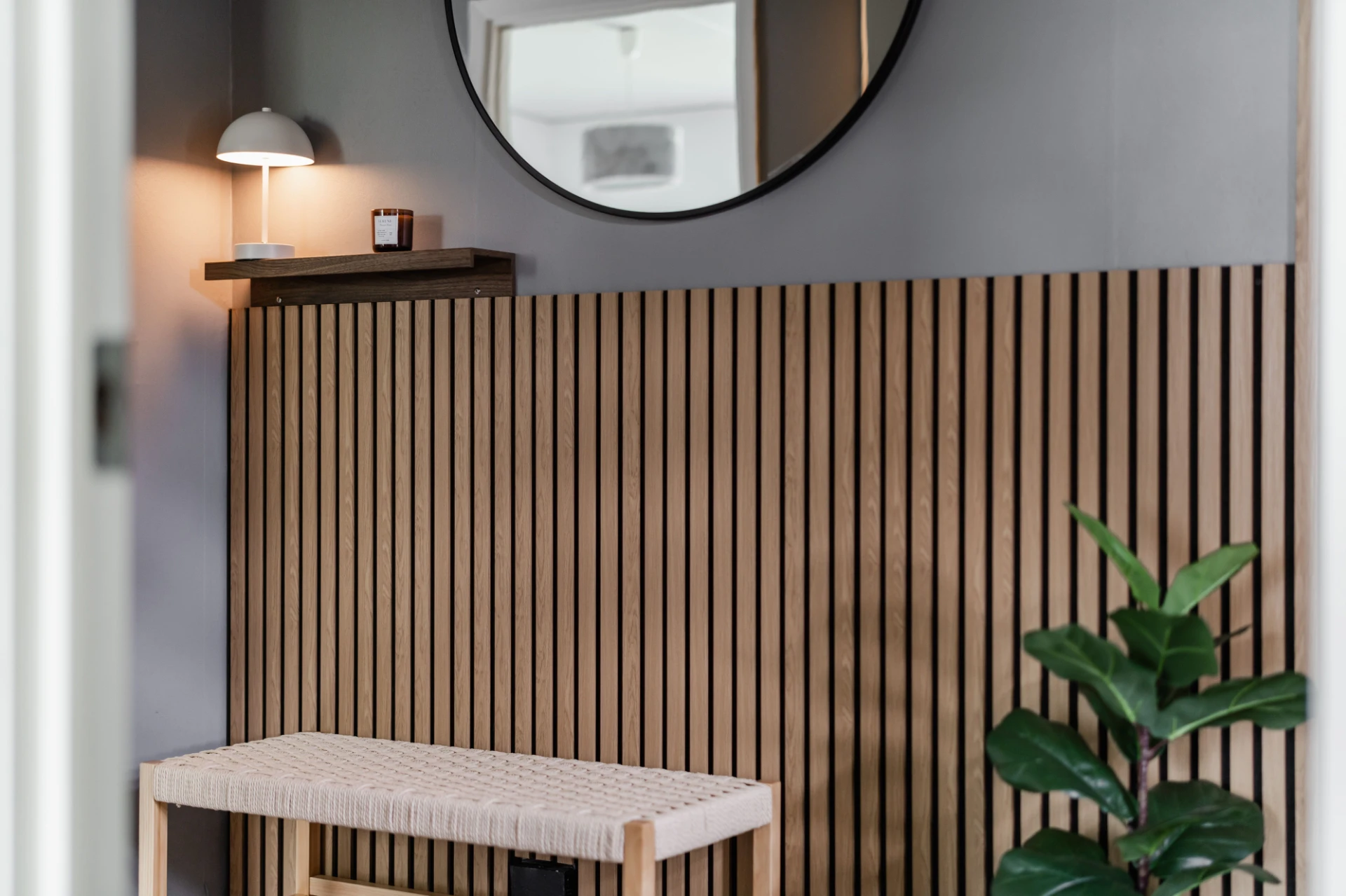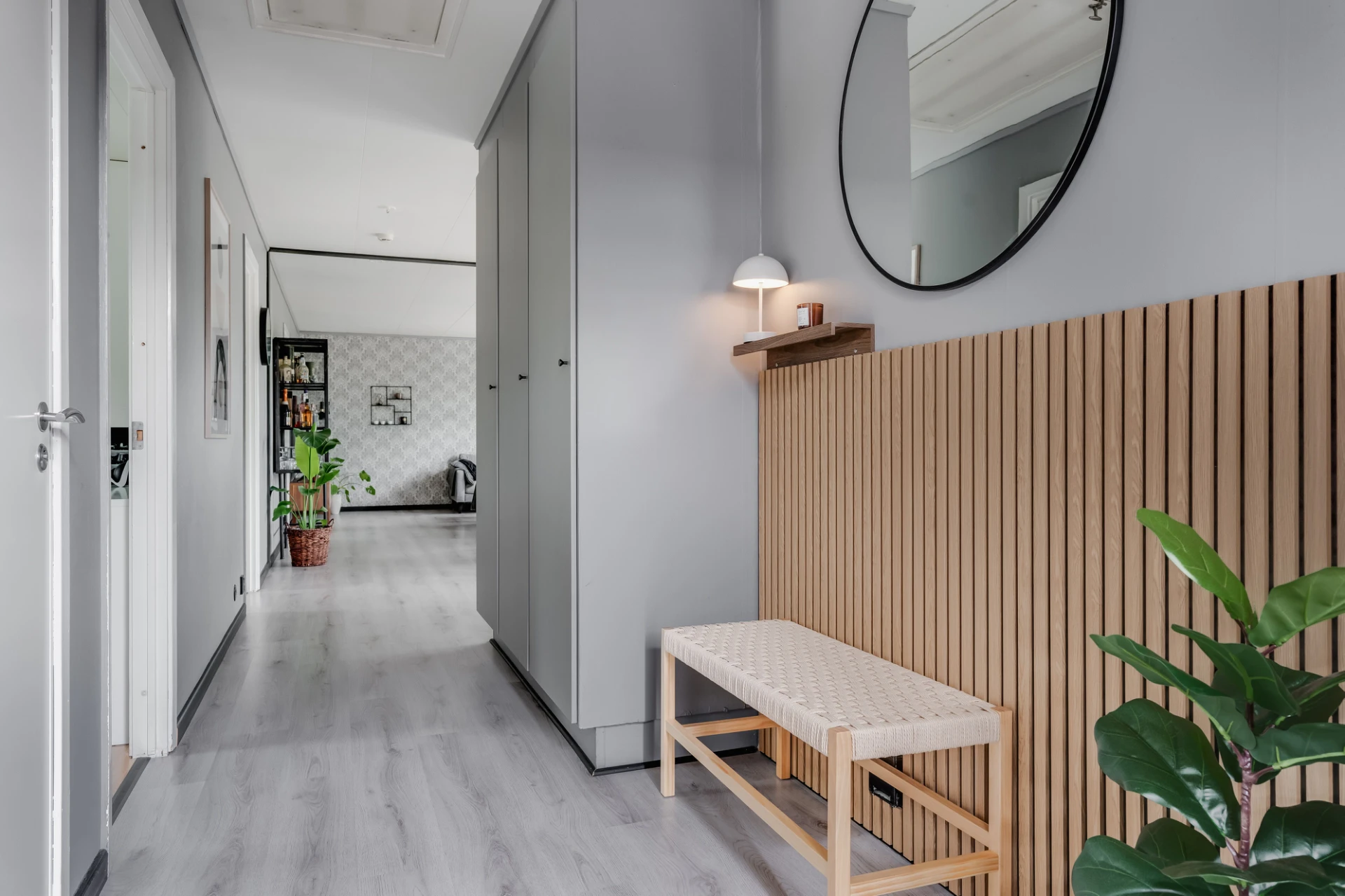 Hall med plats för avhängning. Renoverat 2025 med akustikpanel och nytt golv.