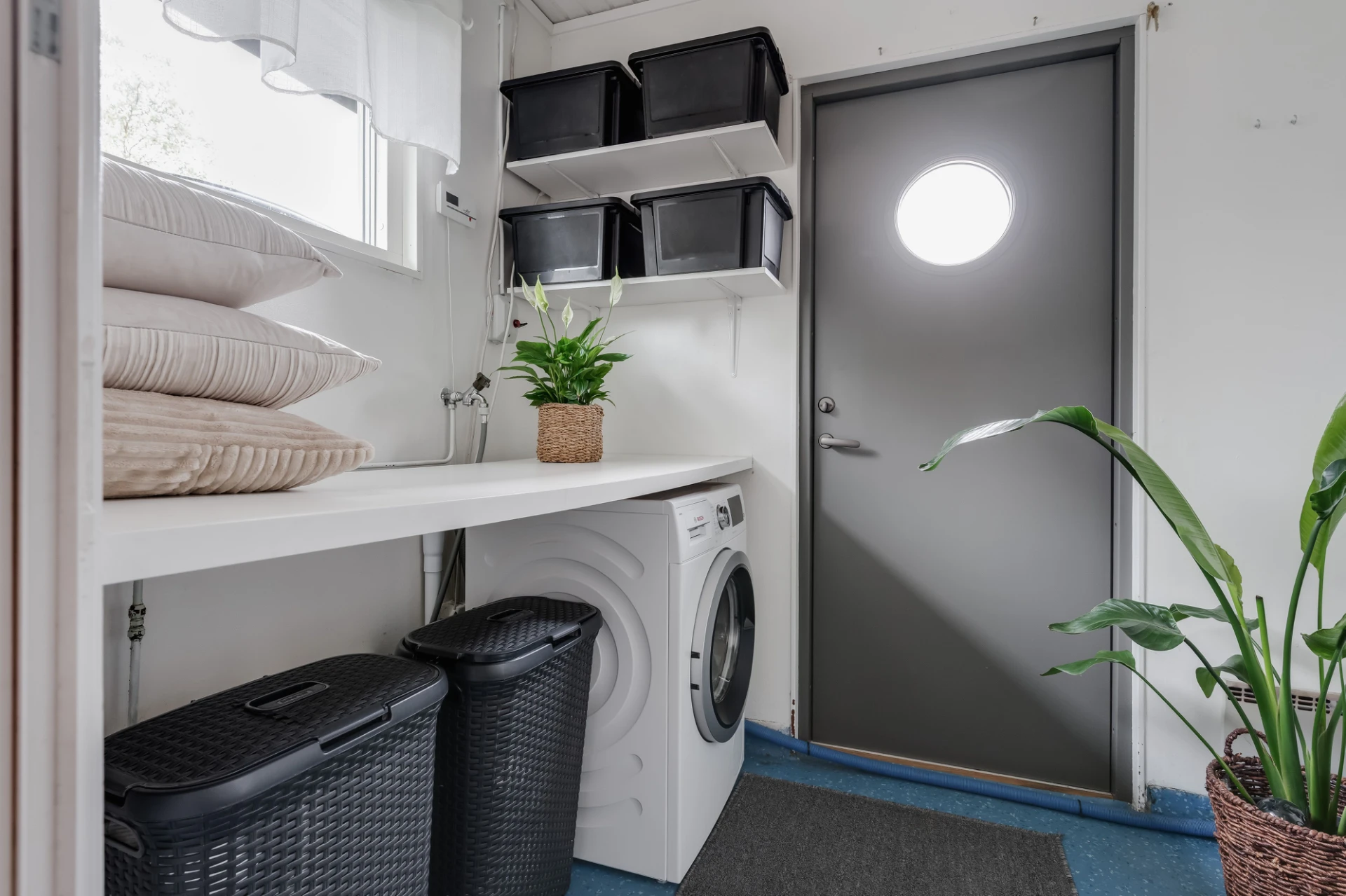 Här finns tvättmaskin med bänkskiva ovanpå samt plats för avhängning. Plastmatta på golvet och vitmålade väggar.