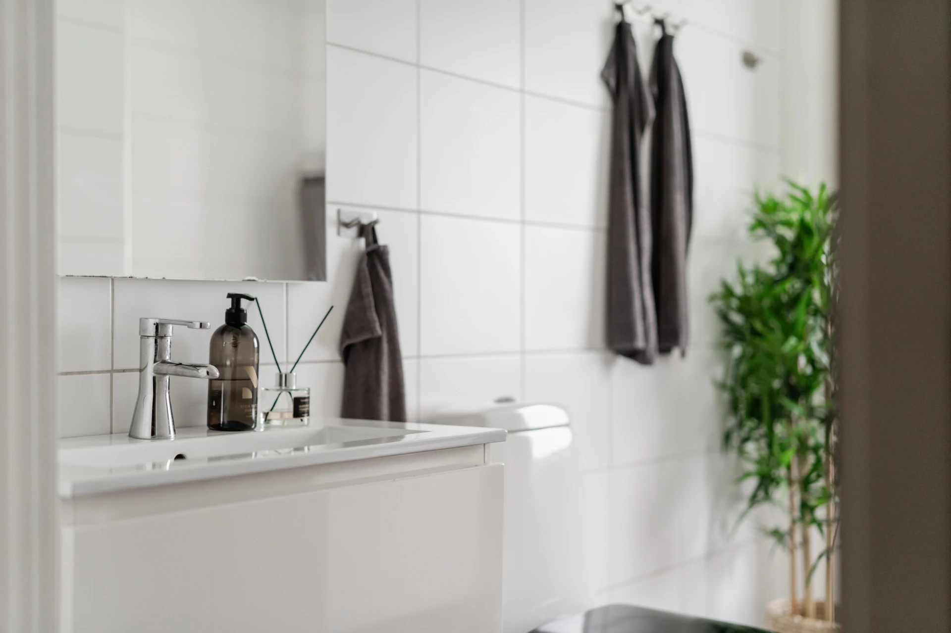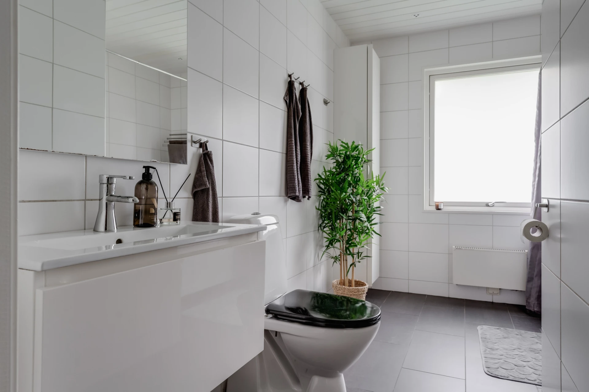 Badrum renoverat av tidigare ägare 2011. Här finns kommod, spegel, WC, förvaringsskåp och badkar. Helkaklat med grått klinker på golvet och vitt kakel på väggarna. Elektrisk golvvärme. Stort frostat fönster för fint ljusinsläpp.