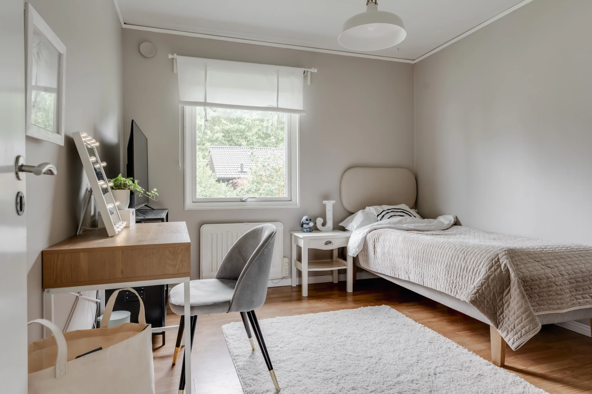 Bostadens andra sovrum är i snarlik storlek som första och även detta är inrett med enkelsäng, skrivbord och byrå. Här är väggarna beiga och laminat golv.