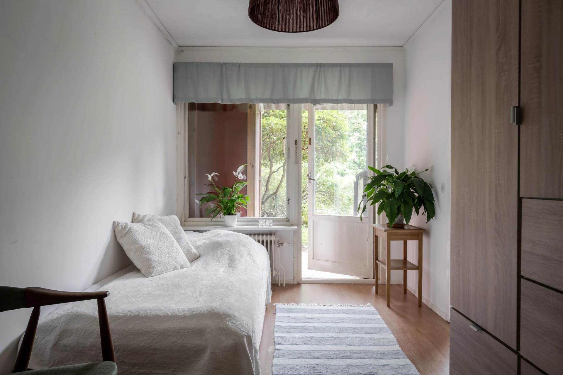 Det mindre sovrummet är idag inrett med enkelsäng och en garderob. Lämpar sig som barnrum eller hemmakontor. Rummet har vita väggar och laminat på golvet. Innanför detta rum finns idag ett förråd. Här finns ytterligare en altandörr ut till baksidan.