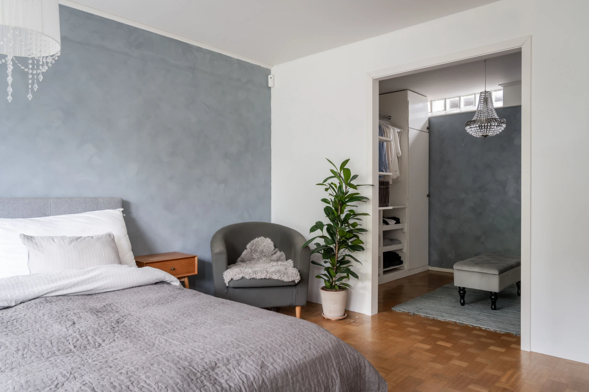 Master bedroom är ett omgjort vardagsrum vilket ger en extra lyxig känsla. Härlig rymd, trevliga dubbeldörrar och stort fönsterparti utmärker detta sovrum. Ommålat i modern kalk-färg i blågrå toner och klassisk ekparkett på golvet. Innanför detta sovrum finns en stor klädkammare med god förvaring.