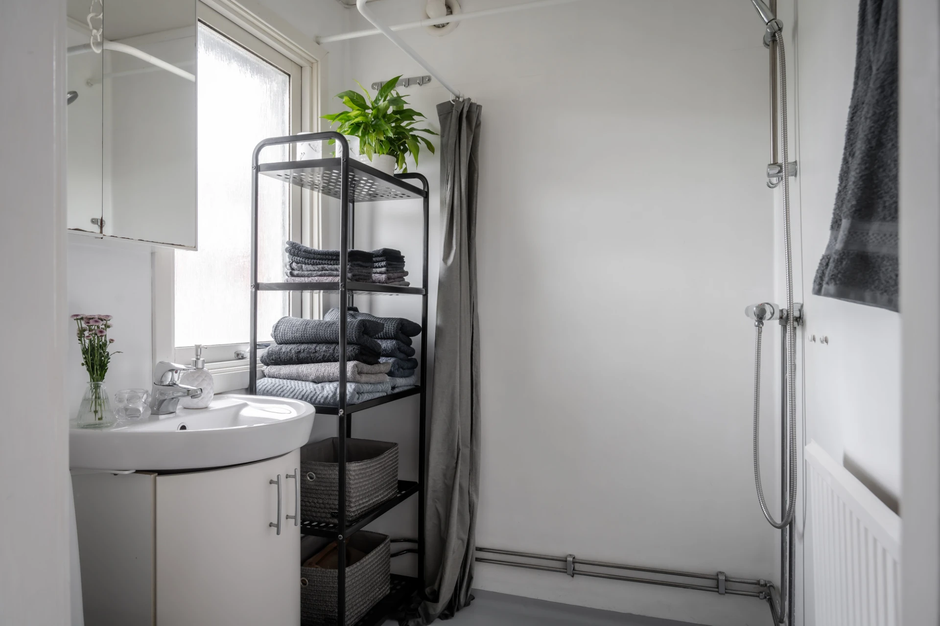 Badrummet erbjuder dusch, WC, kommod och spegel. Här är plastmatta på golv och väggar som säljaren målat.