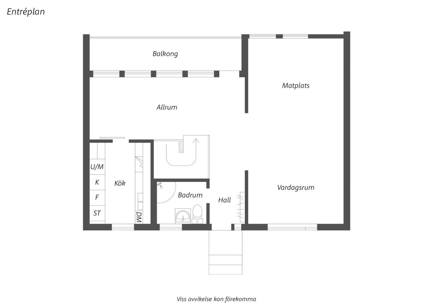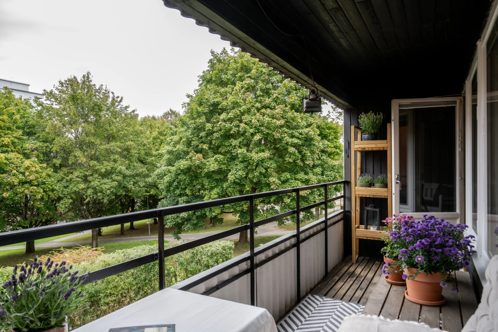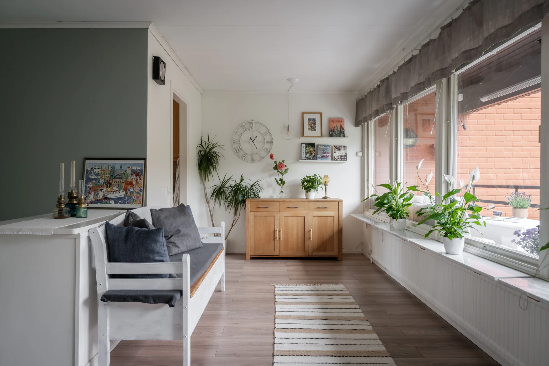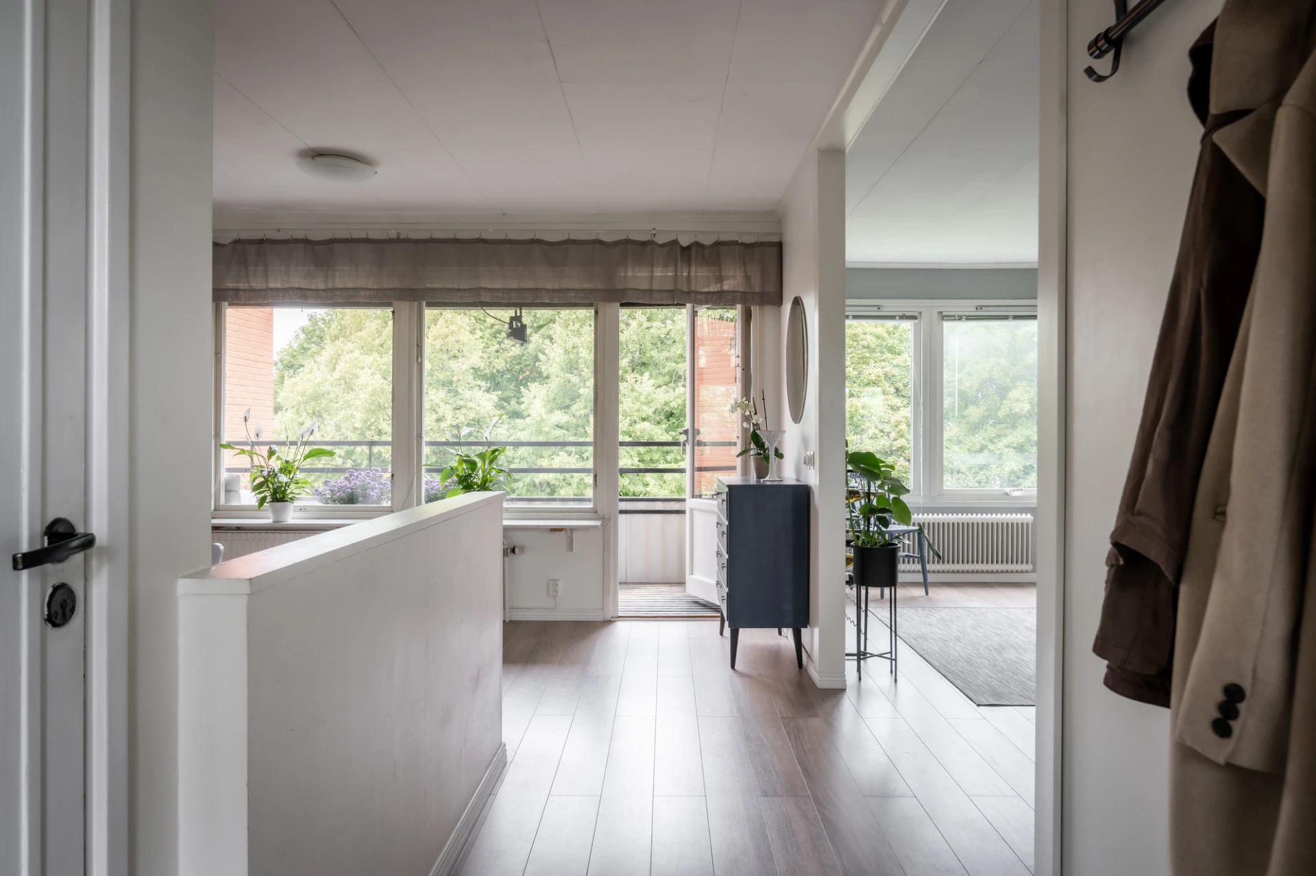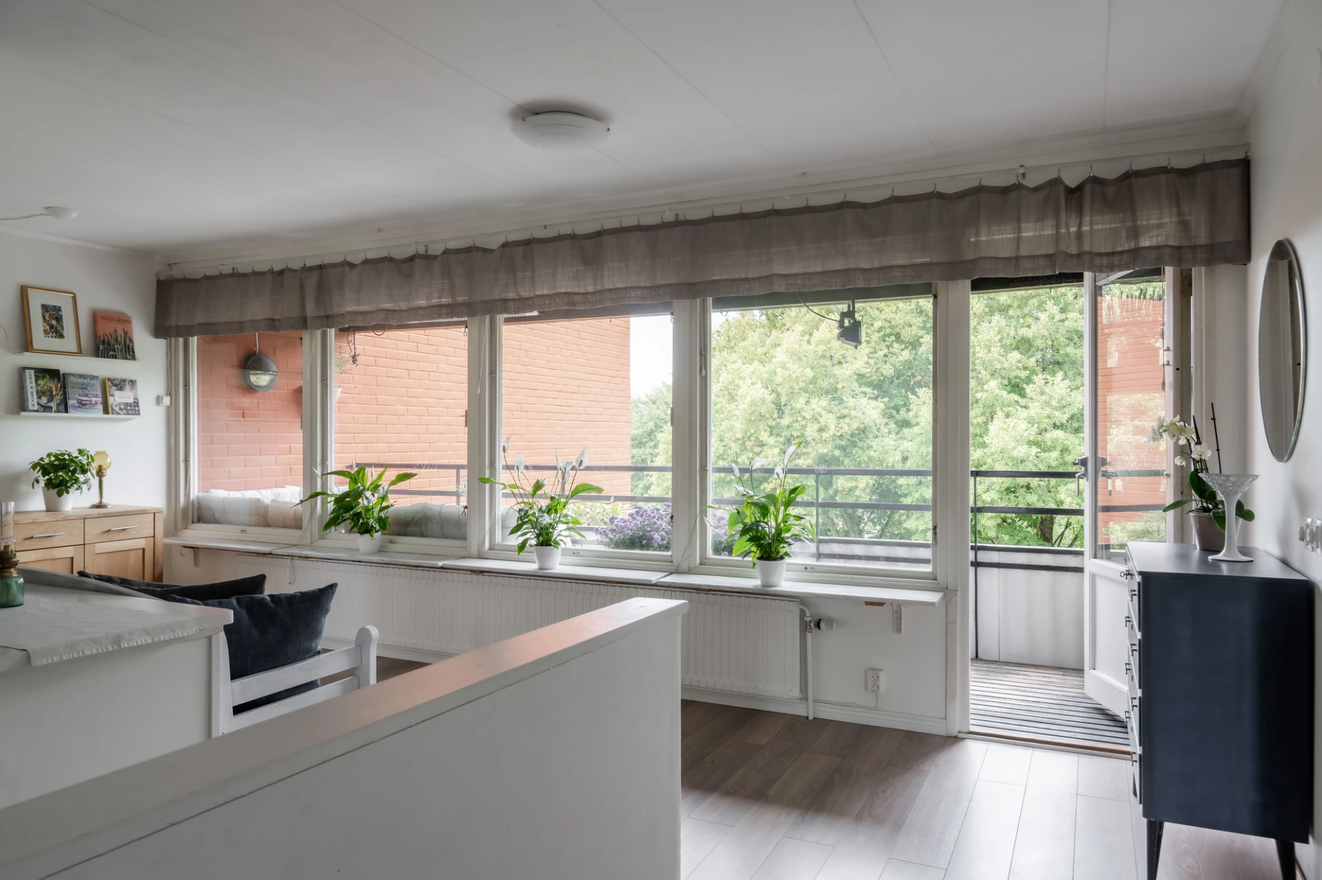 Allrummet skulle man kunna inreda som matplats. Idag har säljarna lämnat ytan luftig. Här är trevligt ljusinsläpp från flera fönster som vetter åt balkongen. Balkongen är avlång och rymlig. Här kan du odla, fika och njuta av det lugna läget. Tack vara att huset är förskjutet får du ett insynsskyddat och privat läge här.