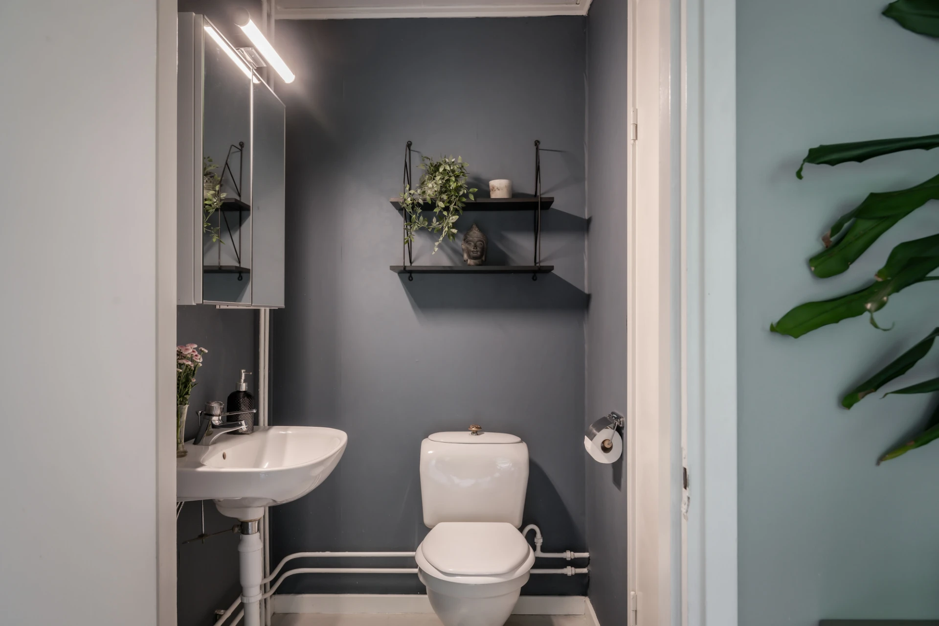 Toalett med handfat. Grå plastmatta på golvet och blå tapetserade väggar. Innanför här finner ni tvättstuga med tvättmaskin från 2018 och en stor diskho. Välkommen att trivas!