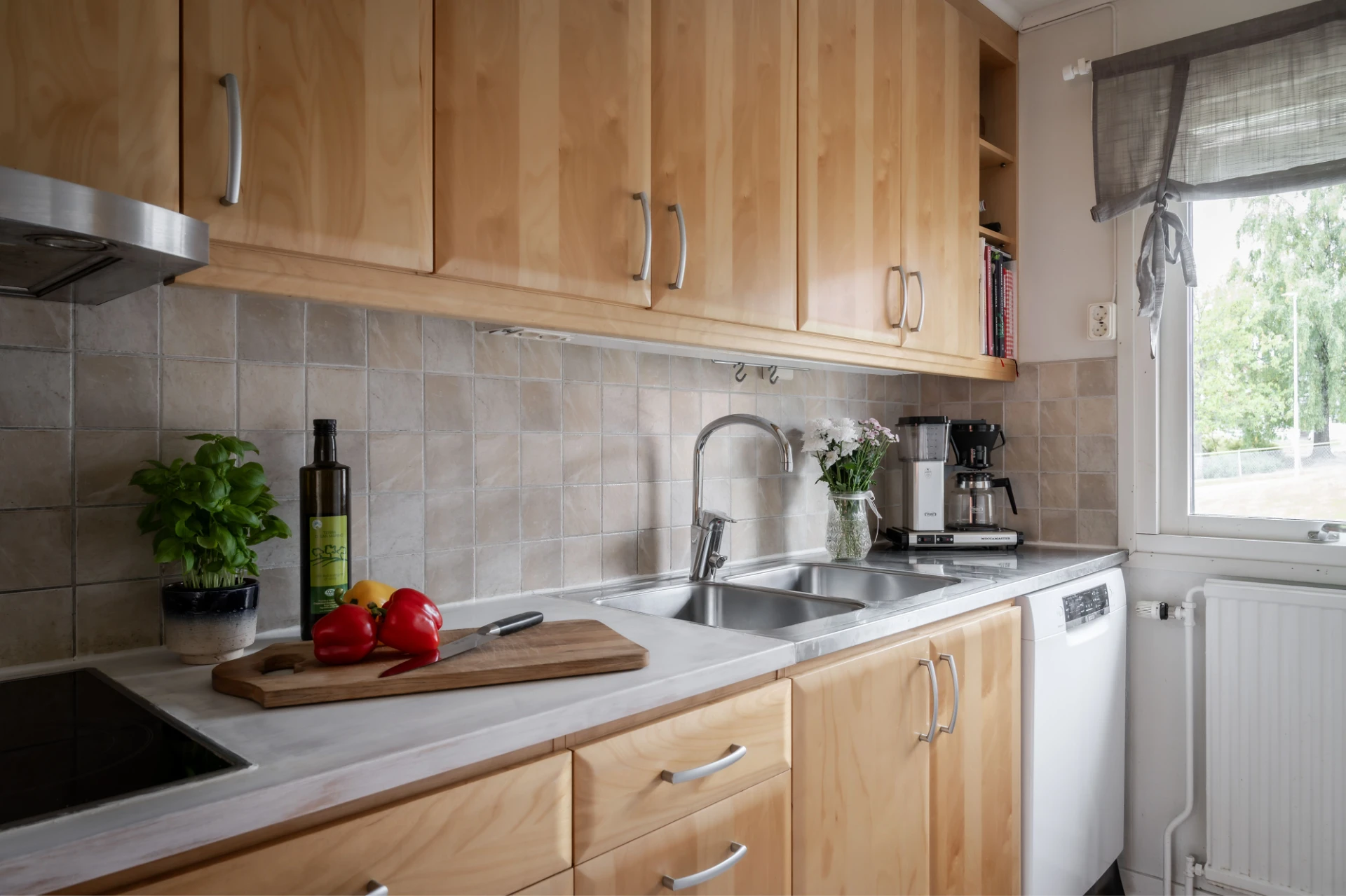 Kök i björkfanér från 2008 och erbjuder allt du behöver. Kyl/frys i full höjd. Diskmaskin från 2017. Gott om skåp till förvaring och bra bänkyta.