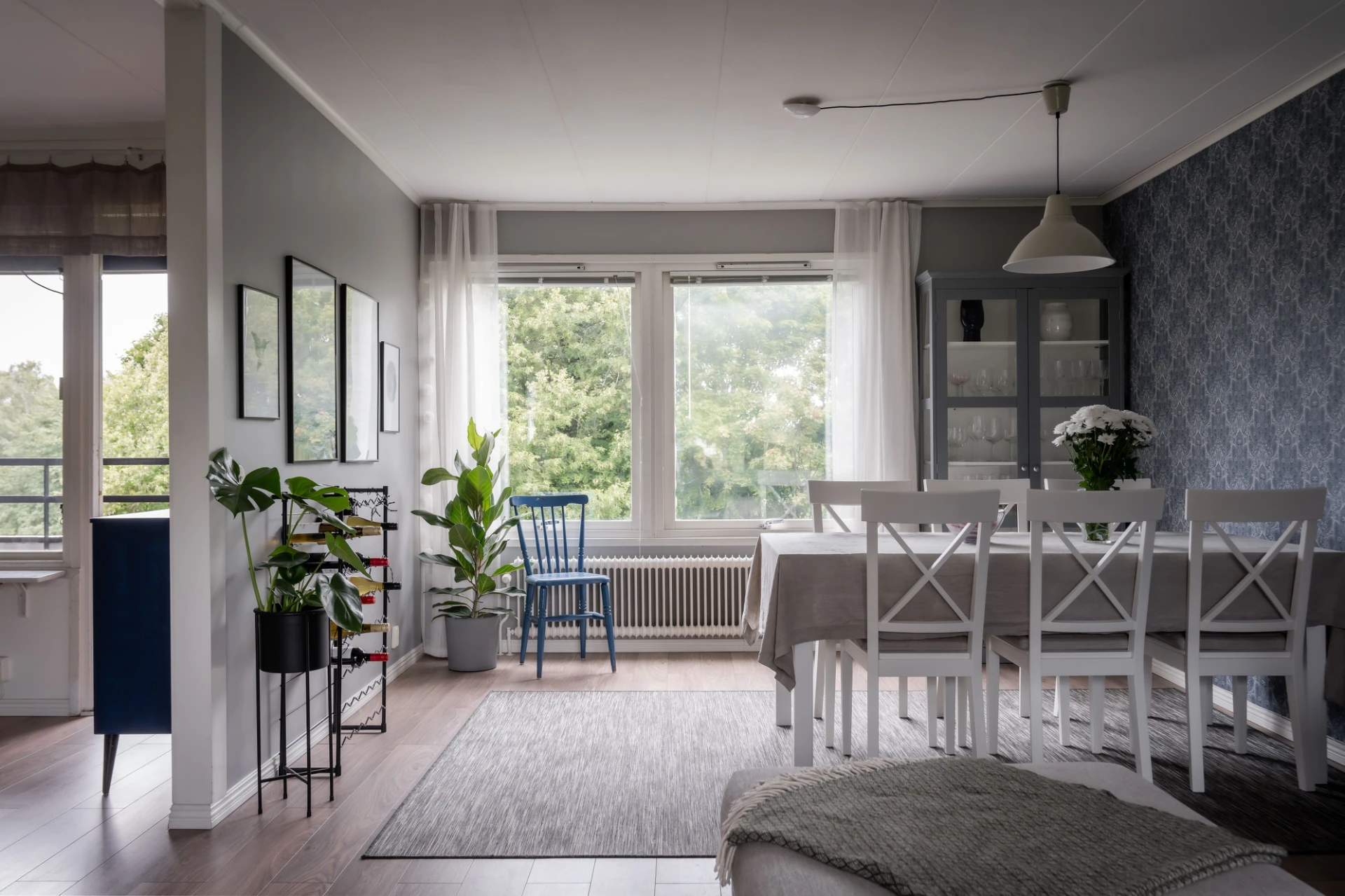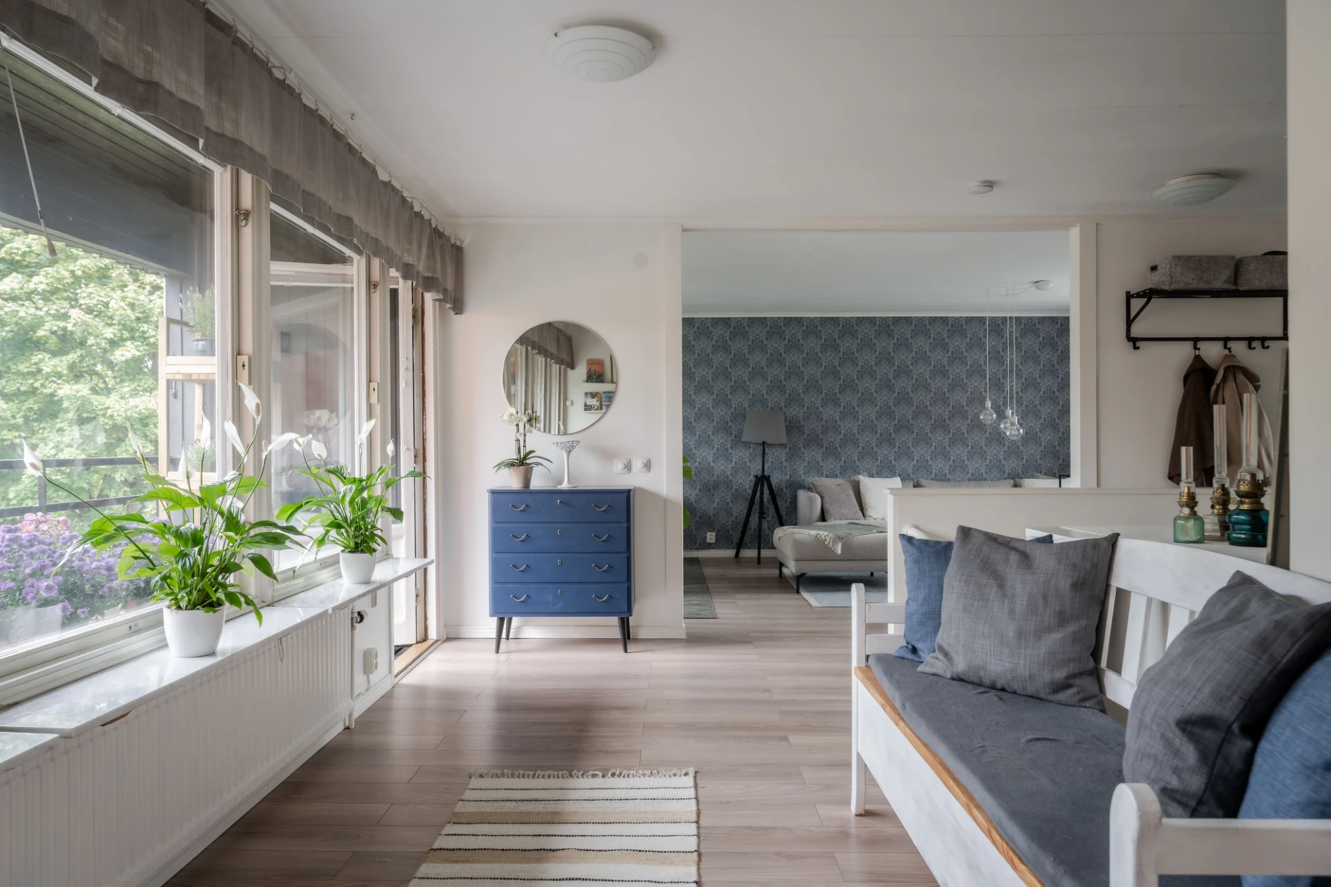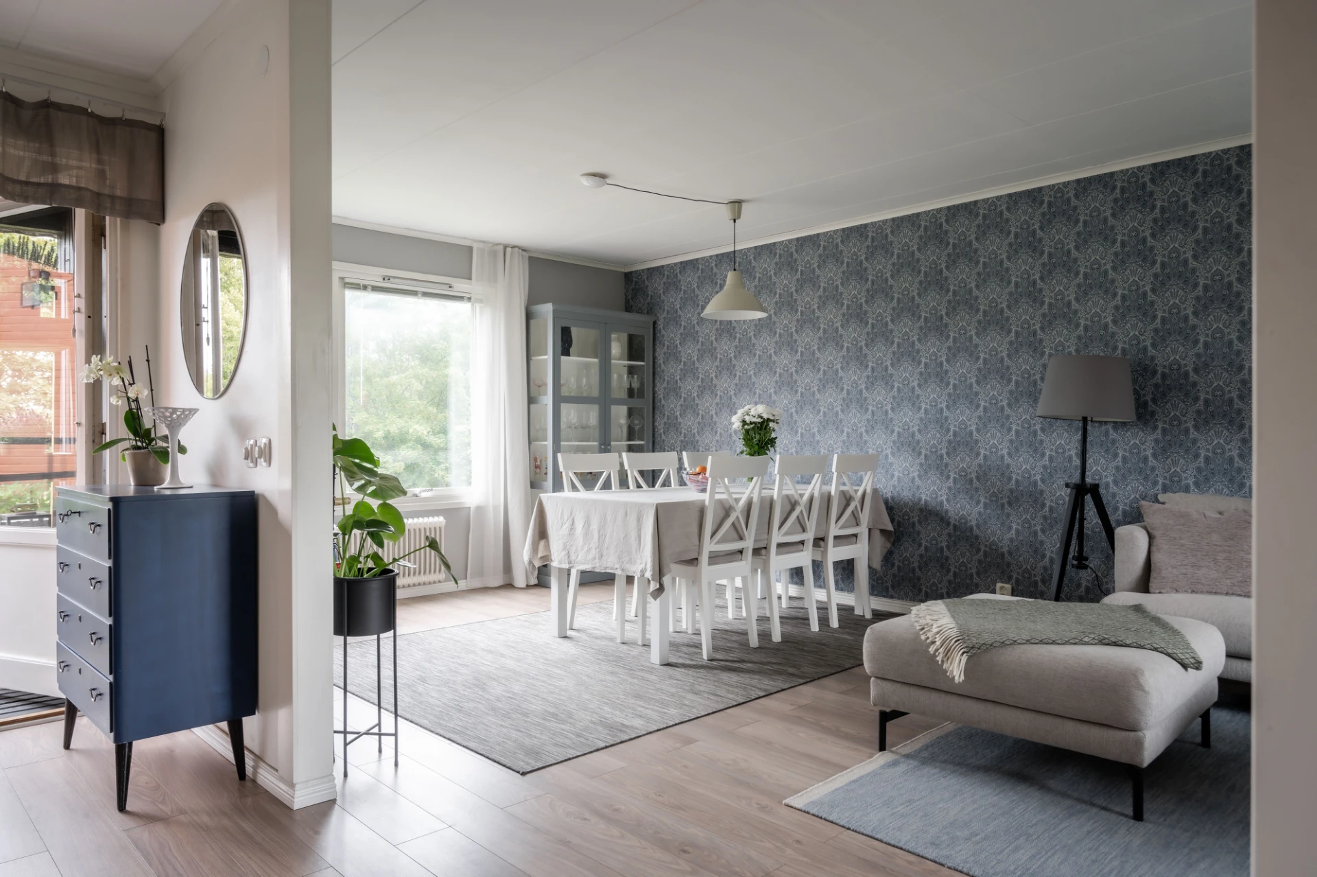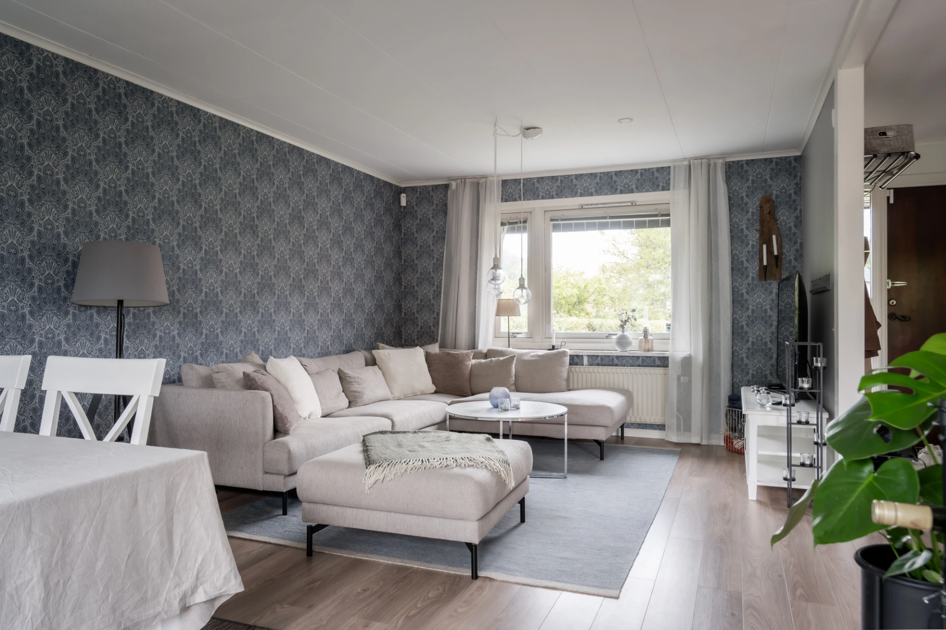 Luftigt vardagsrum med ljust laminatgolv och tapetserade väggar. Här får större soffa med tillhörande möblemang plats samt även matplats.