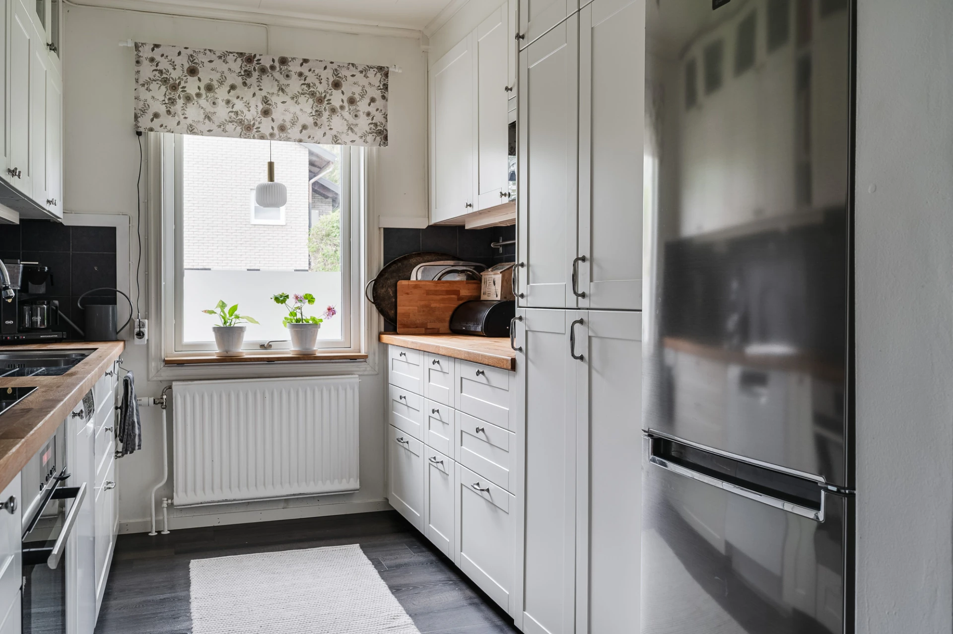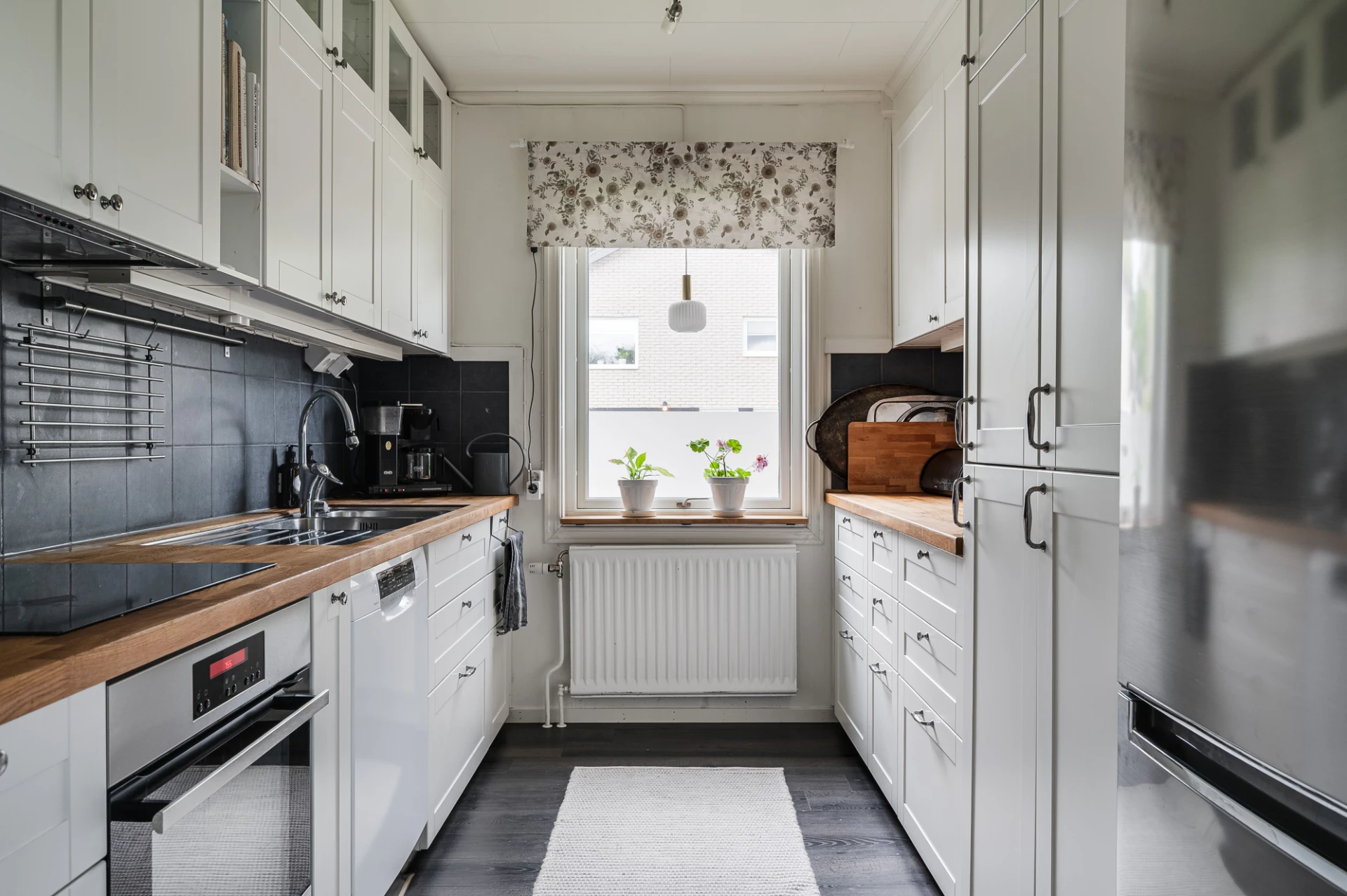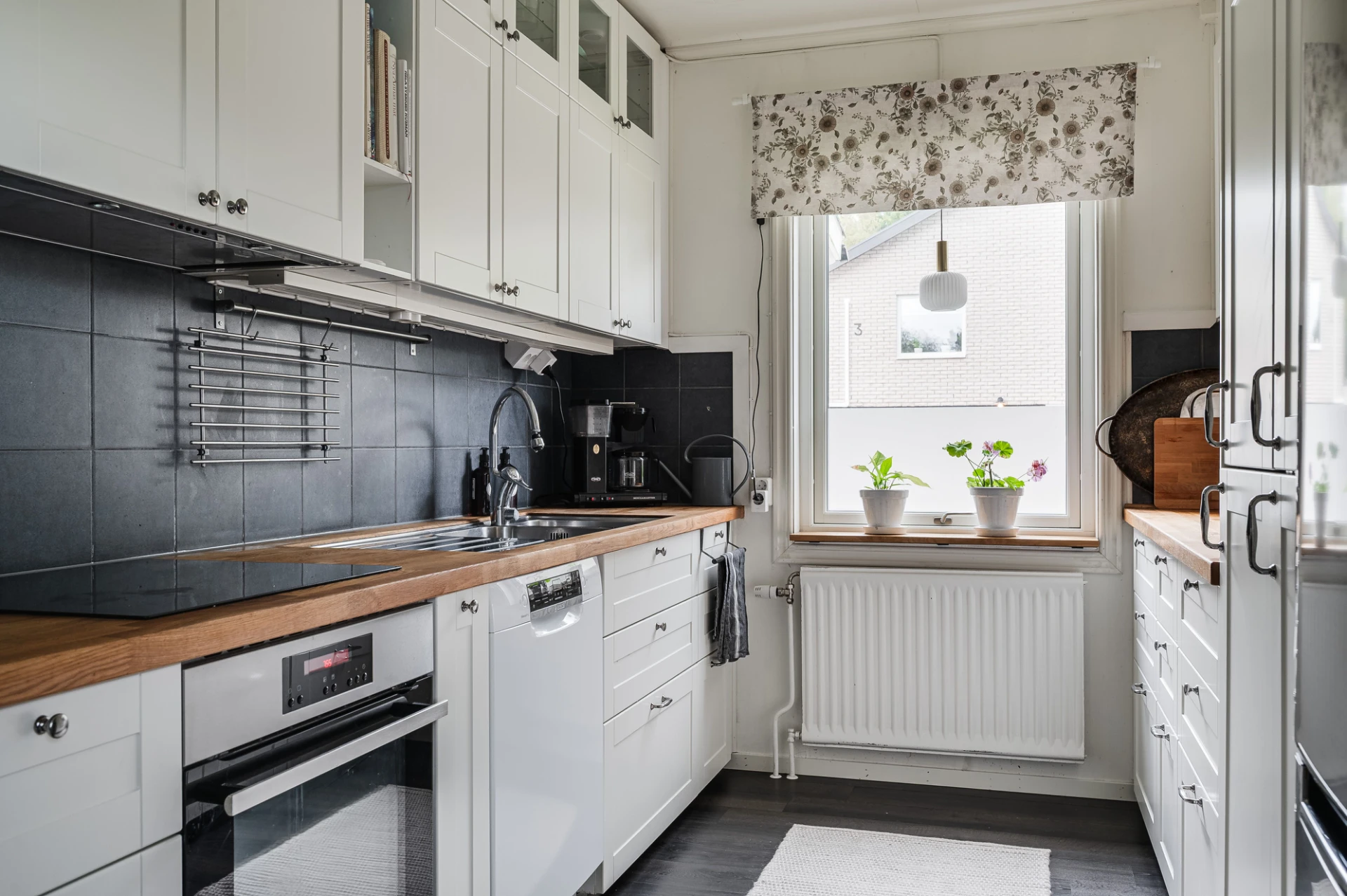 Kök med ljusa köksluckor och massiva bänkskivor i ek. Fullt utrustat med spishäll, ugn, kyl, frys och diskmaskin.