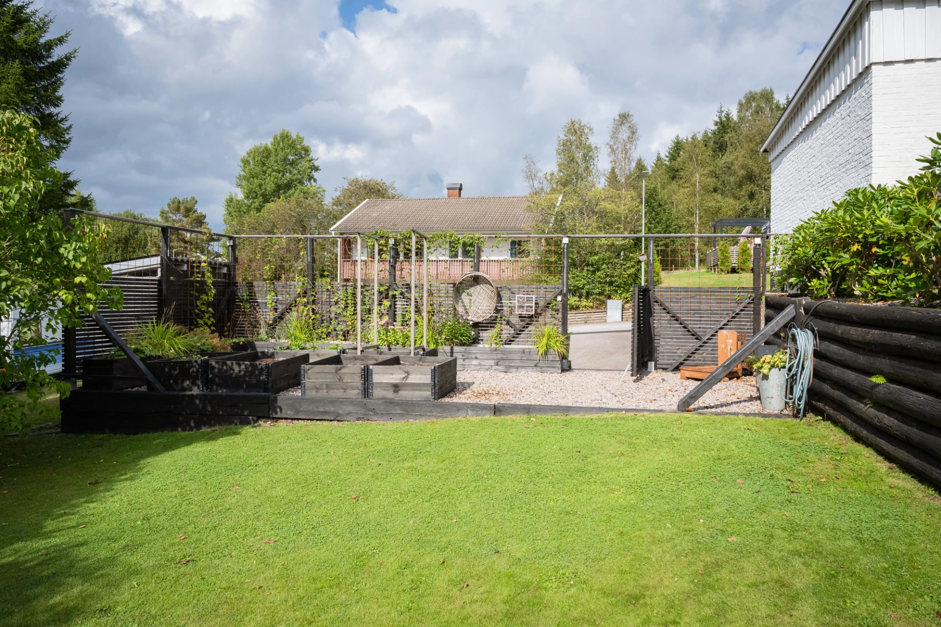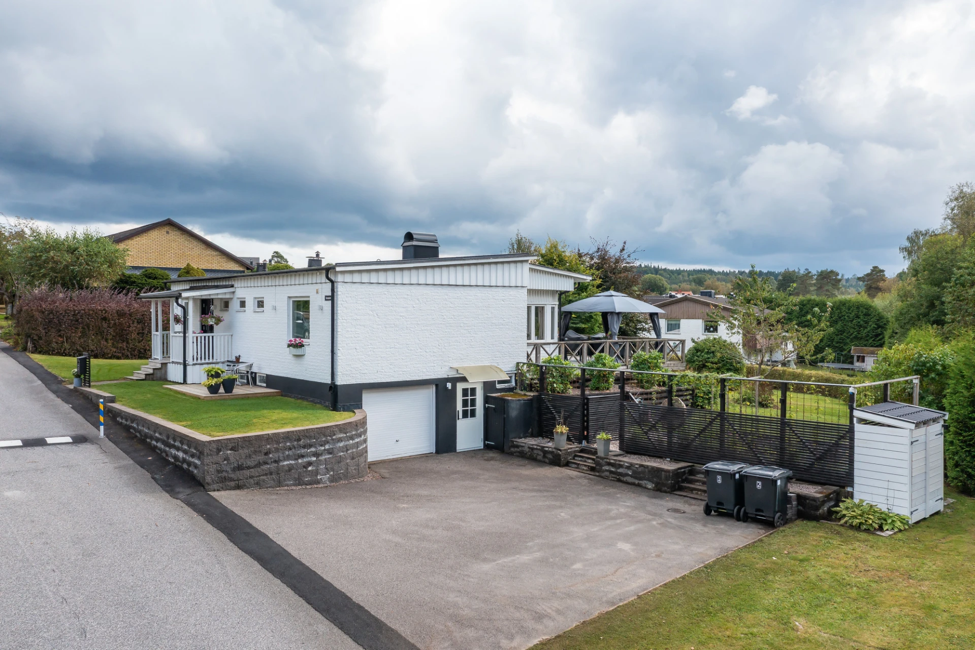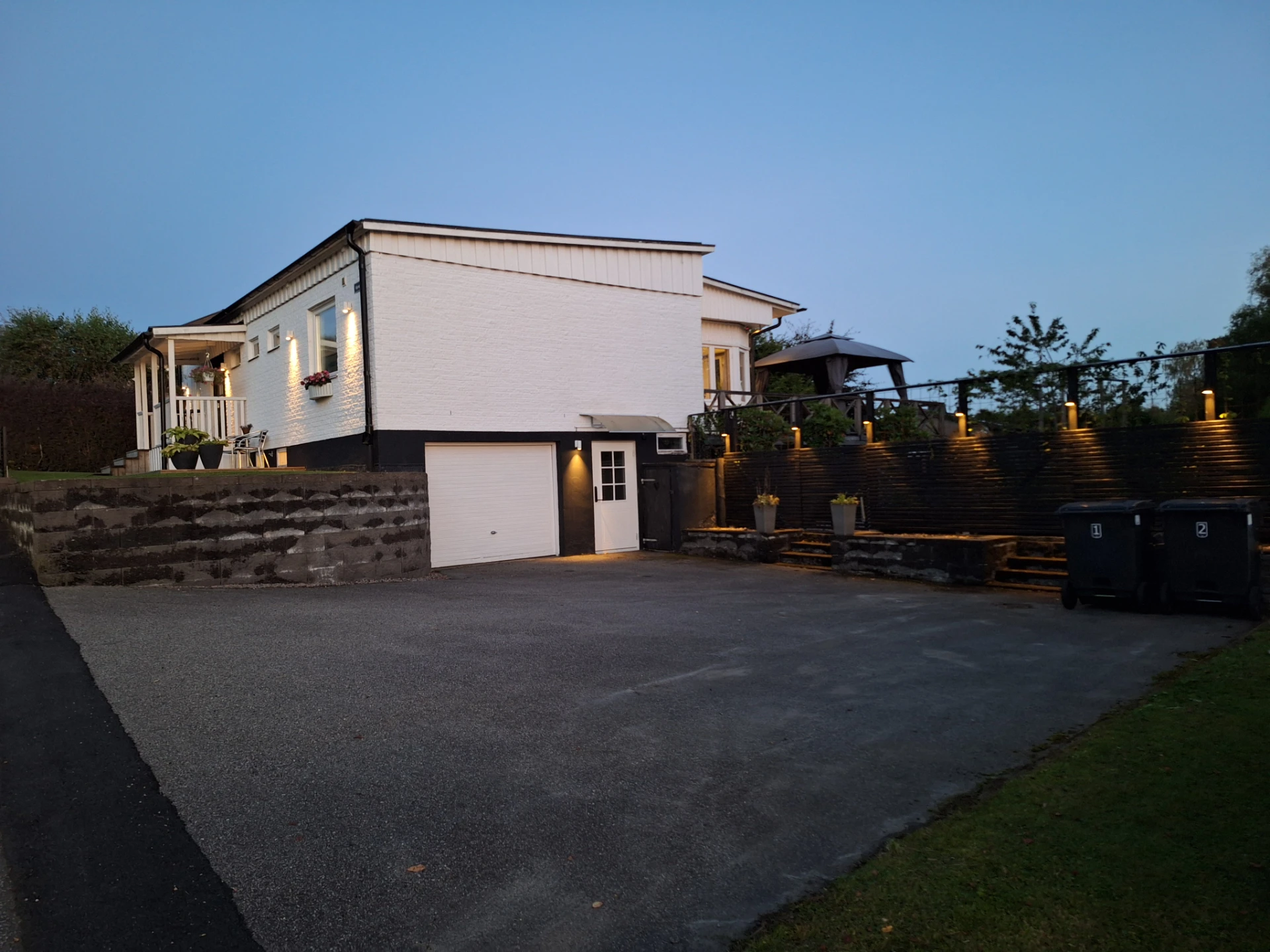 Garage i direkt anslutning till huset – praktiskt och skyddat.