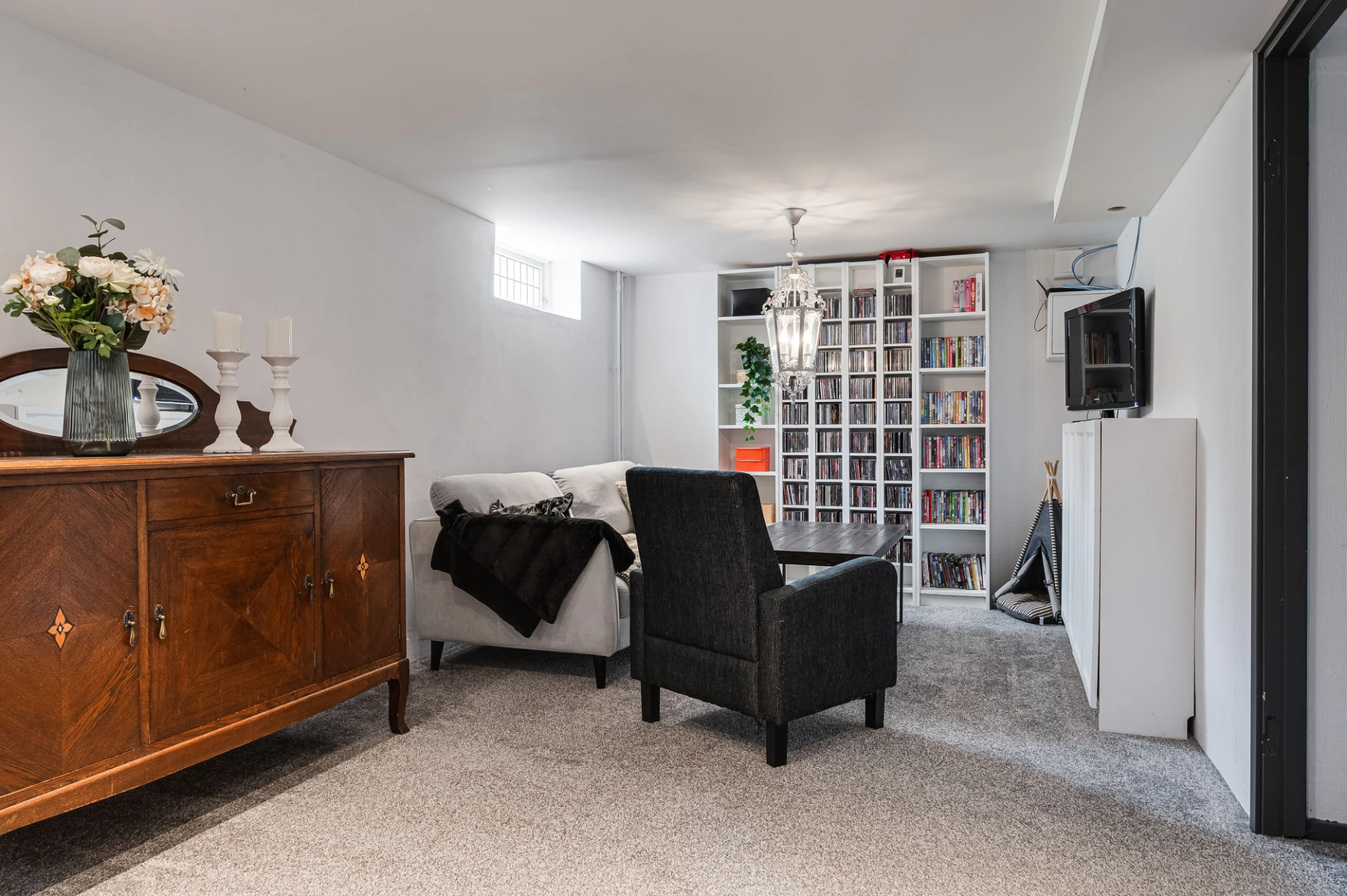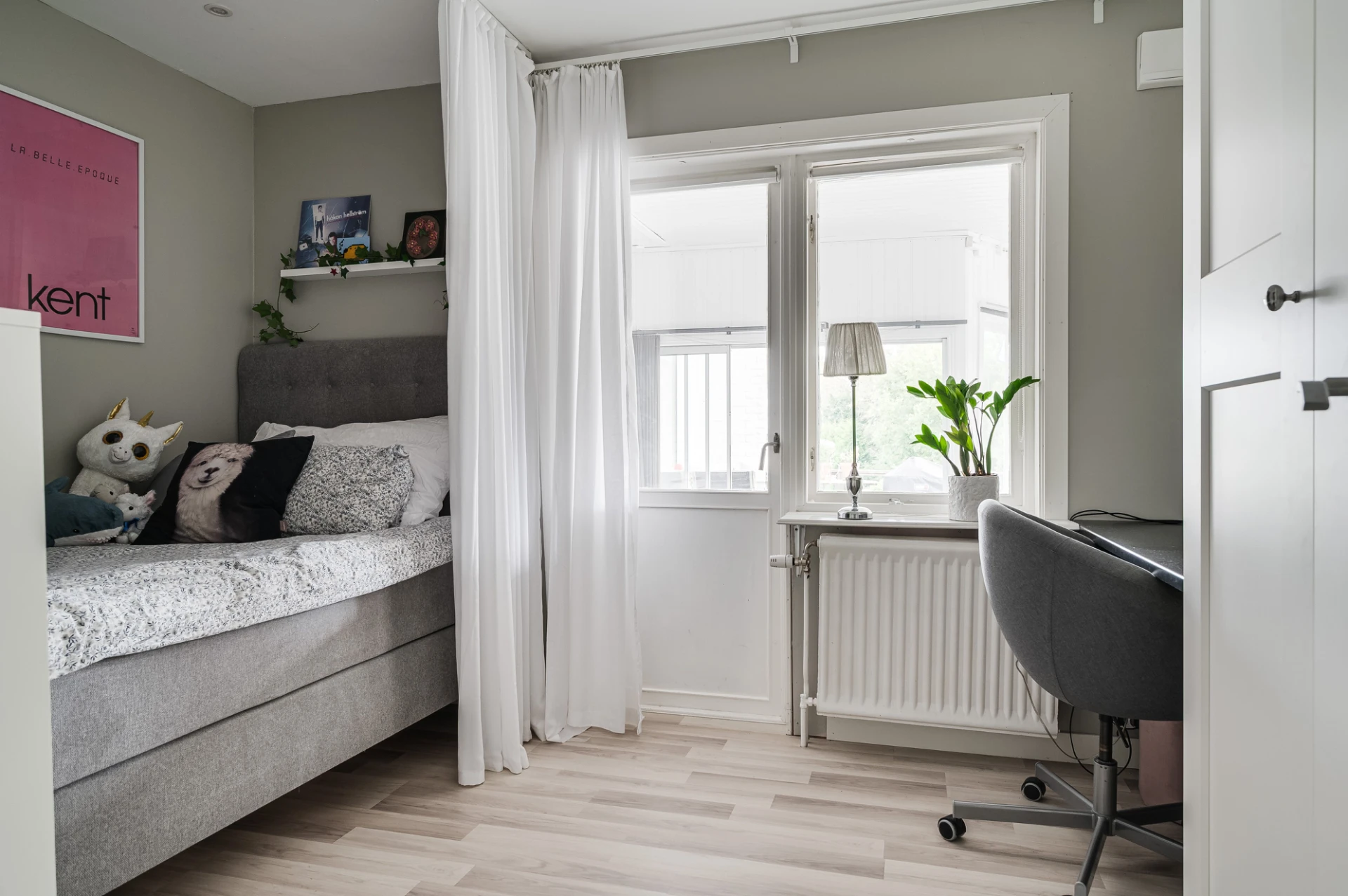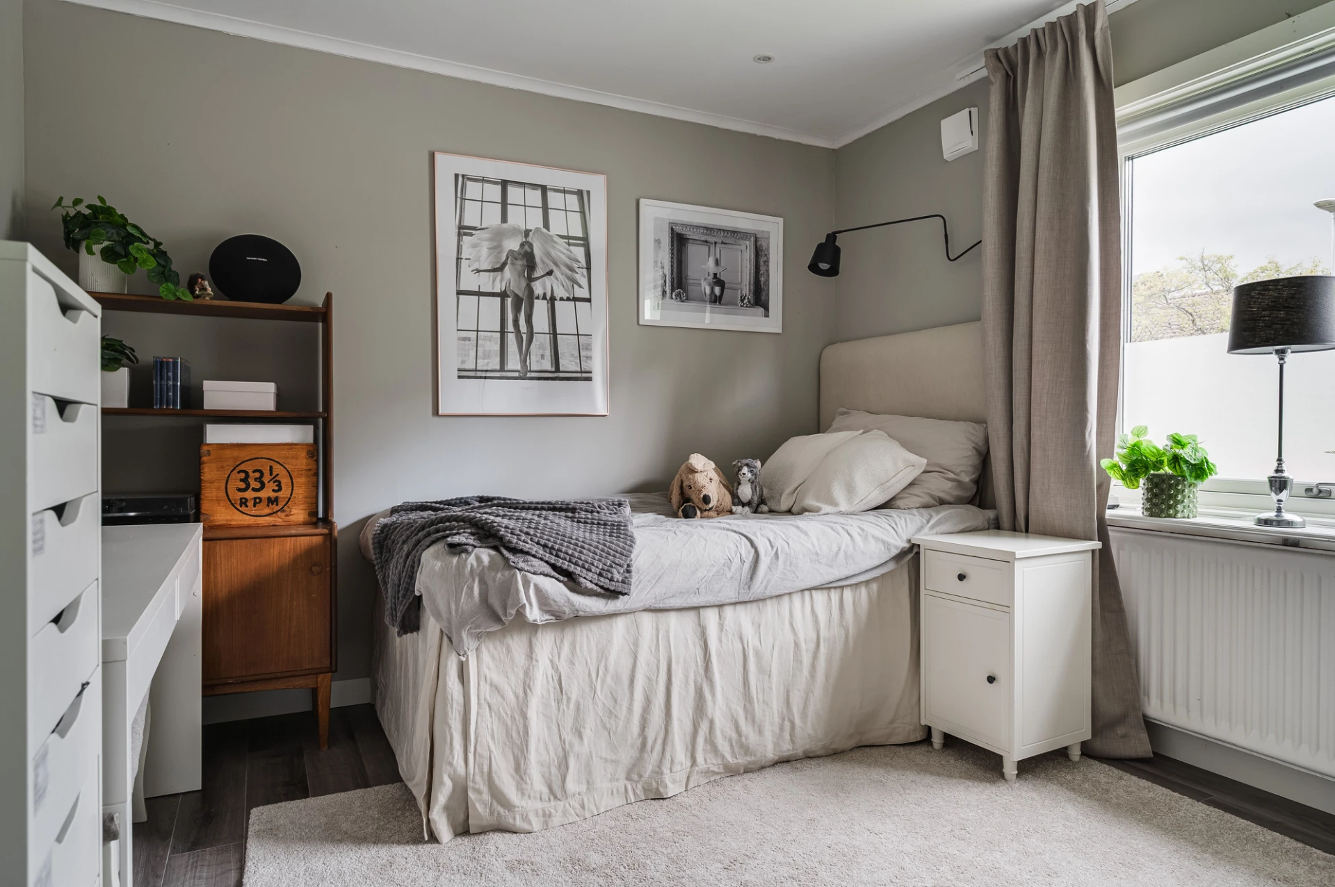 Allrum med ljusa väggar och mjuk heltäckningsmatta – perfekt som ungdomsrum, lekrum eller hobbyyta.