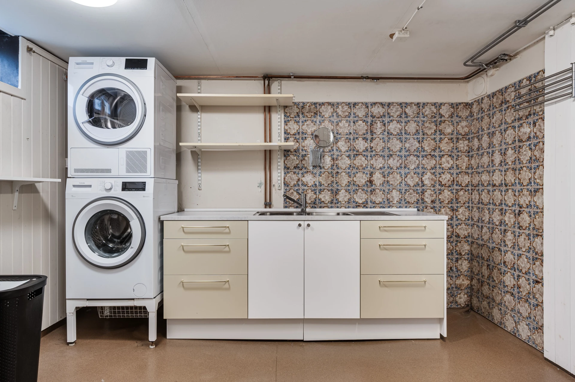 Tvättstuga med arbetsbänk, diskho, duschkabin, tvättmaskin och torktumlare. Praktisk plastmatta och ljus träpanel på väggarna.