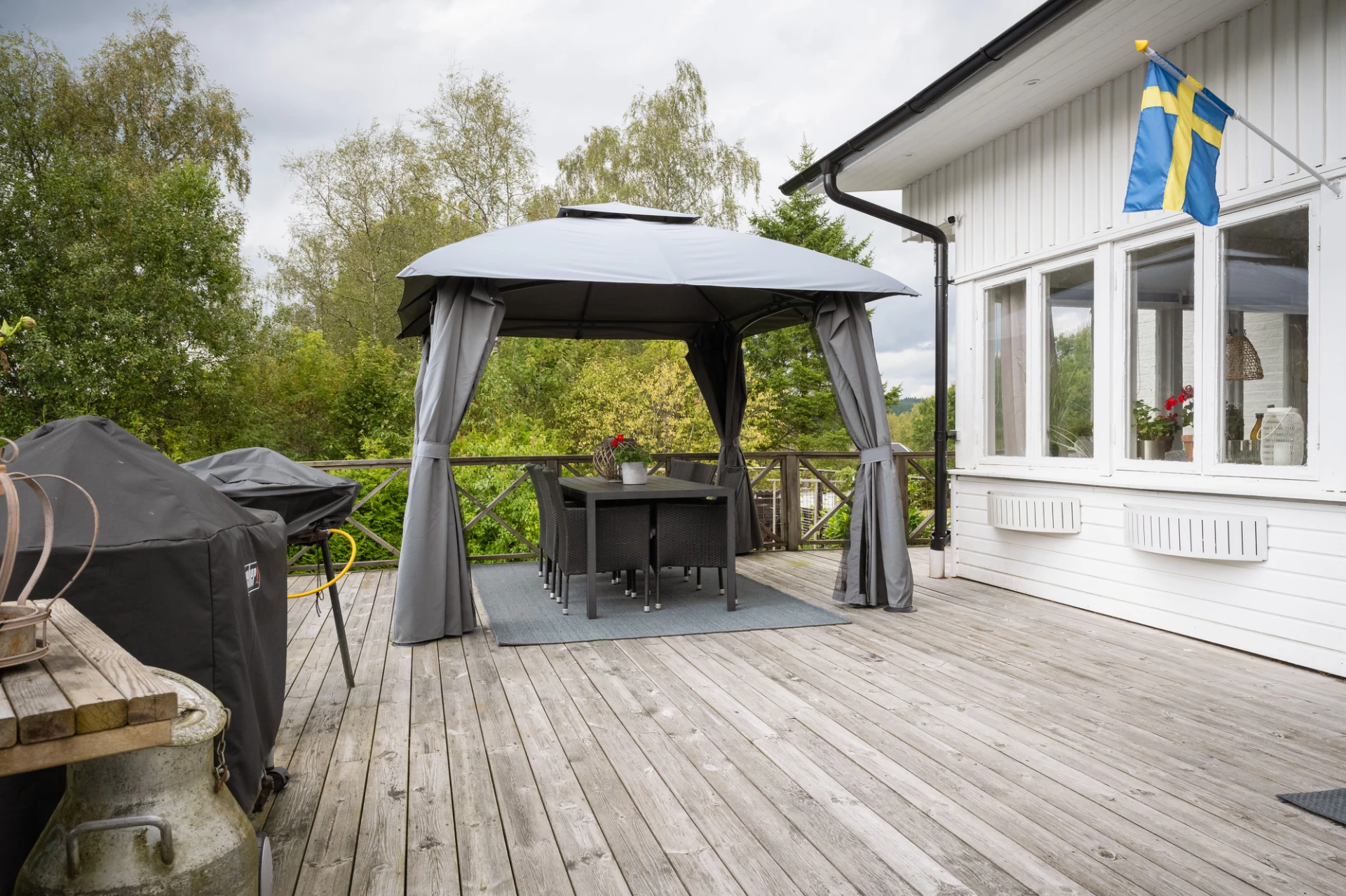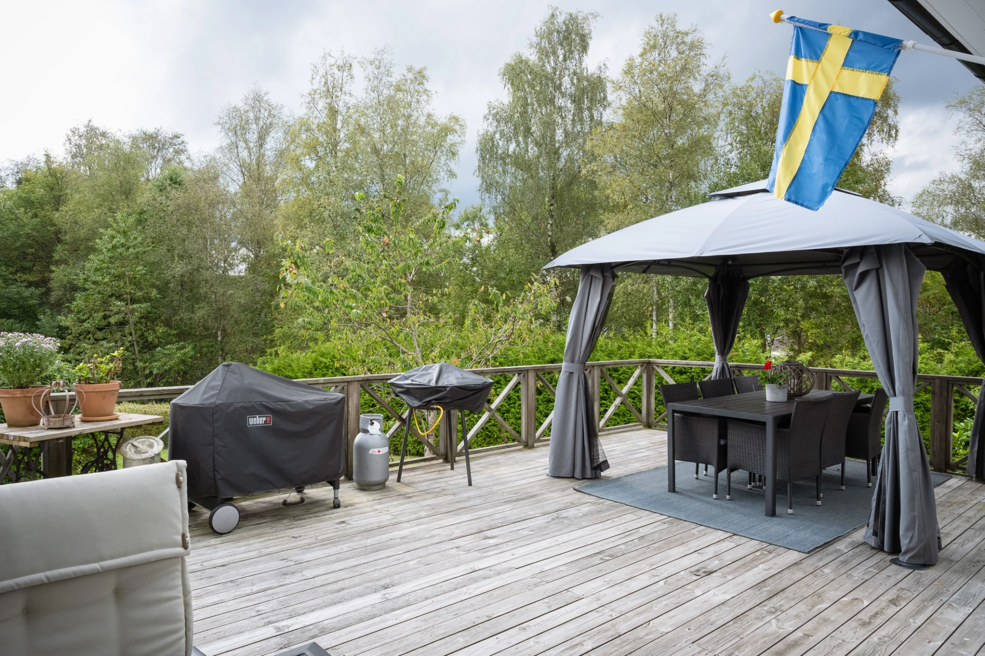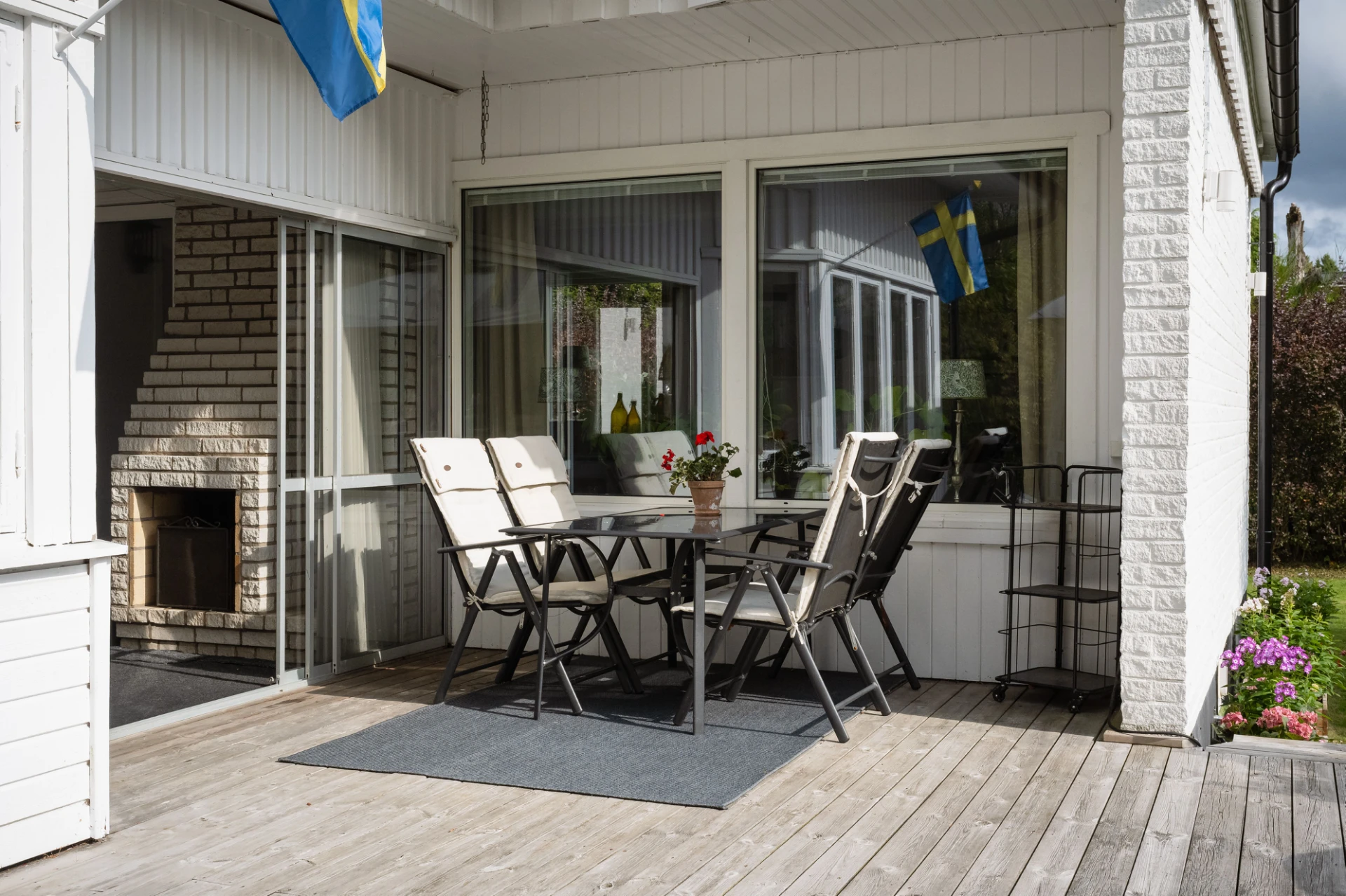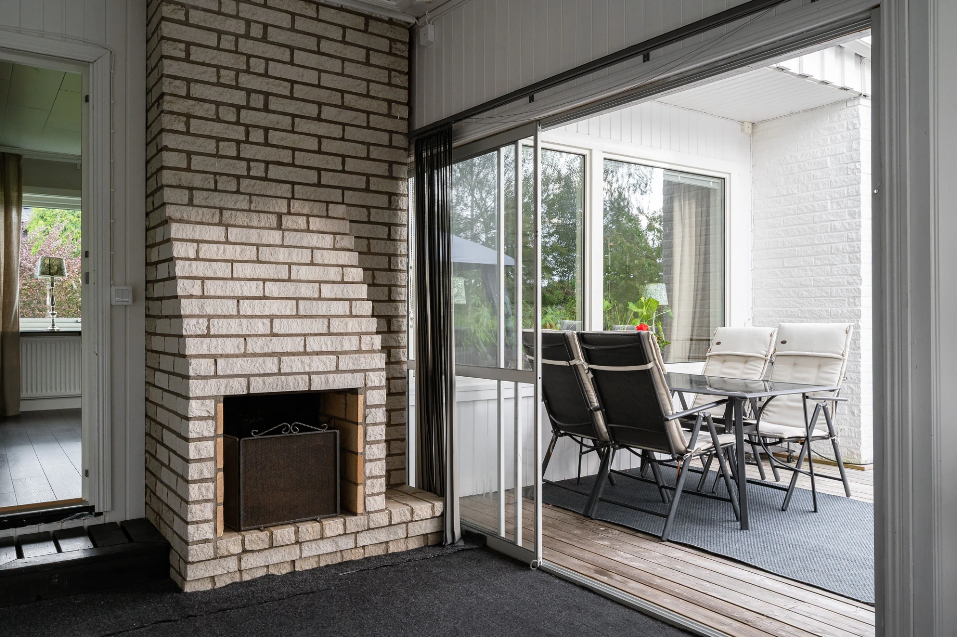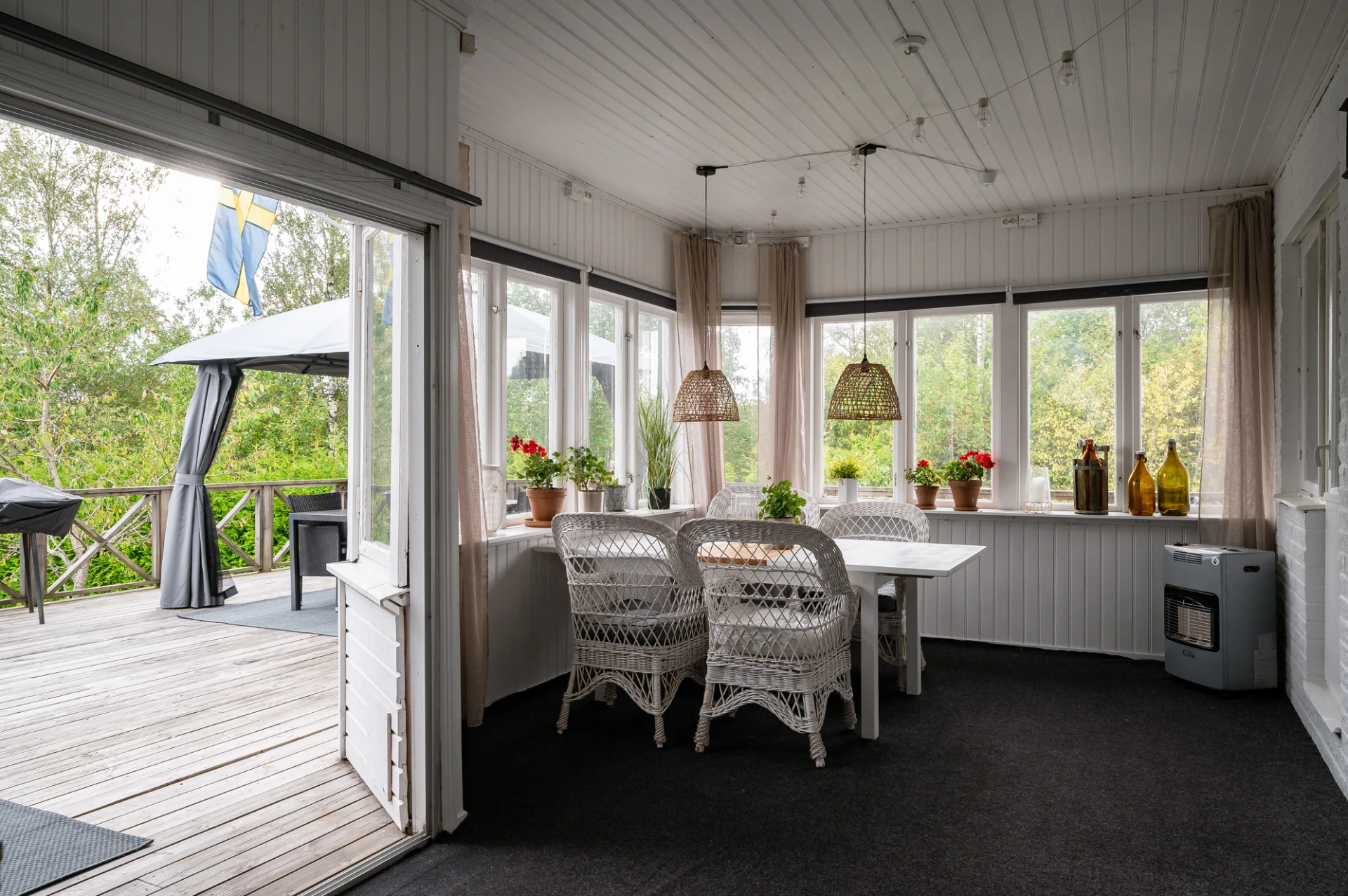 Uterum med gott om ljusinsläpp – en förlängning av vardagsrummet stora delar av året. Härifrån når du den generösa altanen med vacker utsikt över den insynsskyddade tomten. Den öppna spisen är ej i bruk.