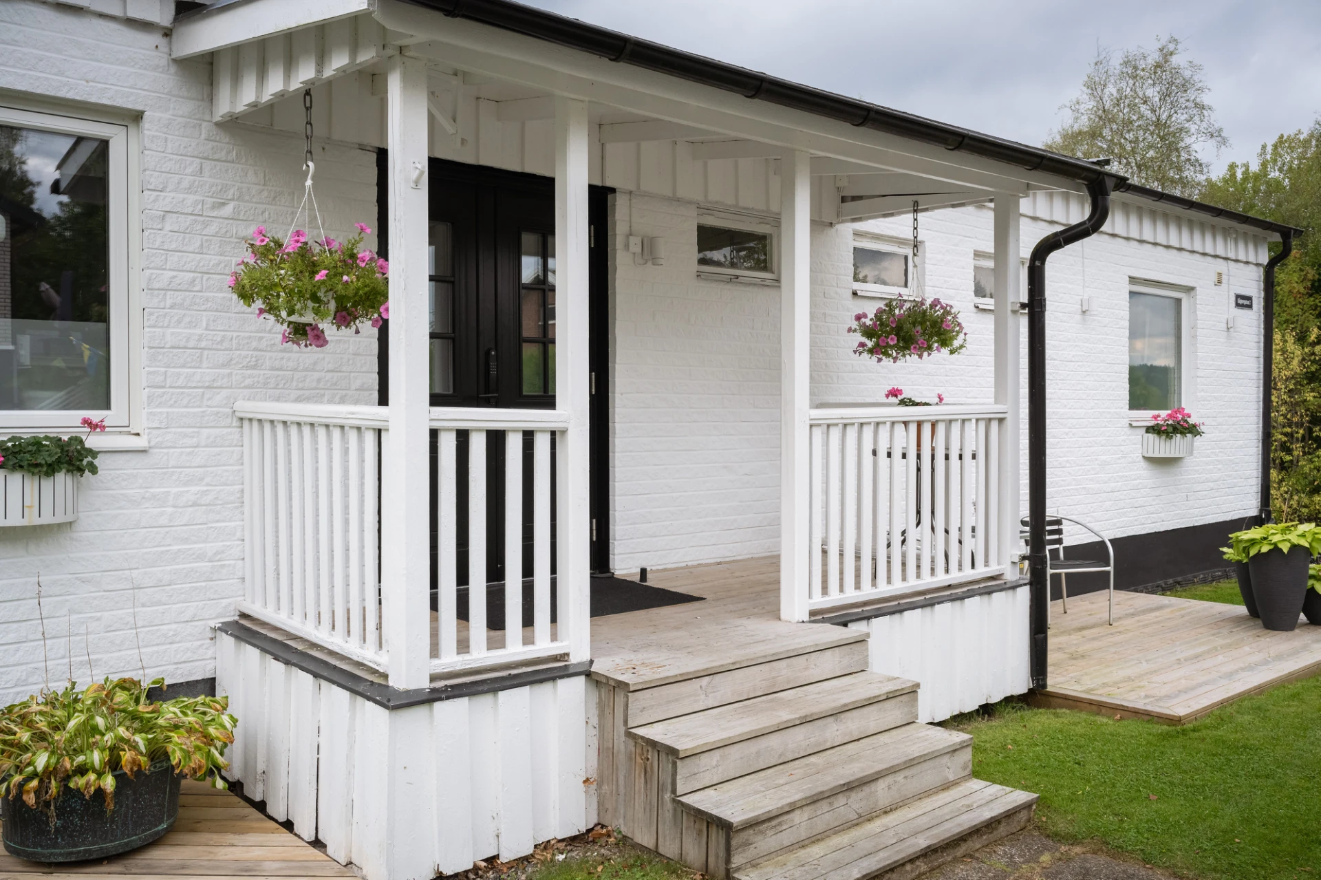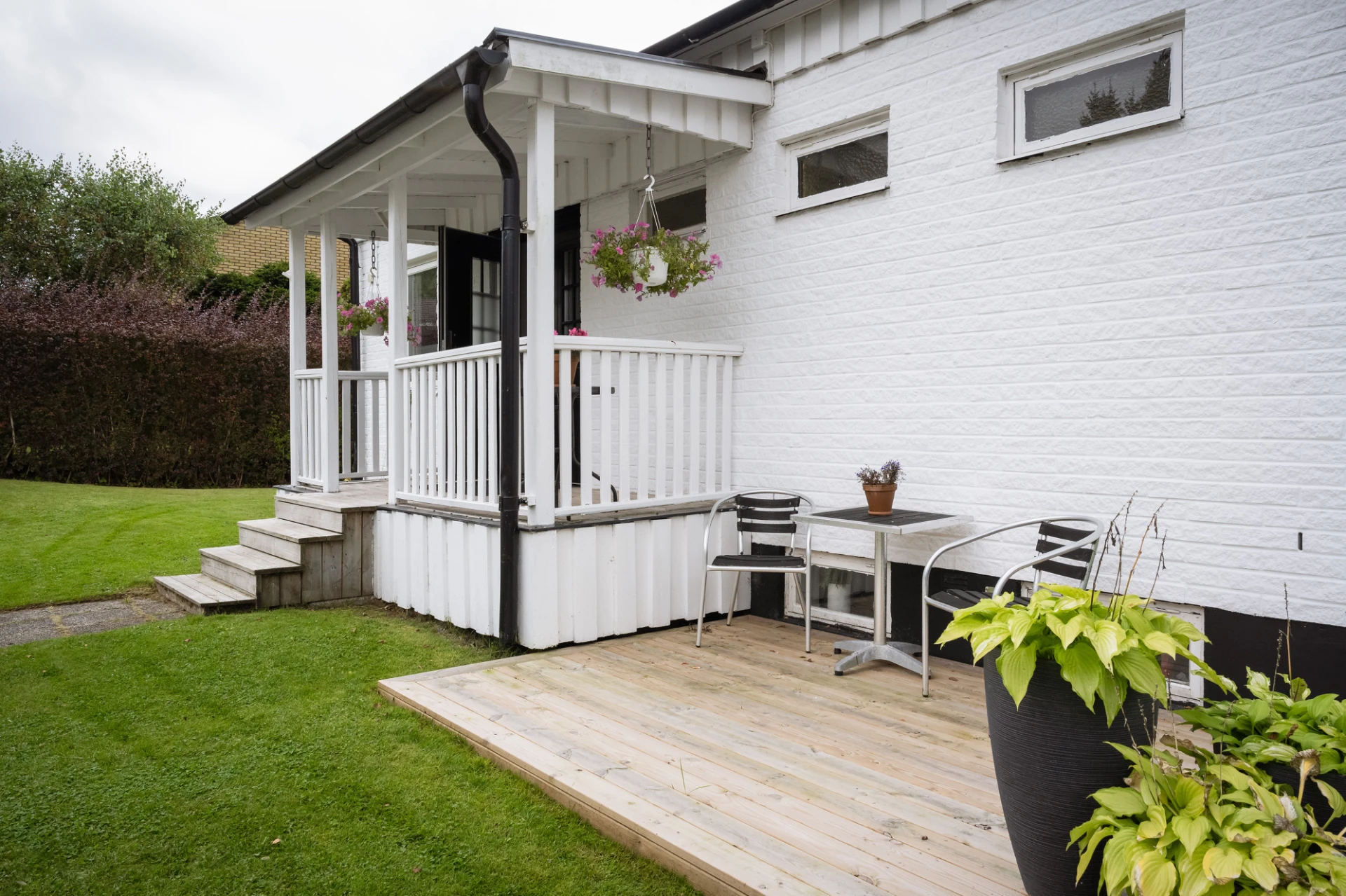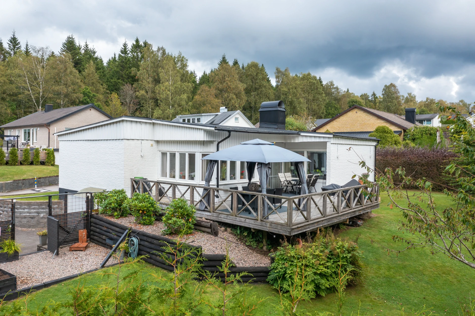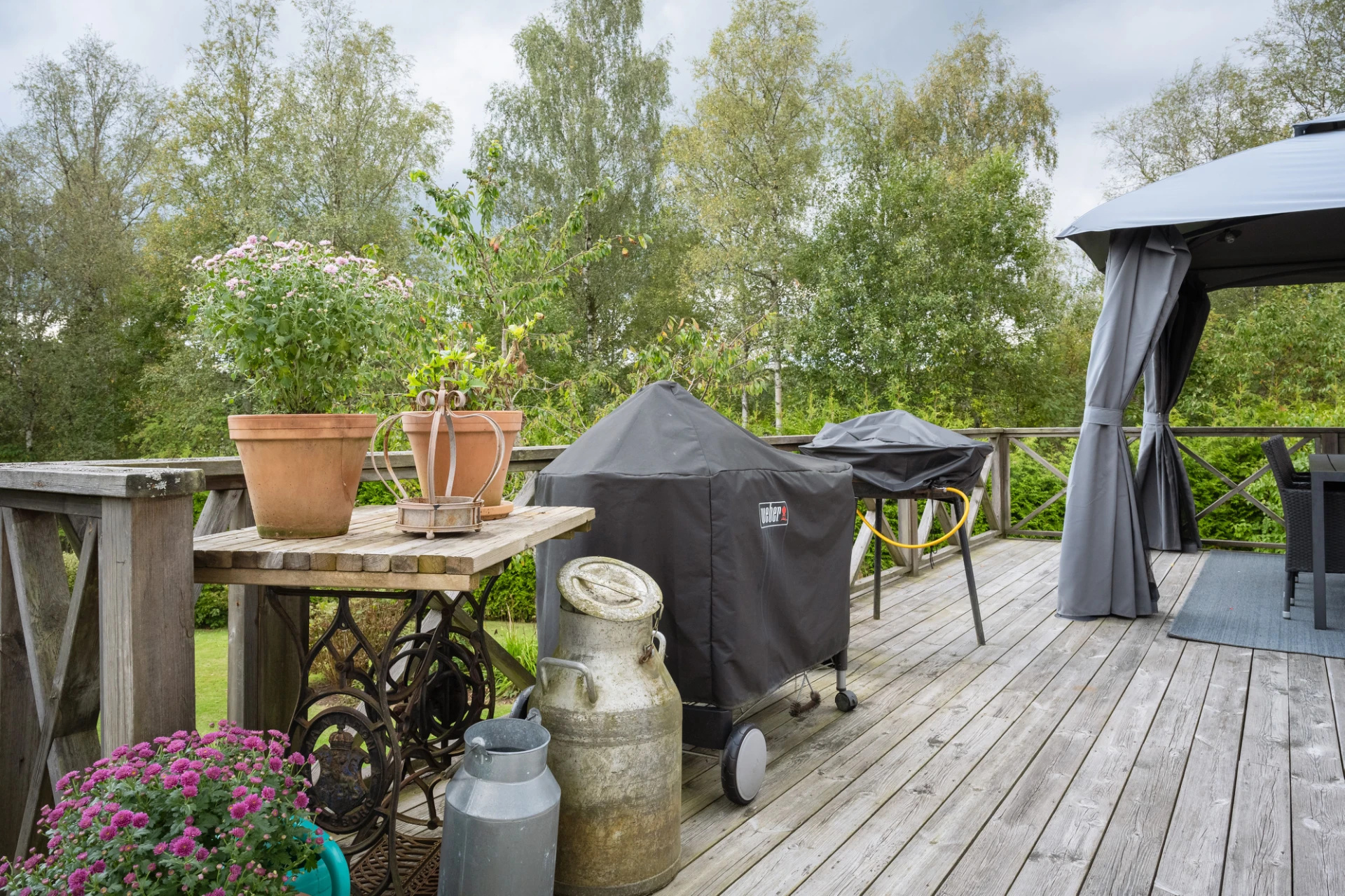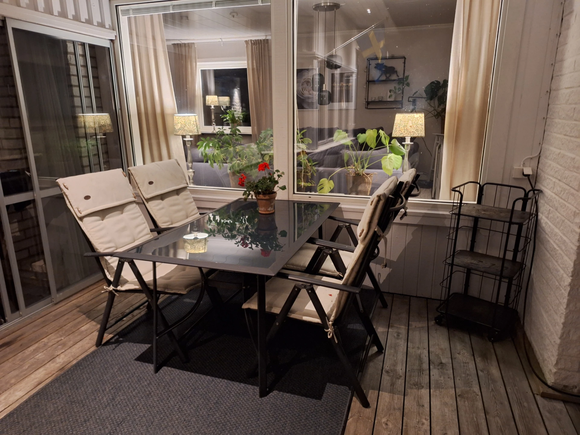 Uterum med gott om ljusinsläpp – en förlängning av vardagsrummet stora delar av året. Härifrån når du den generösa altanen med vacker utsikt över den insynsskyddade tomten. Den öppna spisen är ej i bruk.