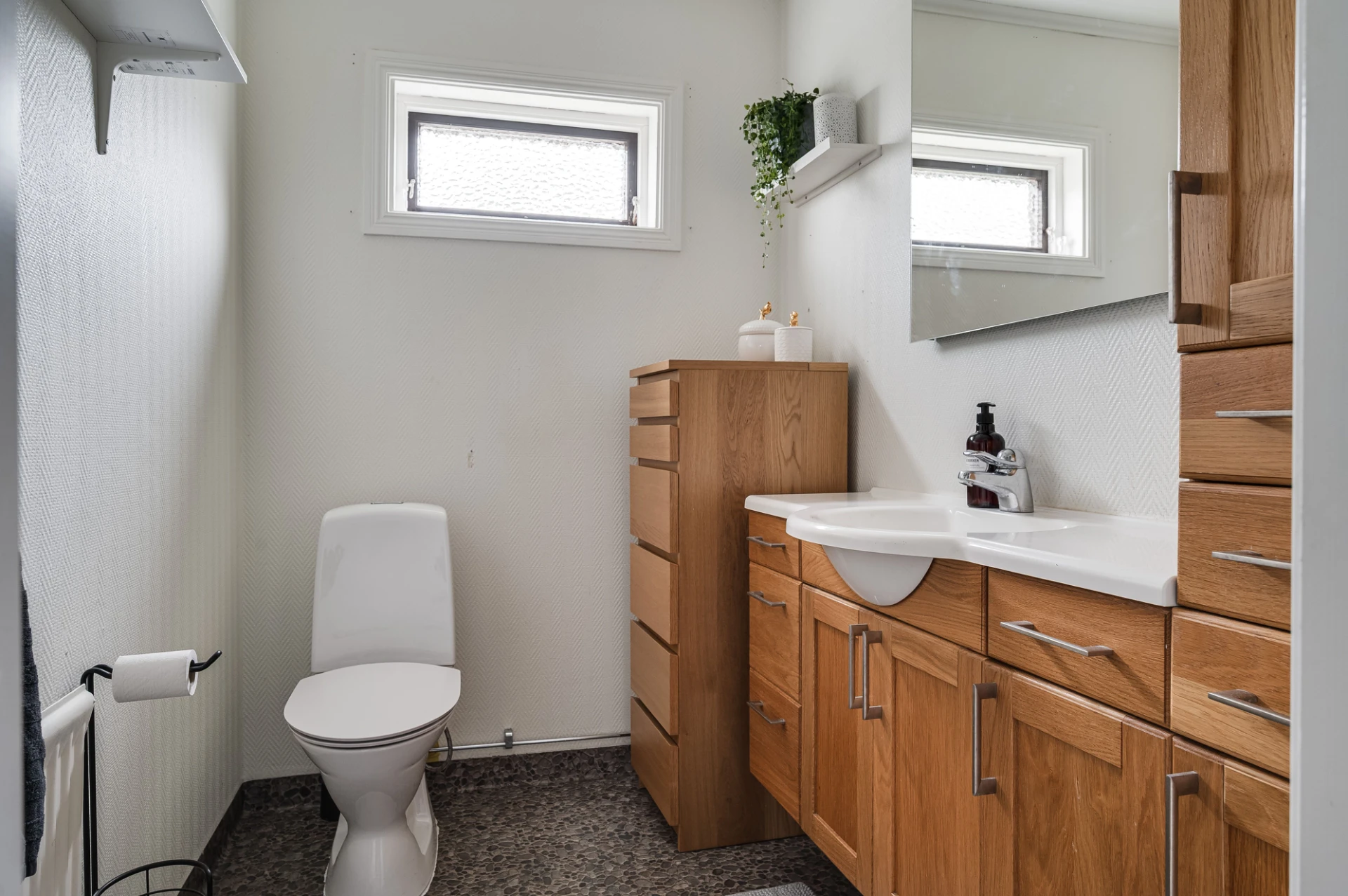 Toalett med stenliknande plastmatta och ljusa väggar – funktionellt och stilrent.