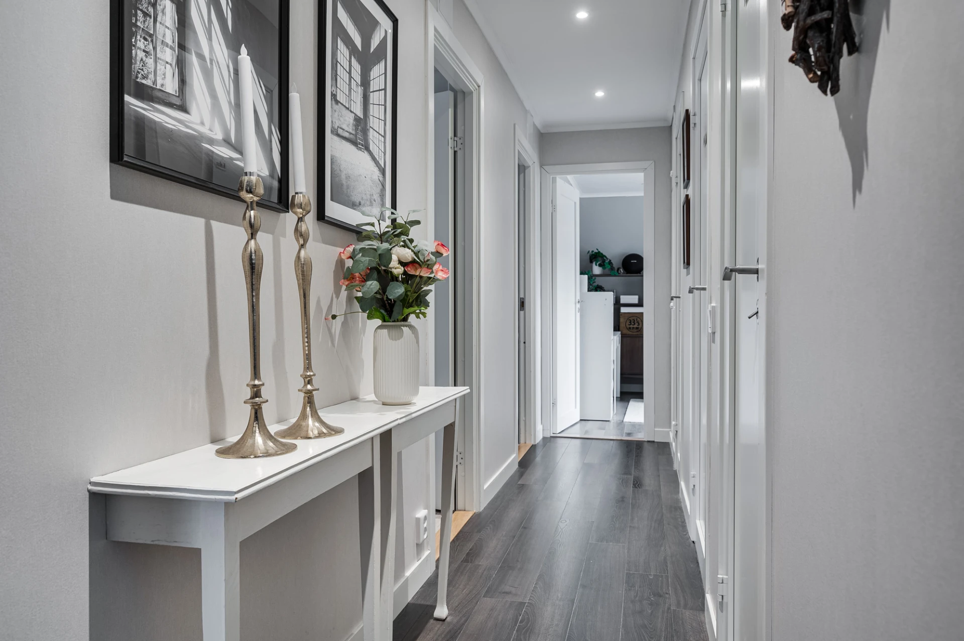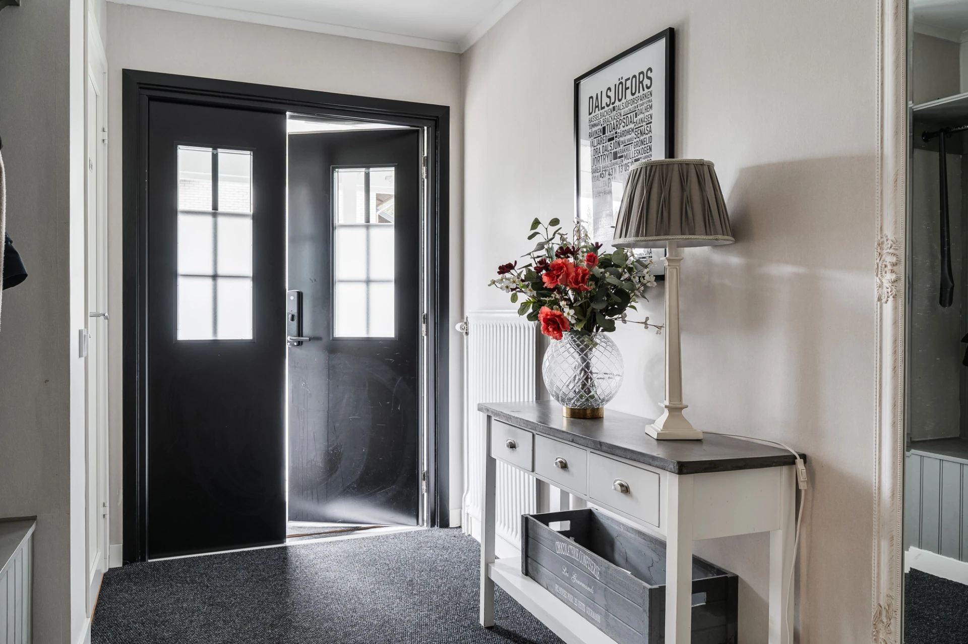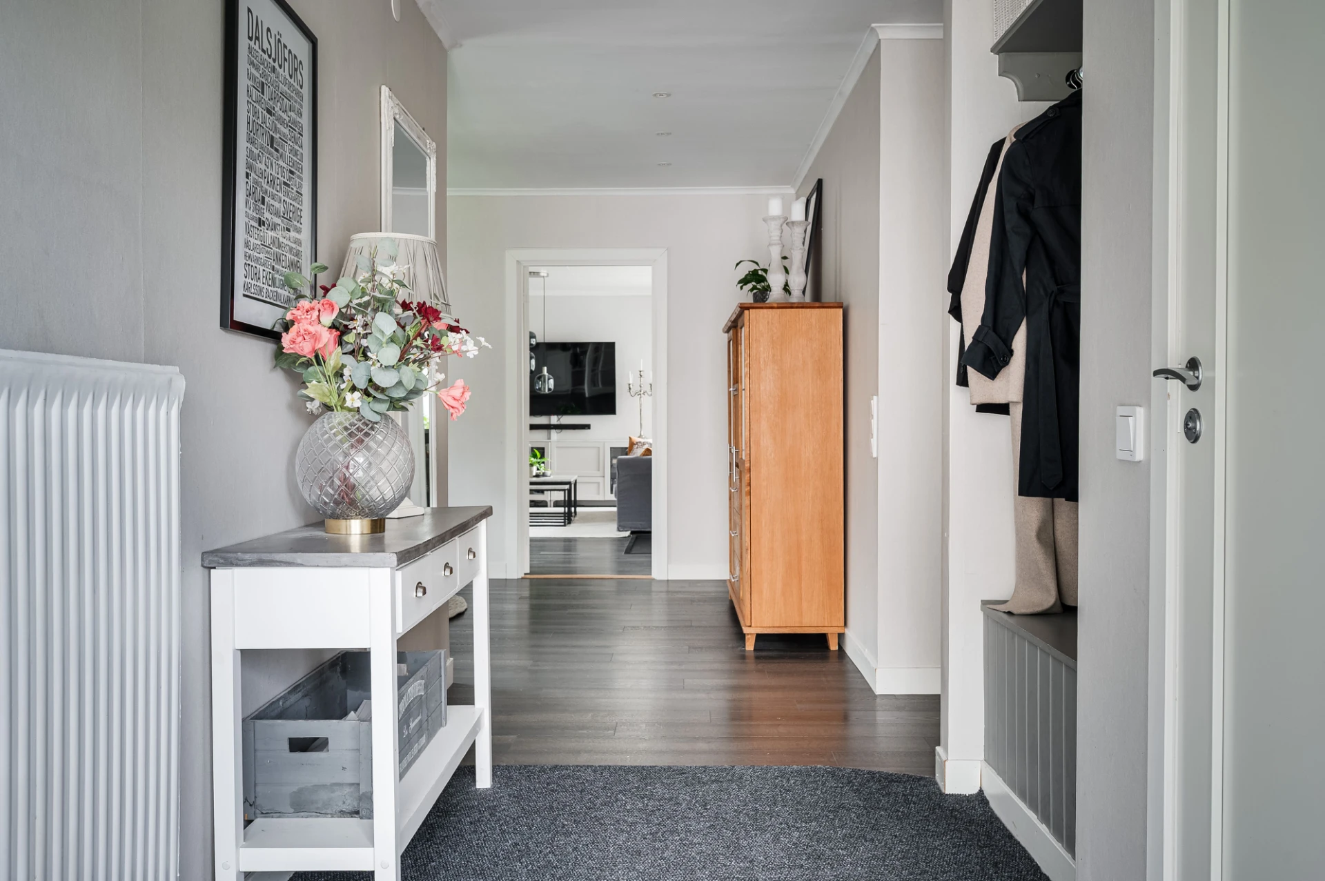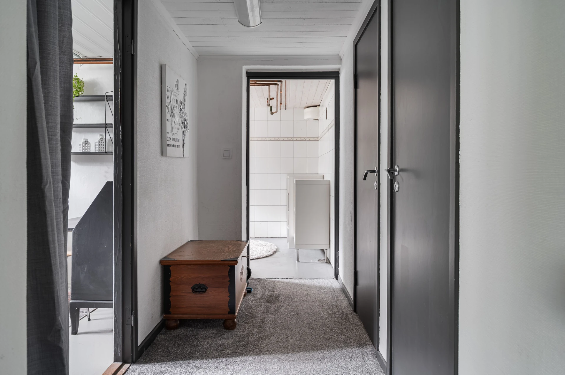 Inre hall med mörkare golv och tillgång till ytterligare förråd.