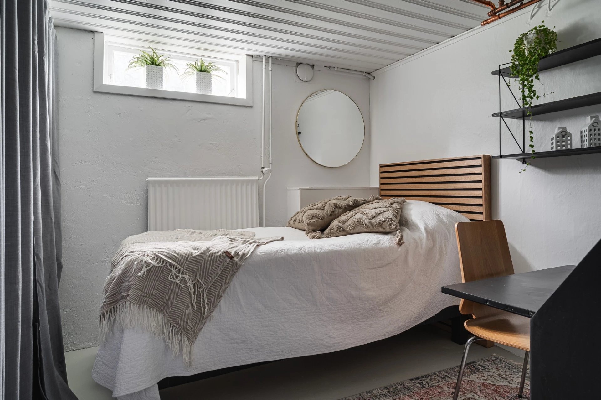 Extra rum med ljusa väggar och målat betonggolv, används idag som sovrum eller gästrum.