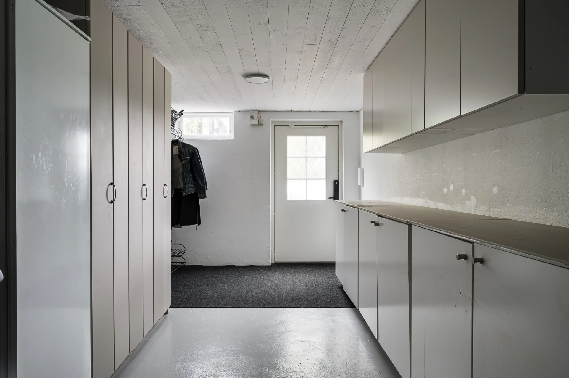 Groventré med mycket förvaring, ljusa väggar och målat golv – idealisk som entré från trädgården eller garage.