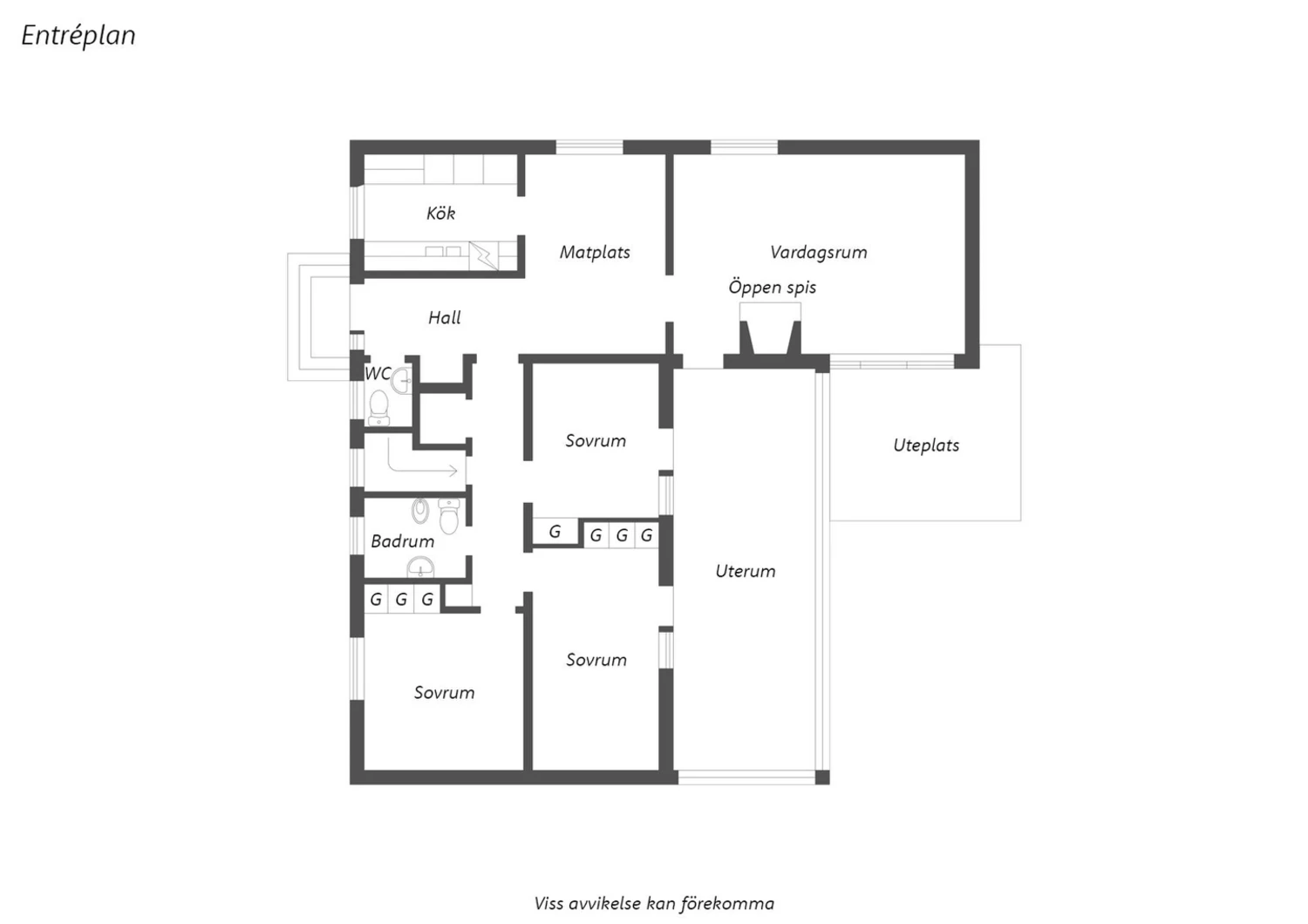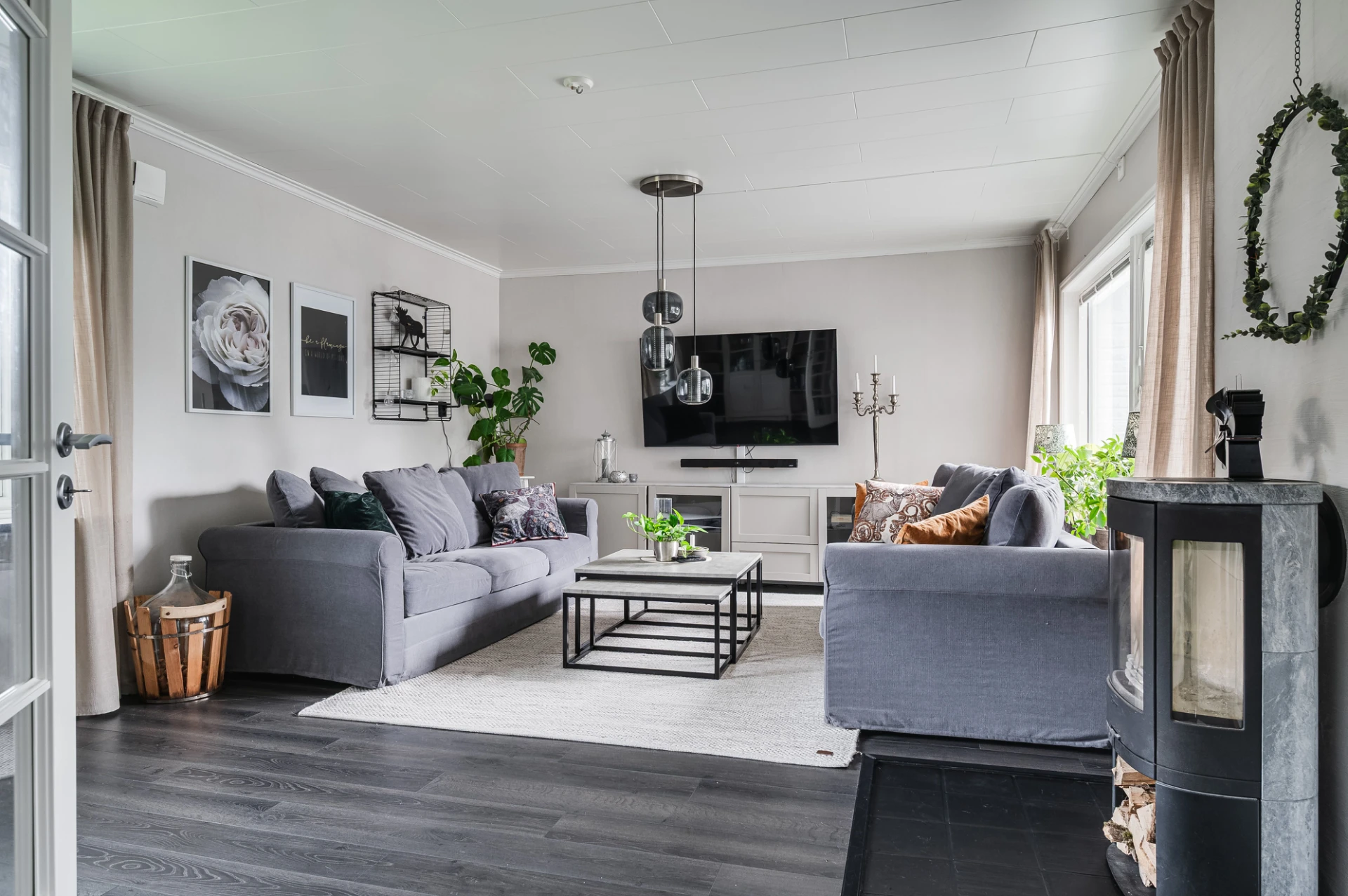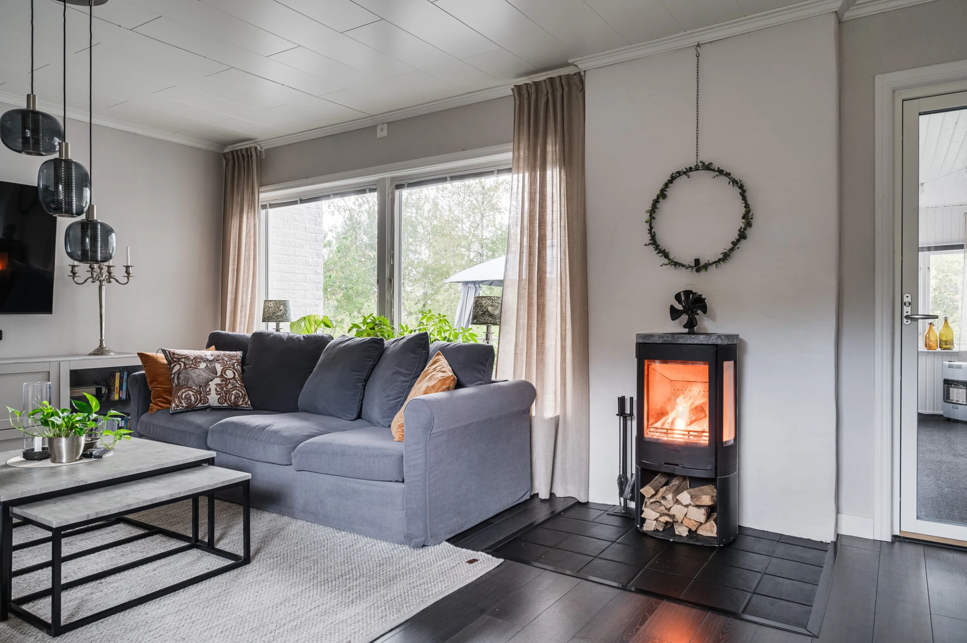 Vardagsrum med mörkare golv, ljusa väggar och fönster i två väderstreck som ger fint ljusinsläpp. Här finns en täljstenskamin som skapar extra trivsel och värme. Utgång till det stora uterummet.