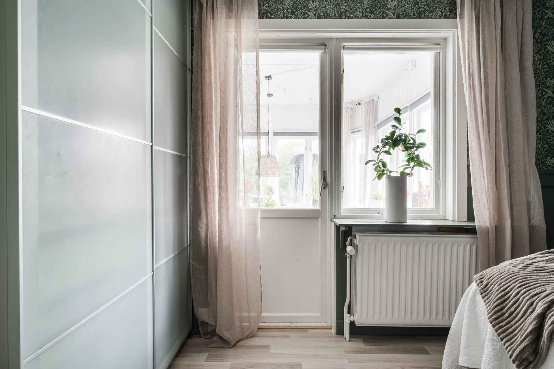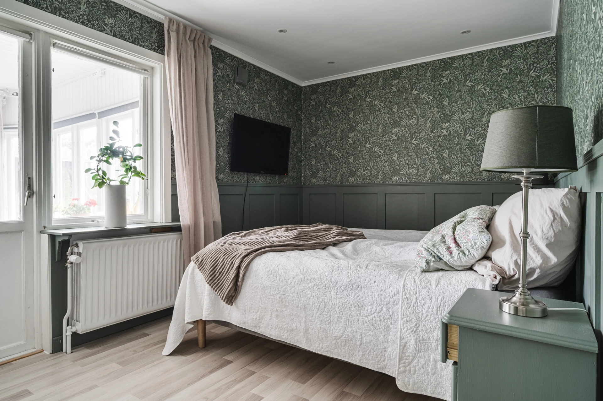 Sovrum 2 – Laminatgolv, grön bröstpanel med matchande tapet, 2 garderober och spotlights. Utgång till uterummet.