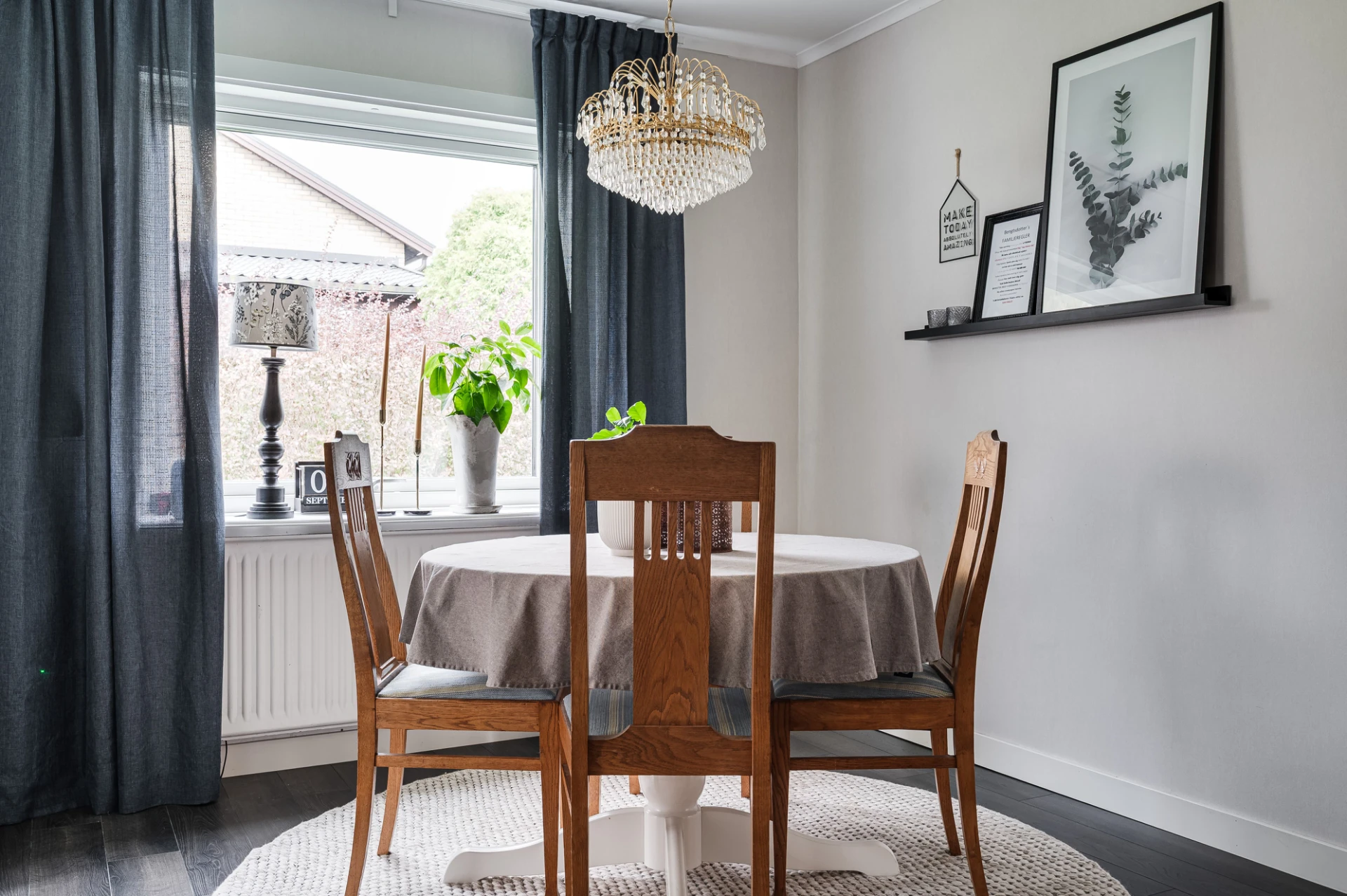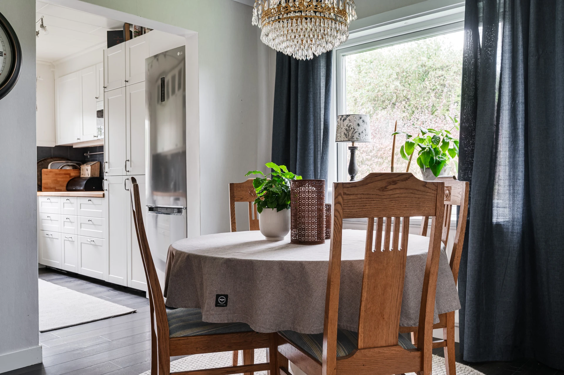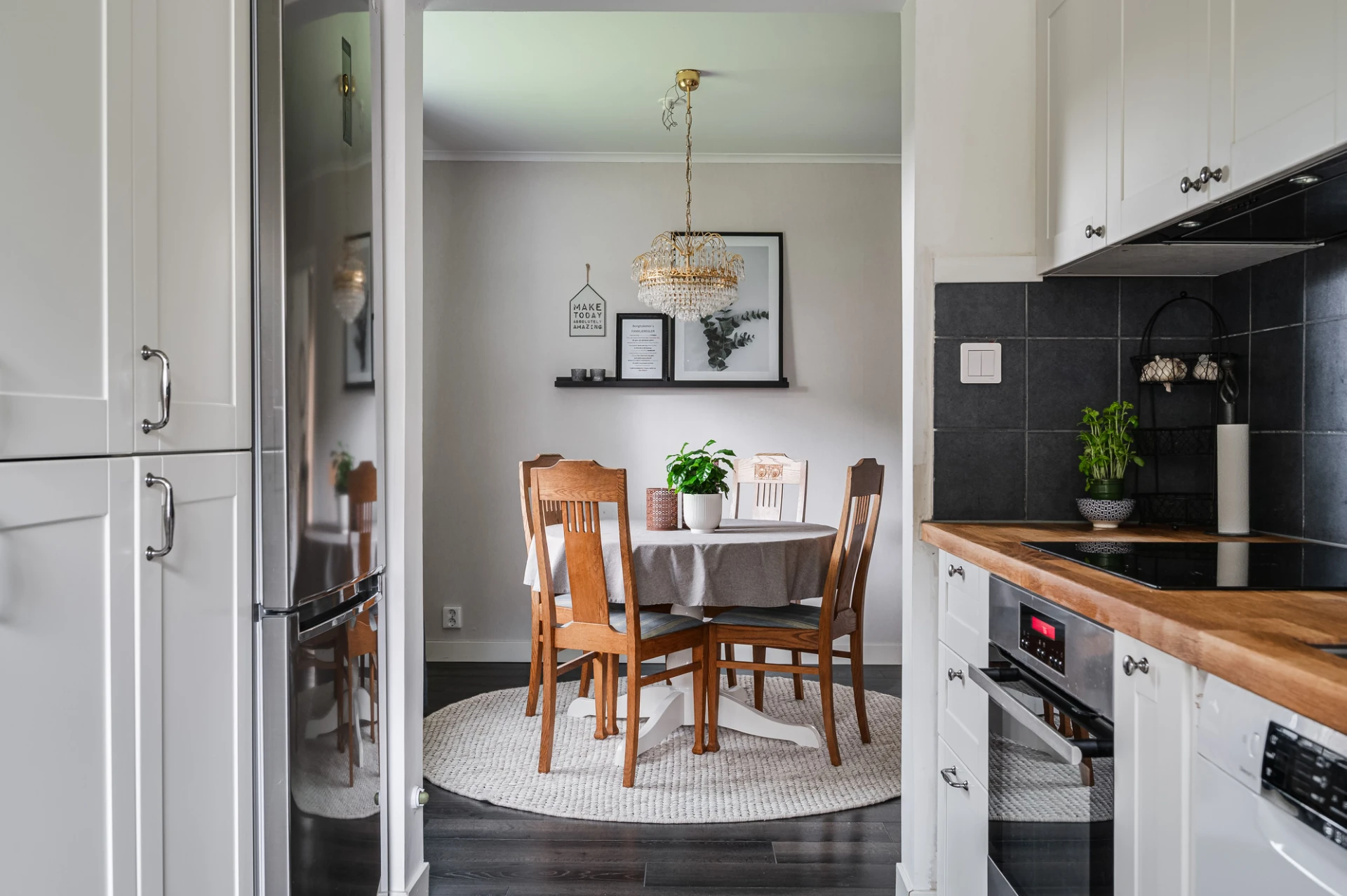 Matplats med mörkare golv, ljusa väggar och infällda spotlights – en inbjudande plats för middagar och umgänge.