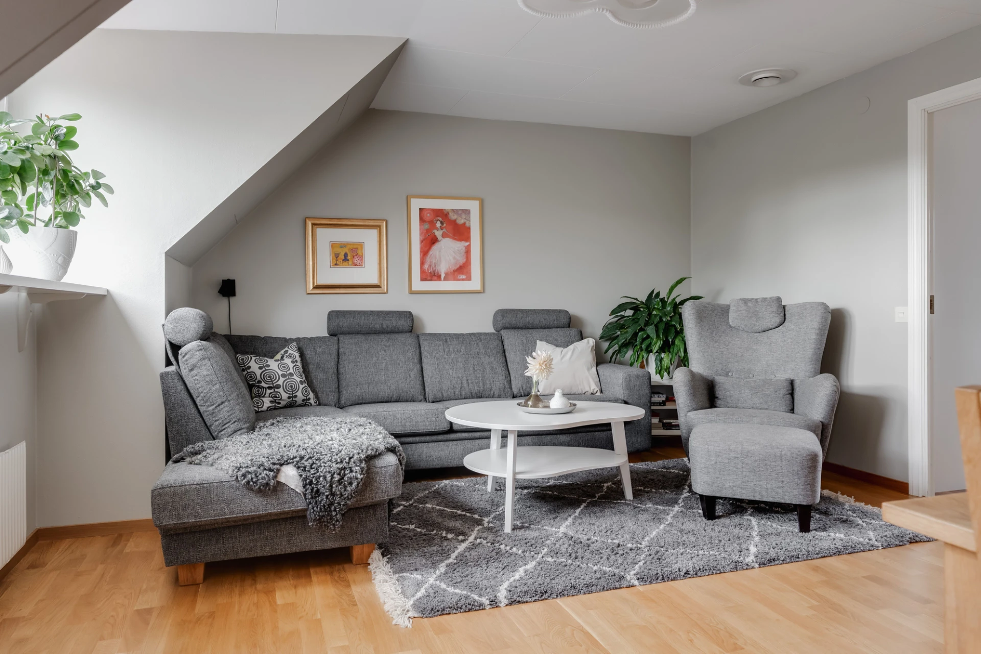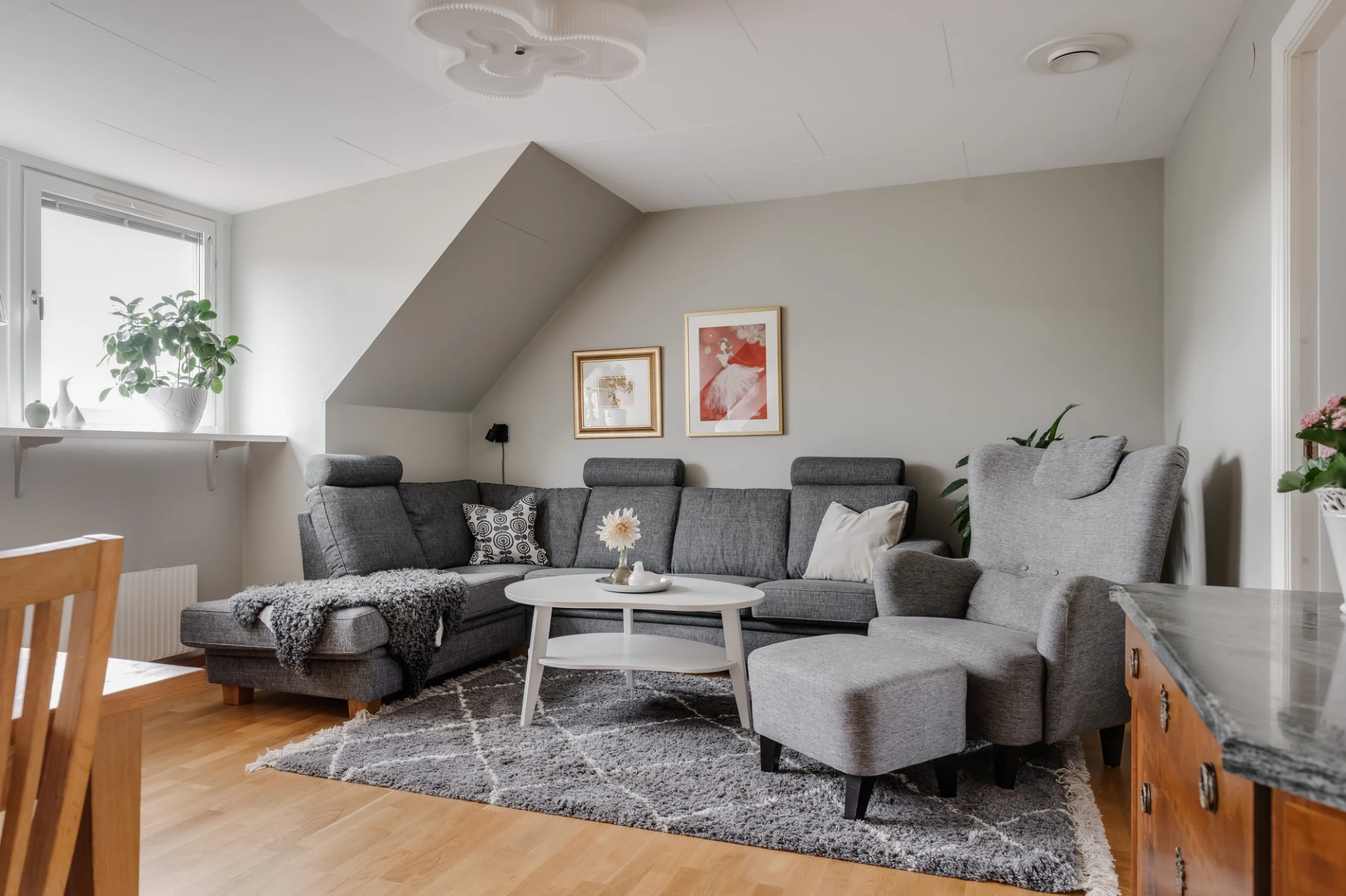 Vardagsrummet beläget i öppen planlösning mot matplats. Härifrån får du en trevlig överblick över bostaden. Här finns plats åt en större soffa med tillhörande möblemang.
