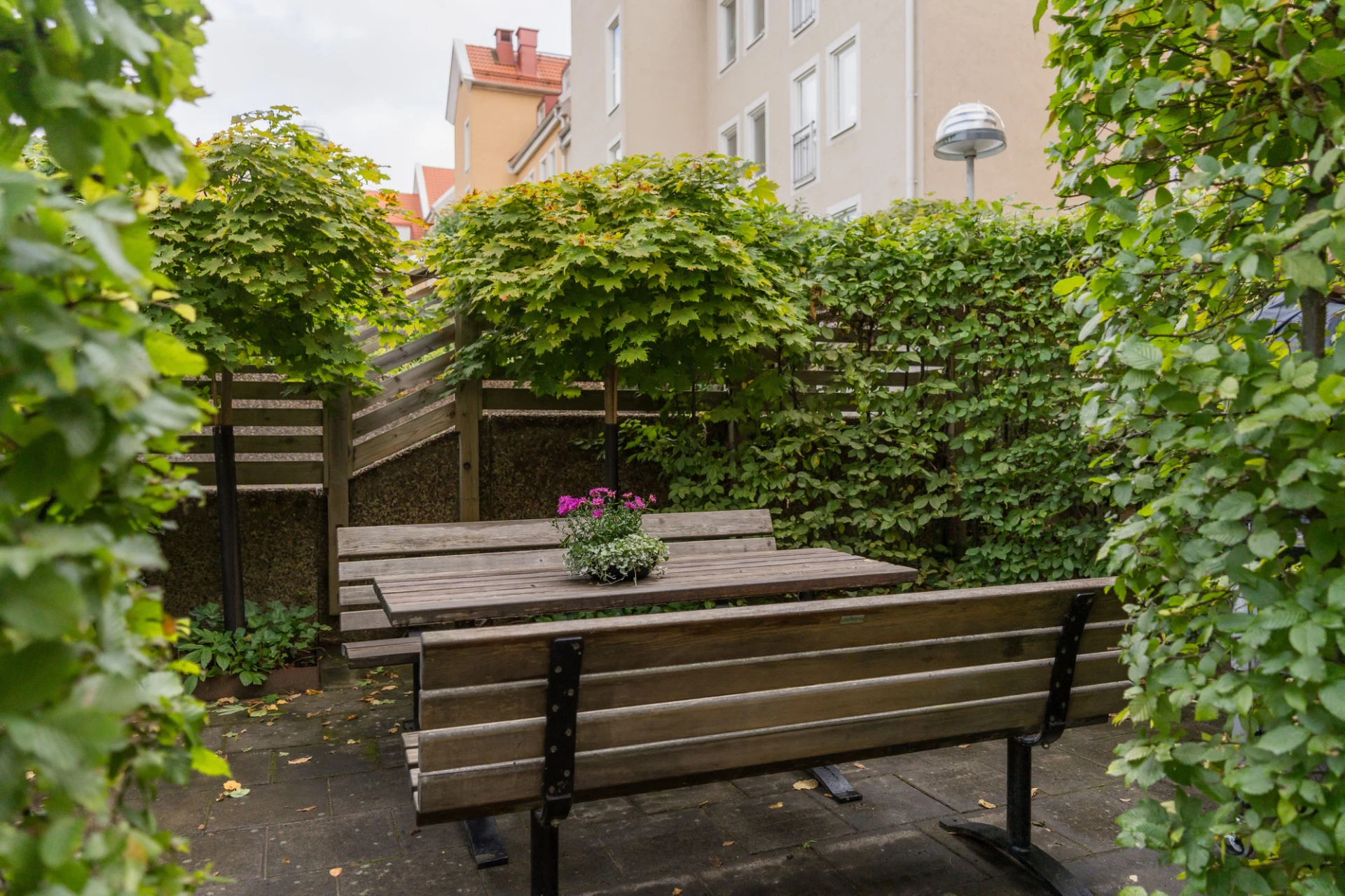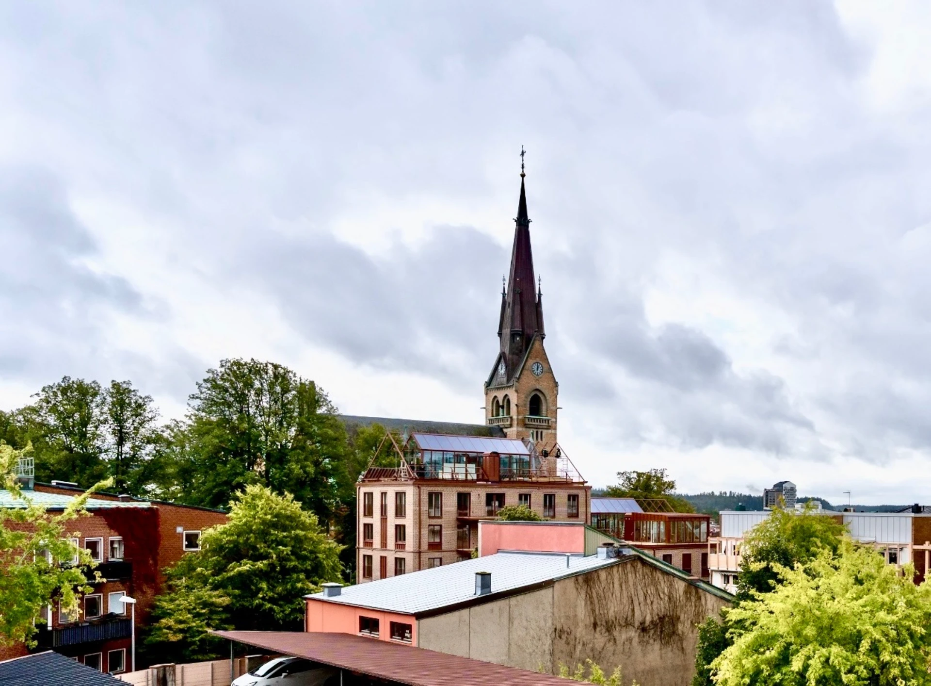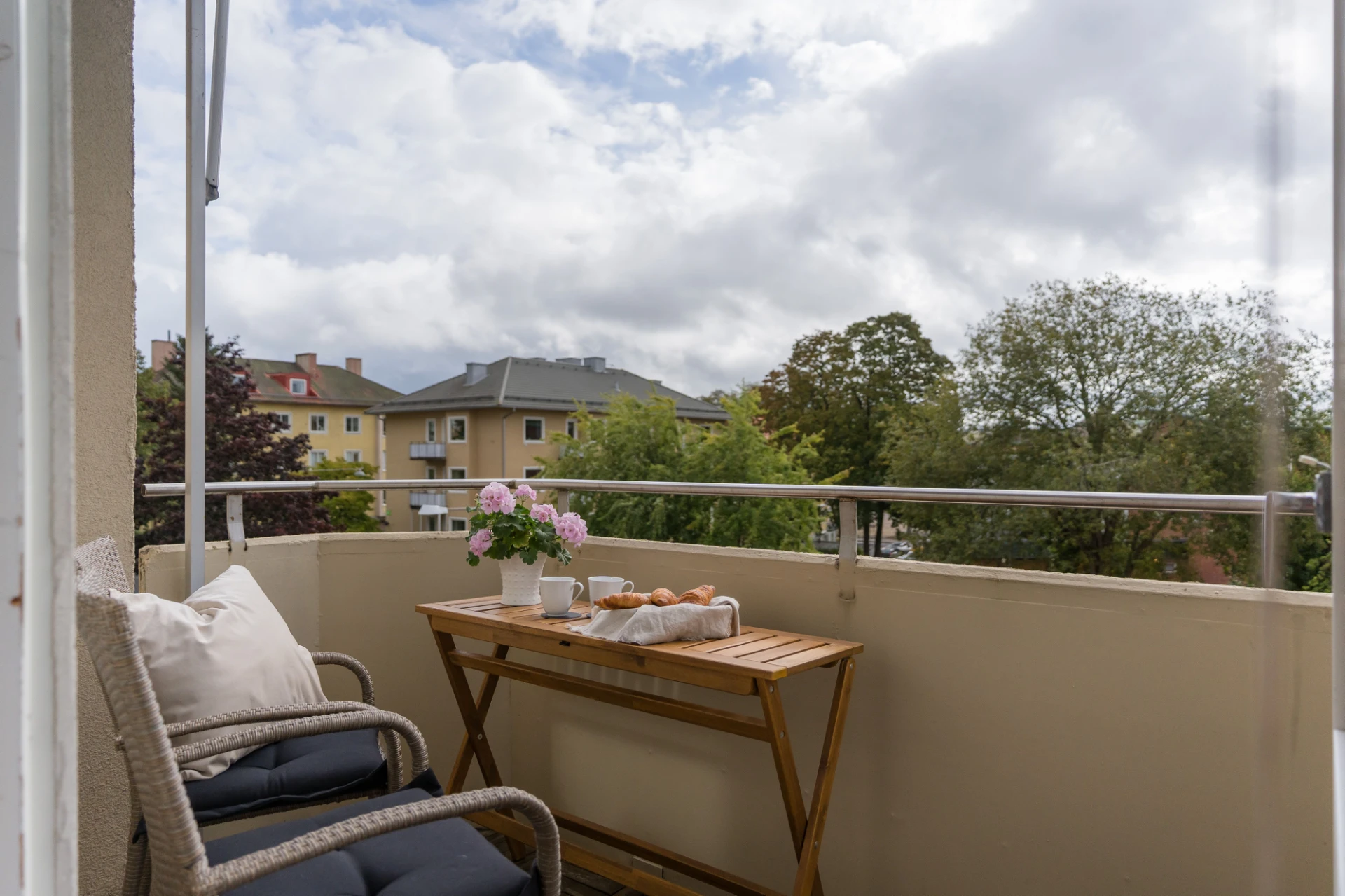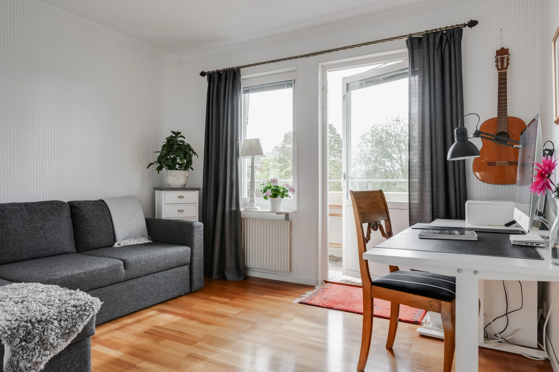 Bostadens mindre sovrum är idag inrett med bäddsoffa och skrivbord. Härifrån når ni balkongen som vetter åt söder vilket ger sol större delen av dagen. Högt och trevligt läge med utsikt både åt Gustav Adolfs Kyrka samt in mot stan.