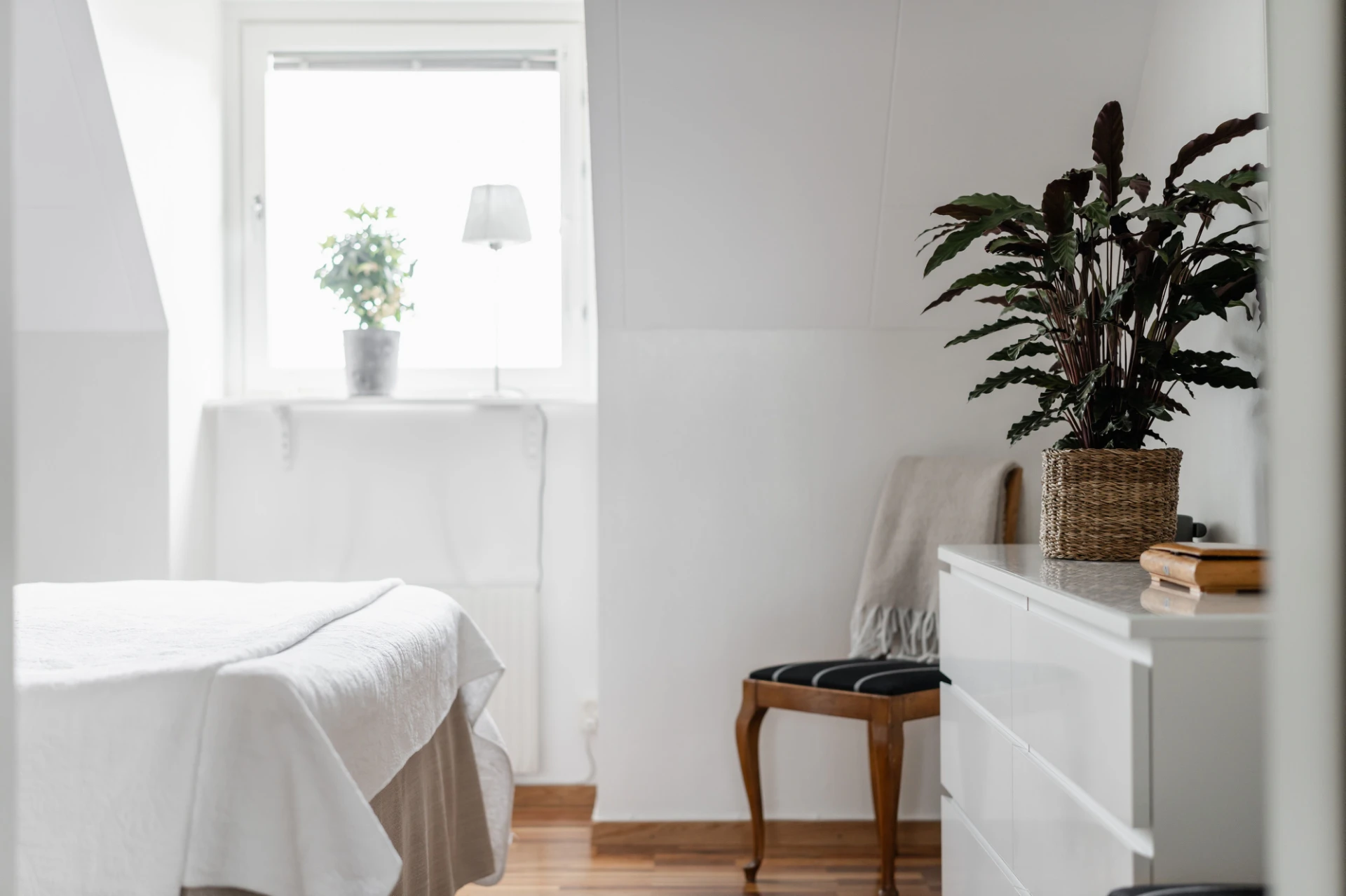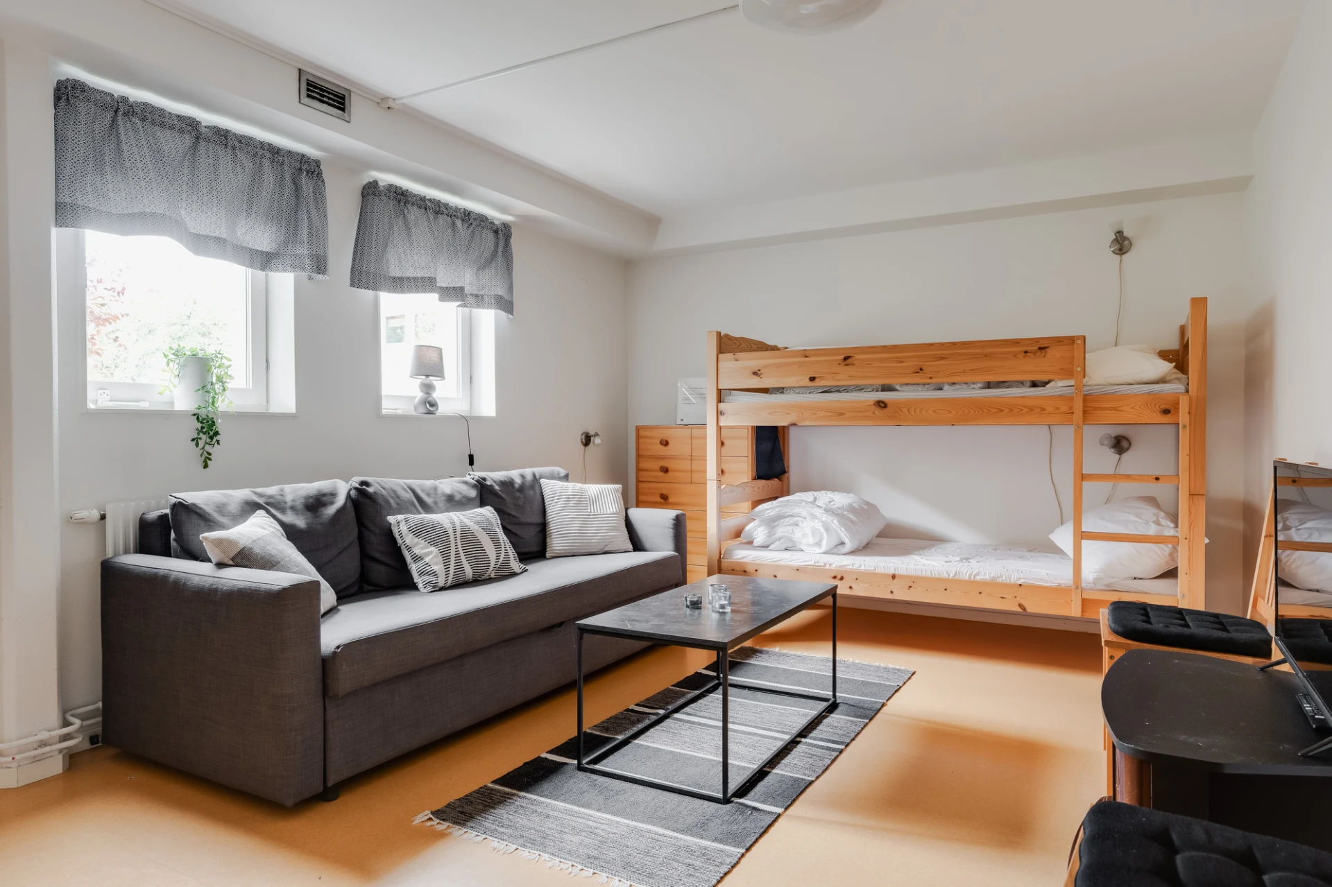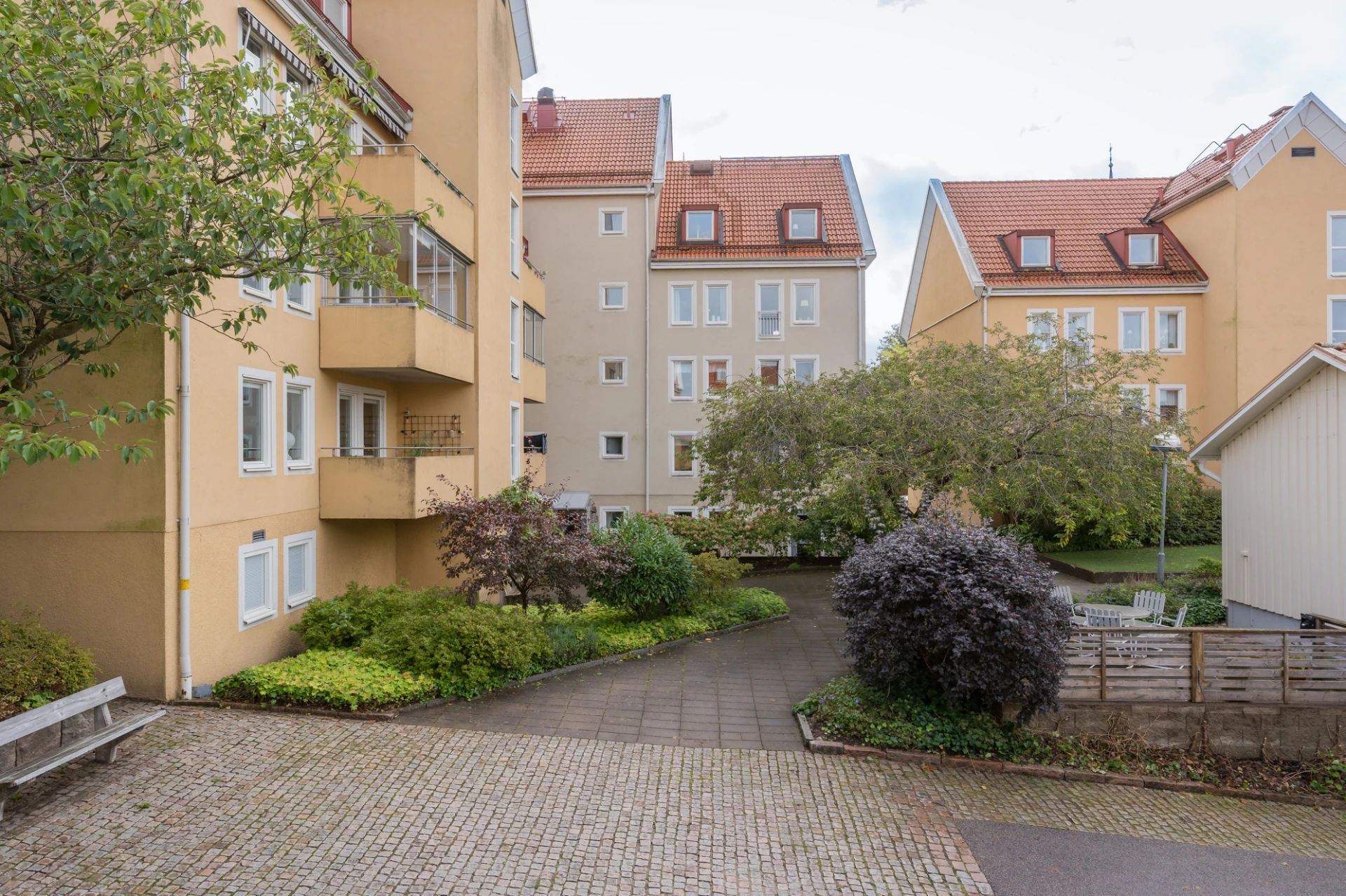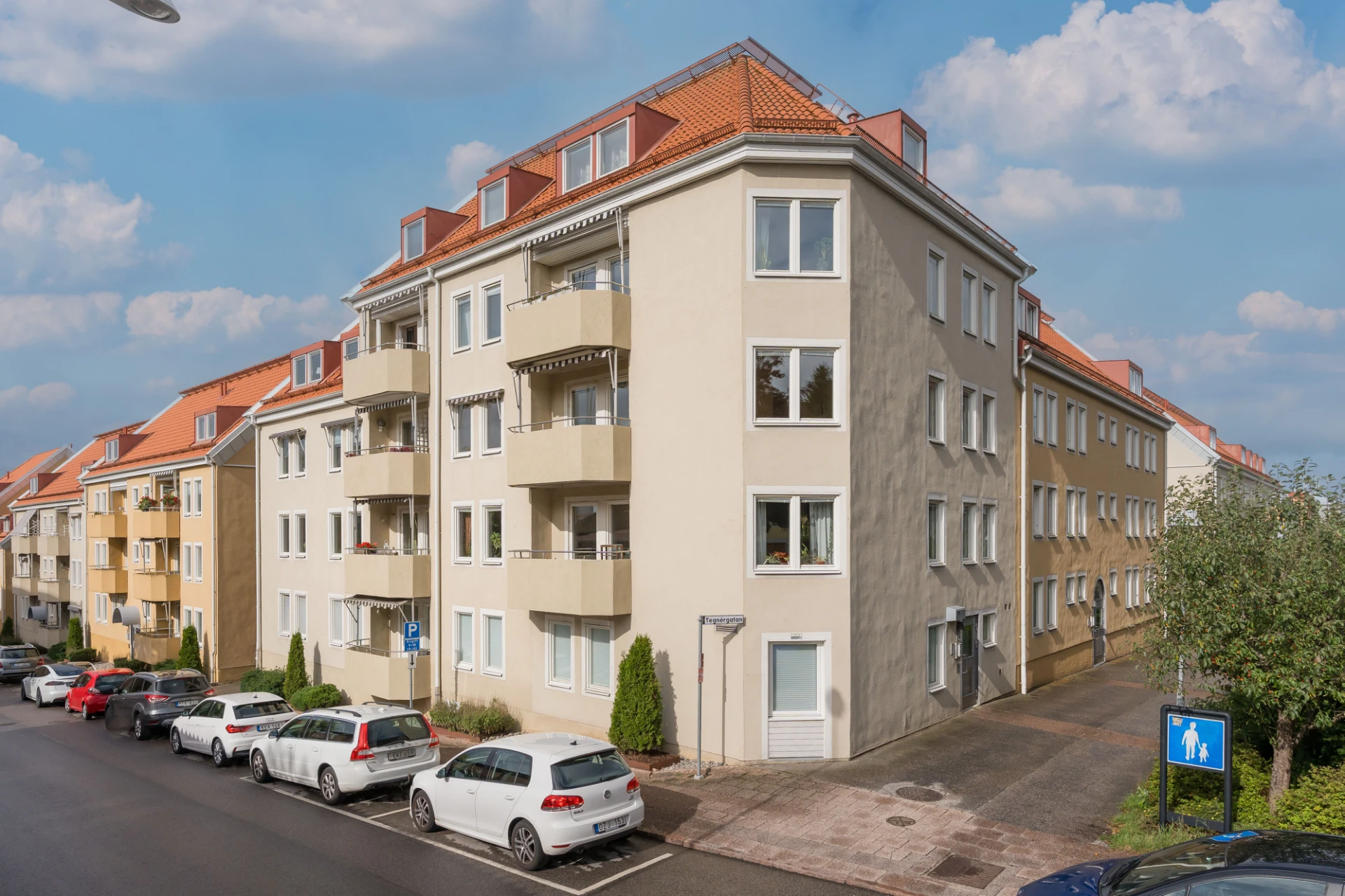 Bostadens mindre sovrum är idag inrett med bäddsoffa och skrivbord. Härifrån når ni balkongen som vetter åt söder vilket ger sol större delen av dagen. Högt och trevligt läge med utsikt både åt Gustav Adolfs Kyrka samt in mot stan.