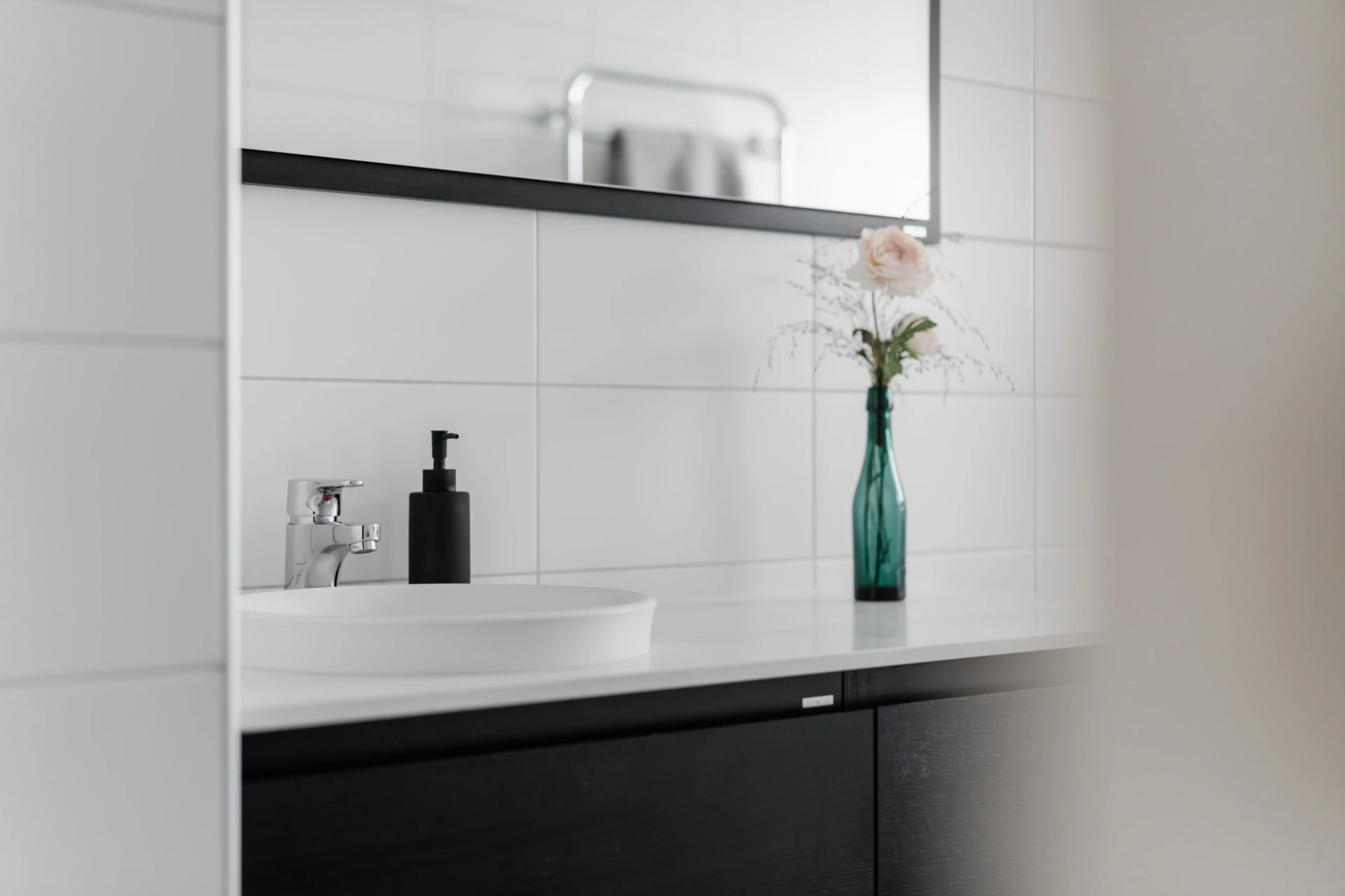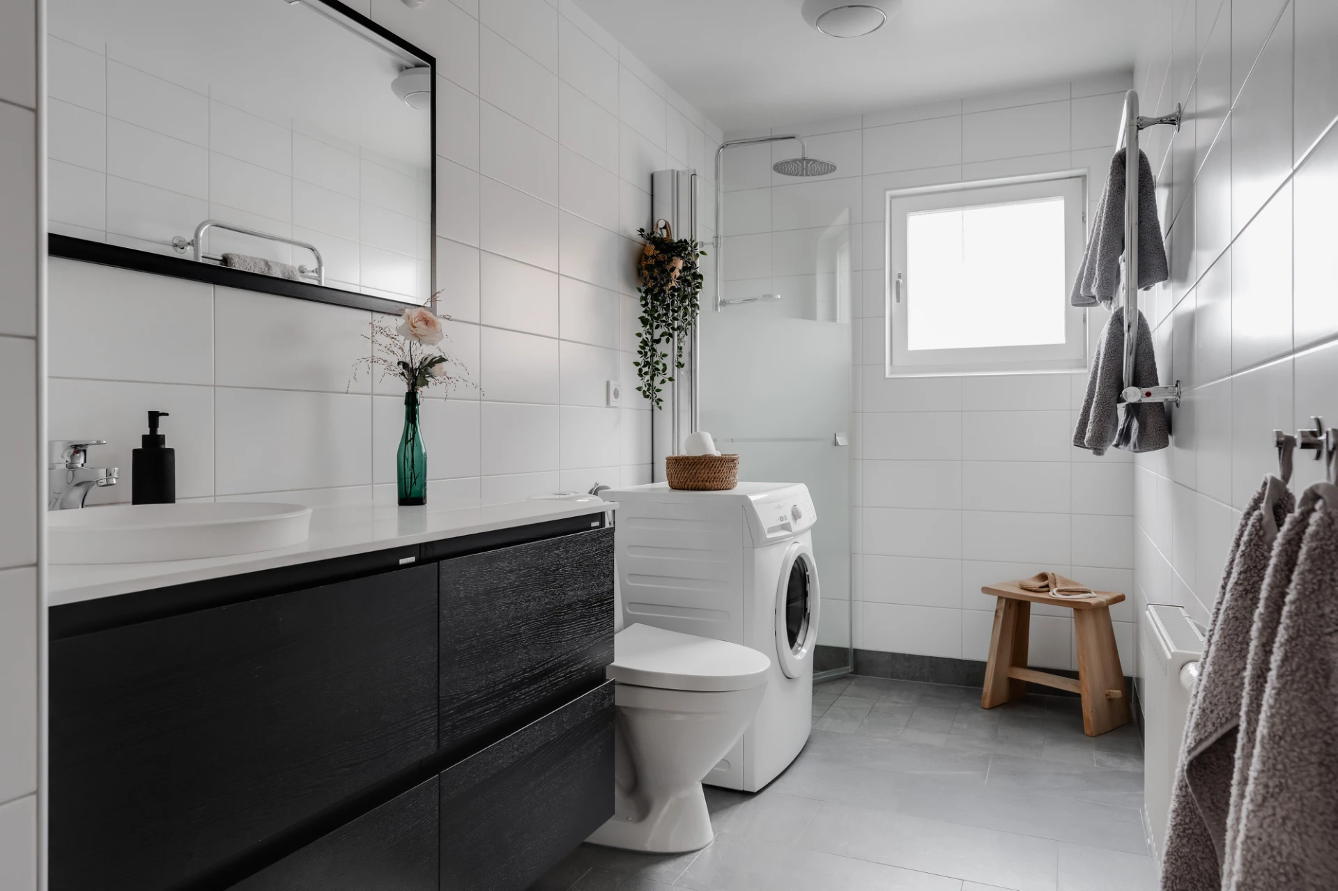 Helkaklat badrum renoverat 2021. Här finns stor kommod från Vedum med nedsänkt handfat, spegel med belysning, WC, dusch bakom duschvägg från INR och tvättmaskin. Komfortvärme på golvet. Extra lyx att ha fönster som släpper in dagsljus här.