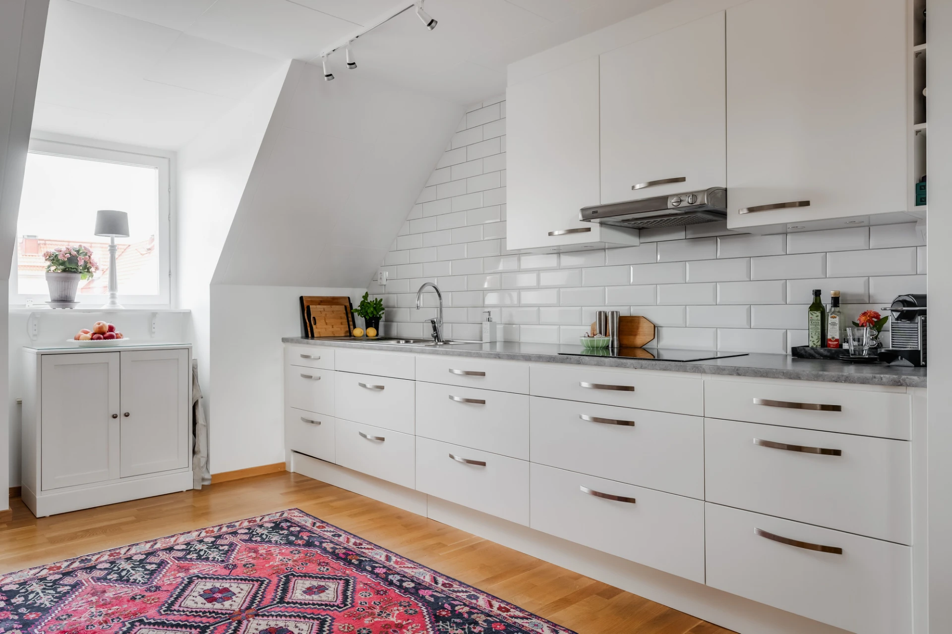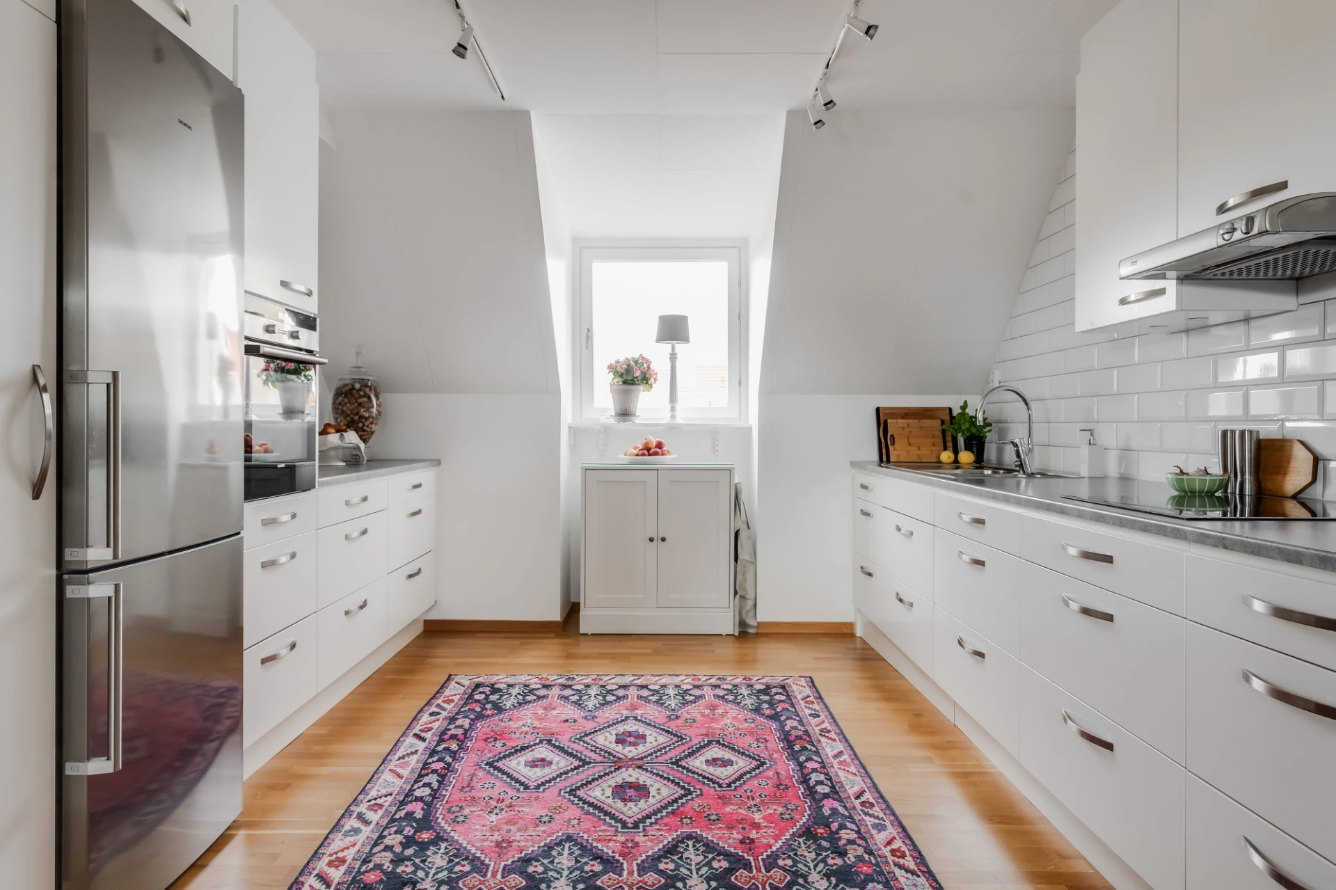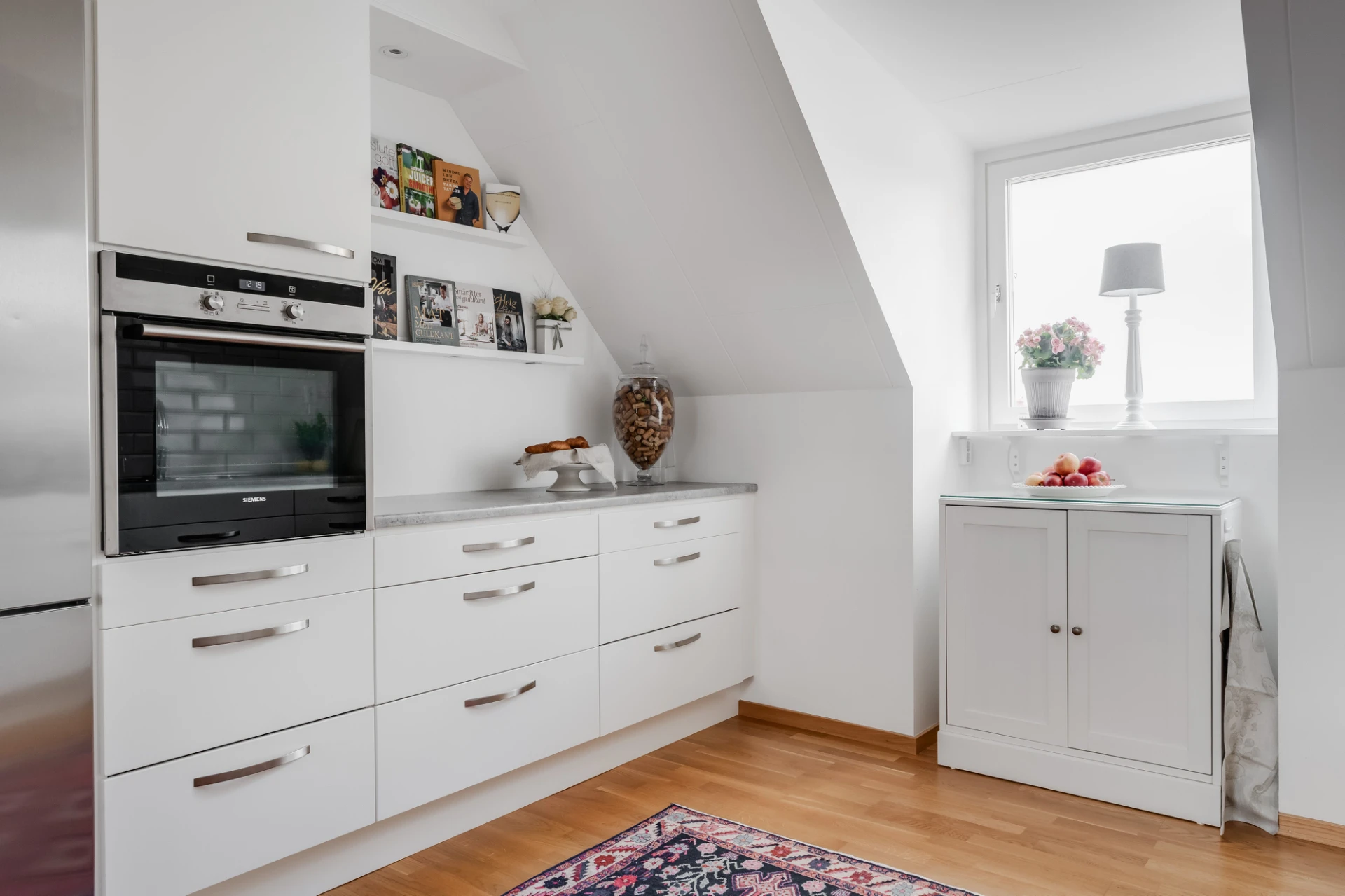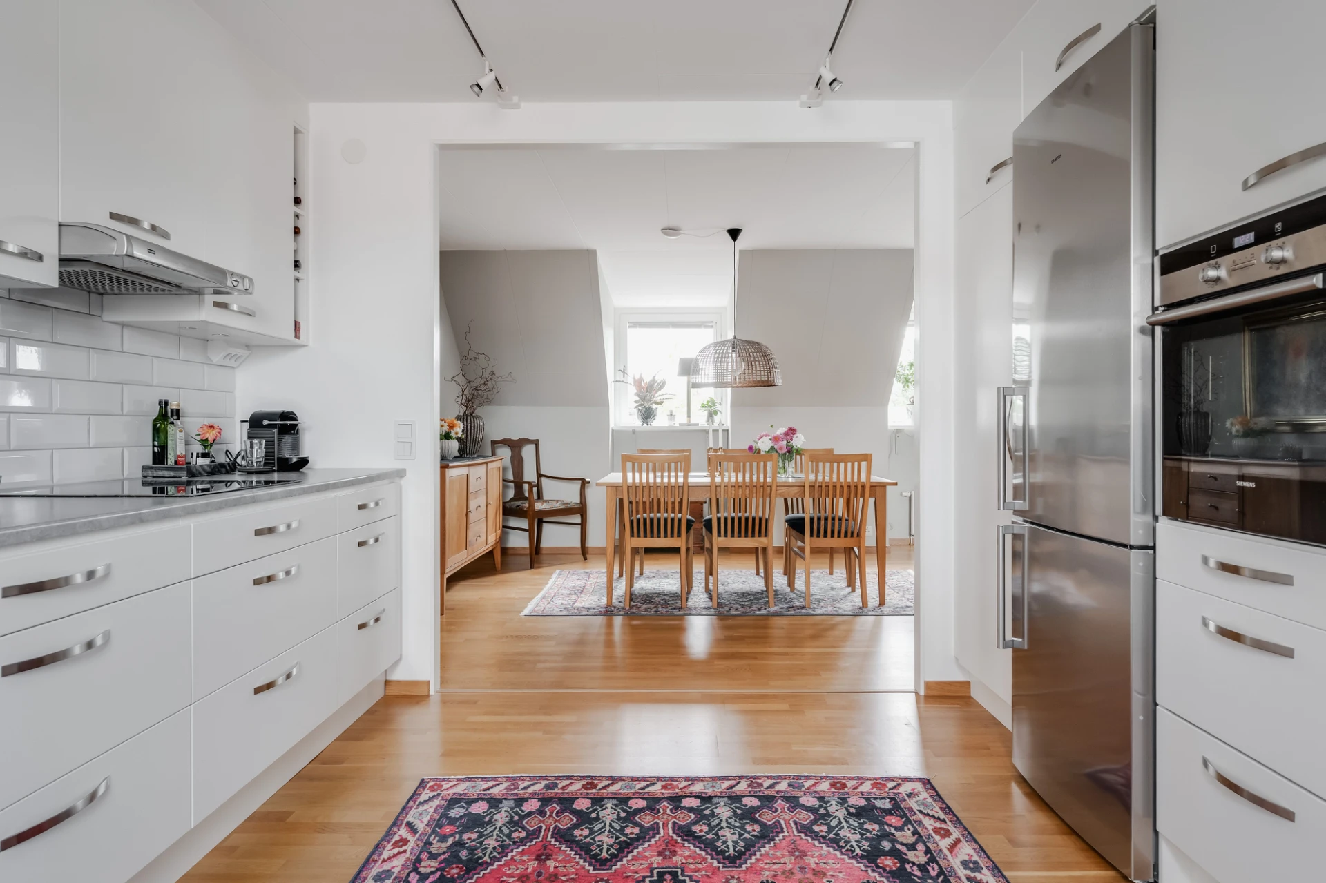 Påkostat Länghem kök, totalrenoverat 2014 som går i vitt och grått. Något bredare kyl/frys än normalt för extra plats. Bra med bänkyta och förvaringsskåp. Här erbjuds spishäll, integrerad diskmaskin, ugn och köksfläkt. Öppen planlösning mot bostadens matplats. Fint parkettgolv, vilket fortsätter ut till matplats och vardagsrum. Tack vare den breda öppningen som säljaren gjort får du fint ljusinsläpp från två håll här.