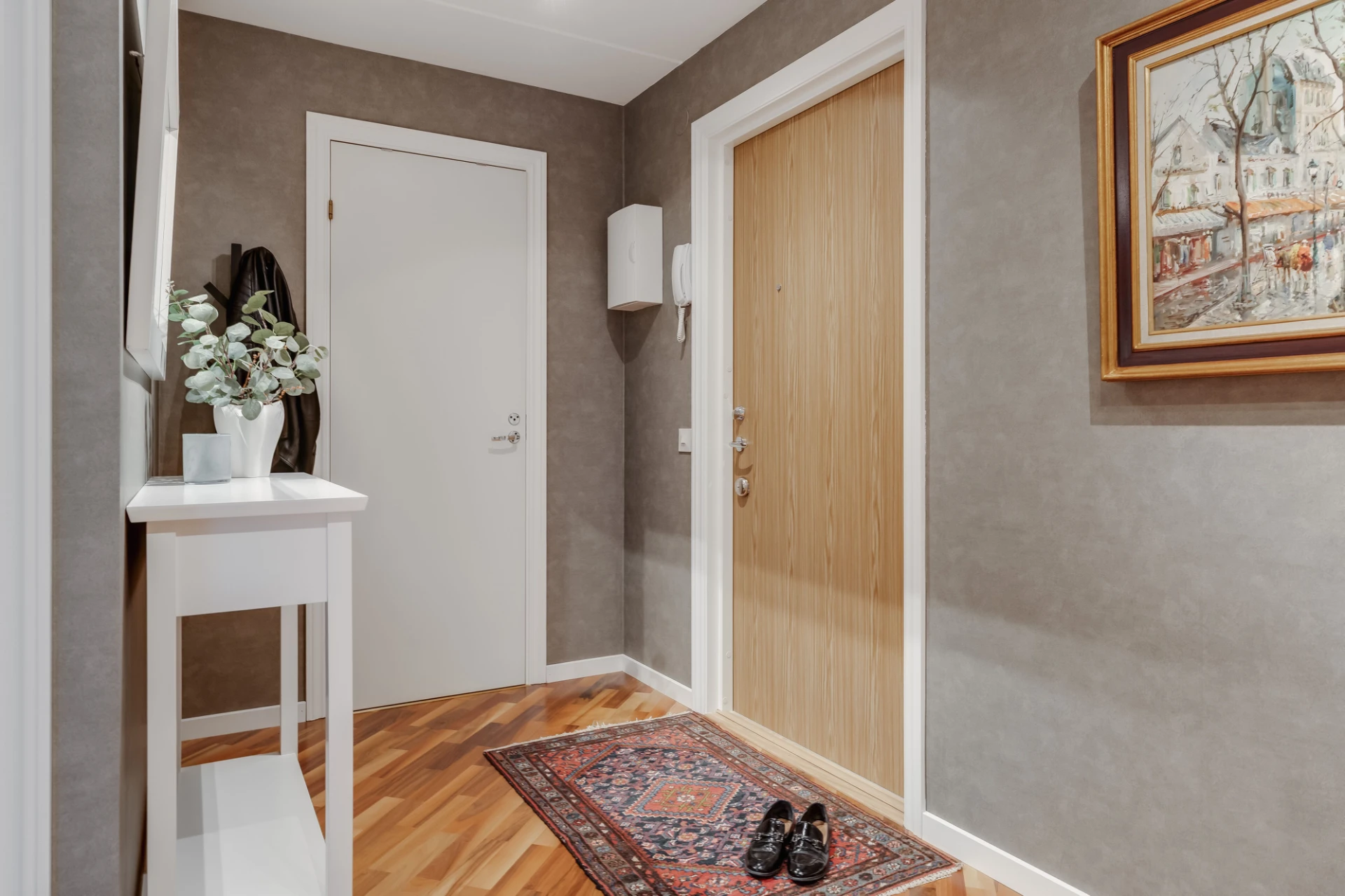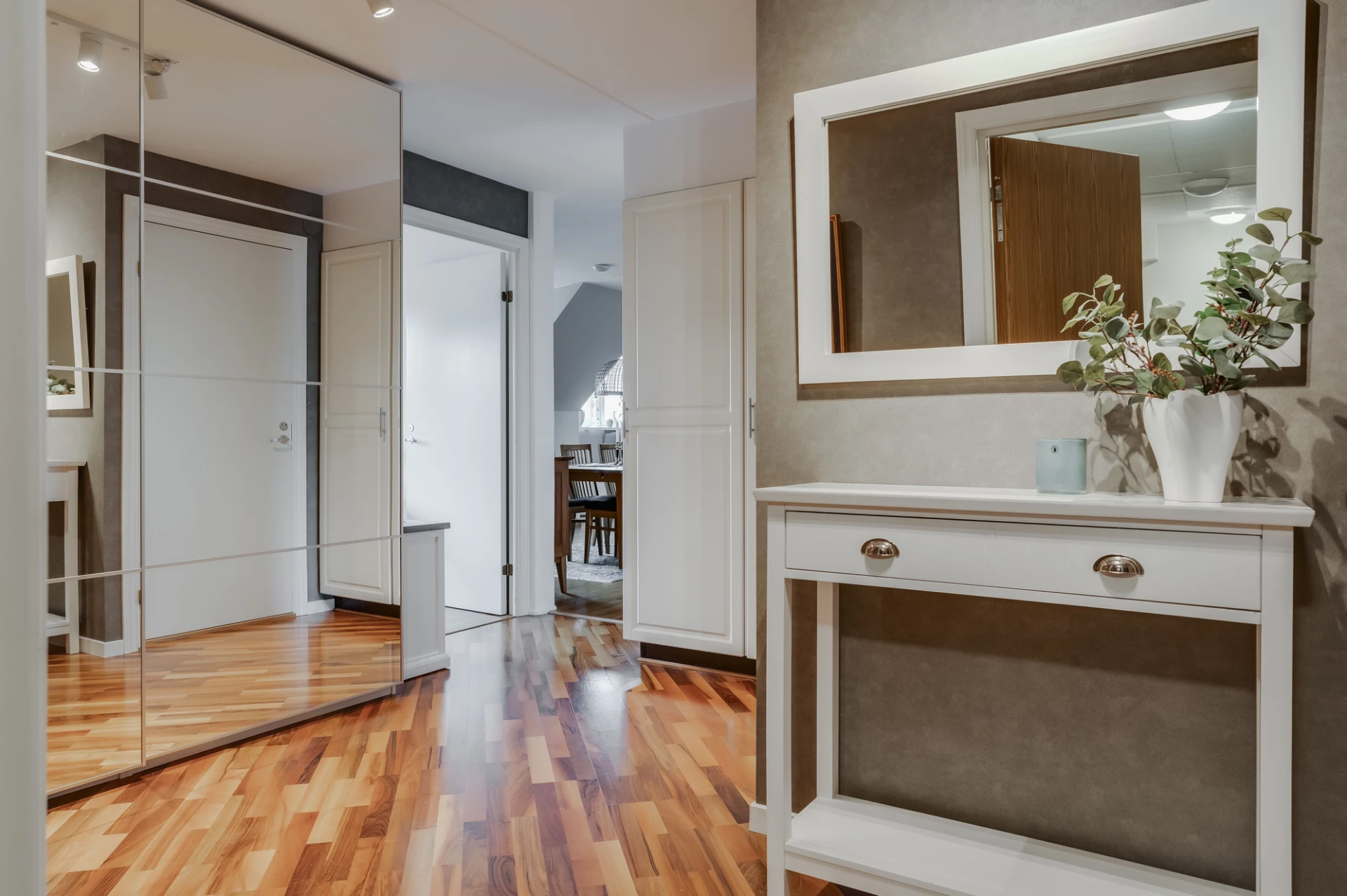 Välkomnade hall med parkettgolv och tapetserade väggar. Här finner ni gott om förvaring. Skjutdörrsgarderob med spegeldörrar, två separata garderober och klädkammare. Vidare når ni badrummet.