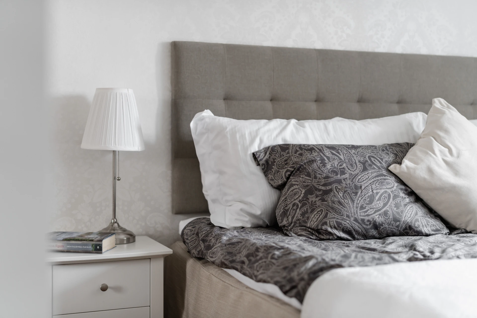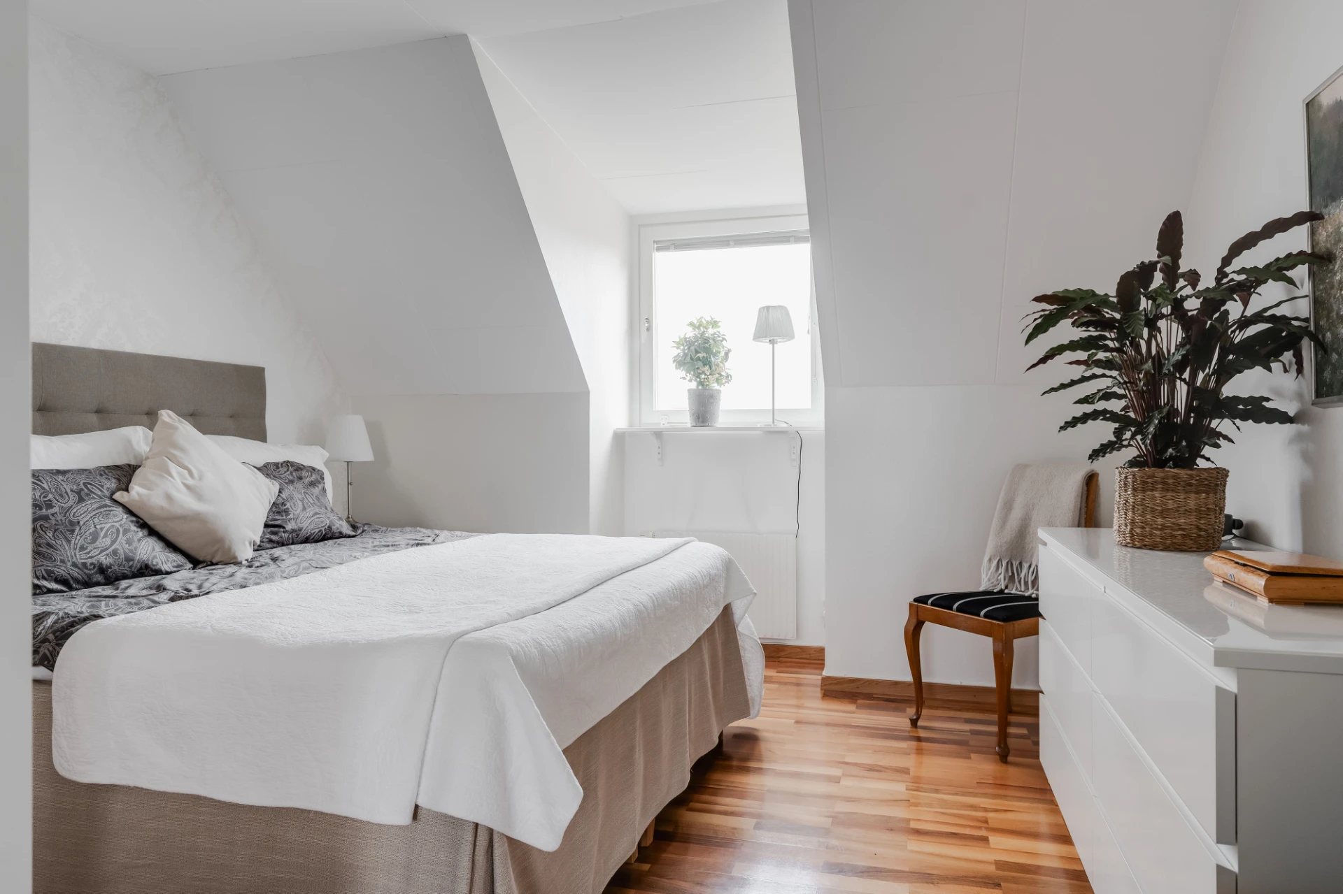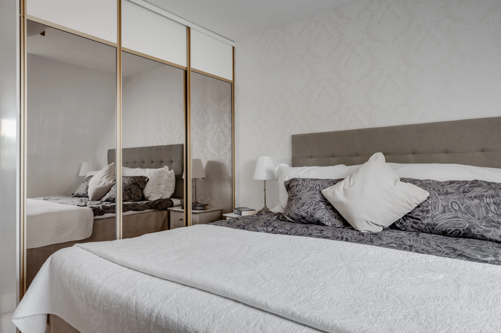 Bostadens större sovrum är idag inrett med dubbelsäng. Här erbjuds också skjutdörrsgarderob med spegeldörrar till förvaring. Plats för byrå eller spjälsäng finns om så önskas. Inred efter egna behov och önskemål. Välkommen att trivas!