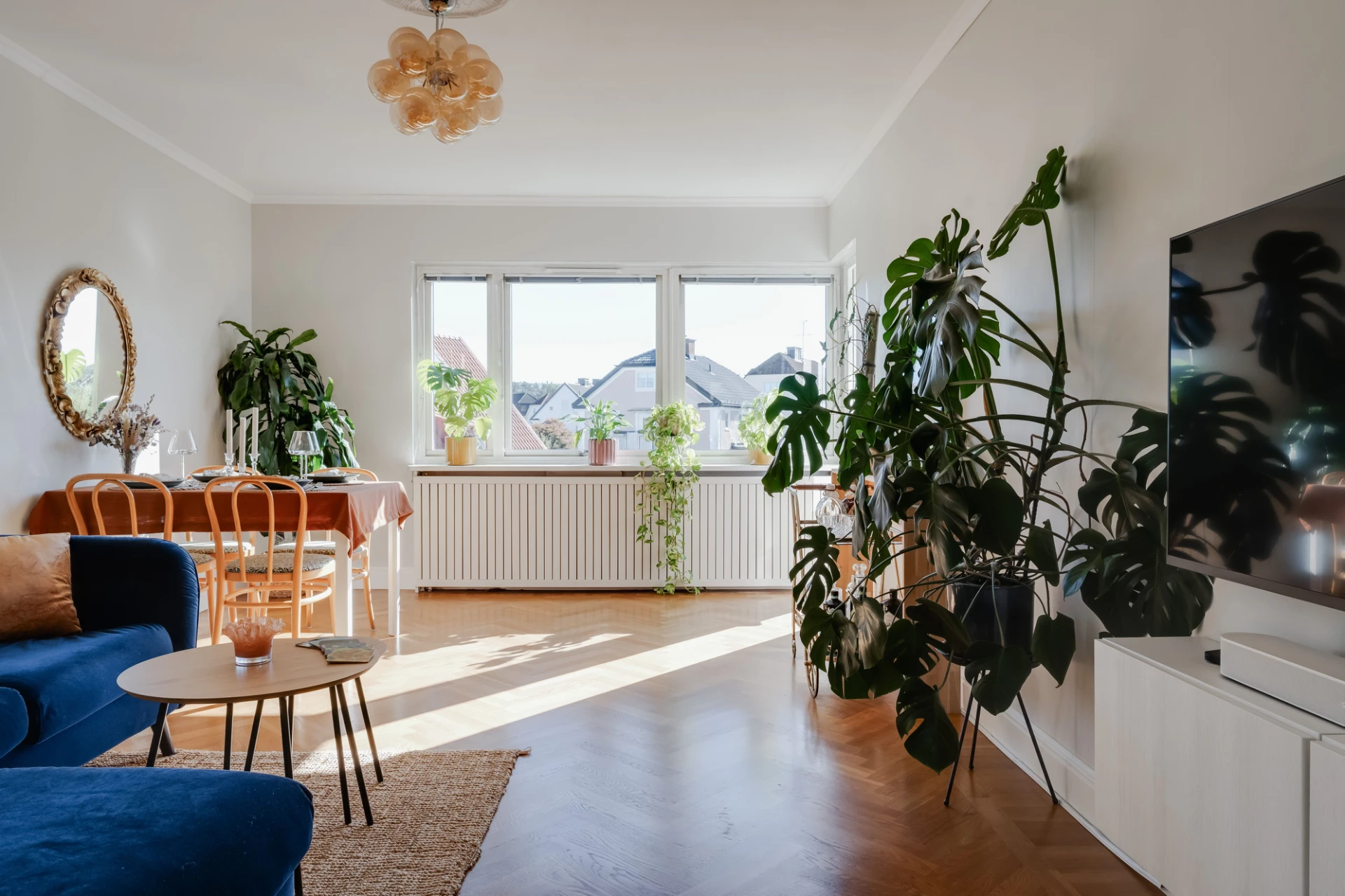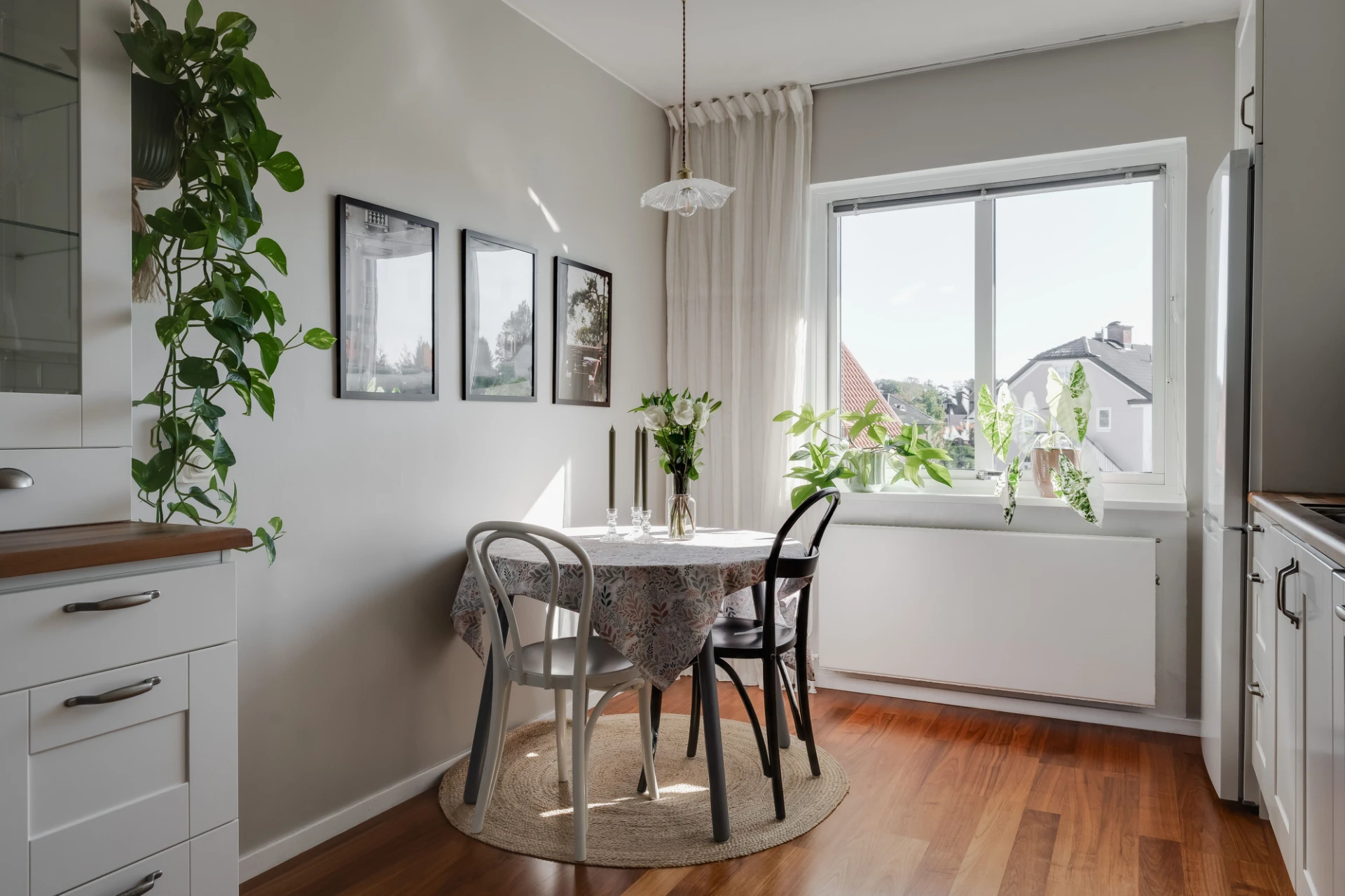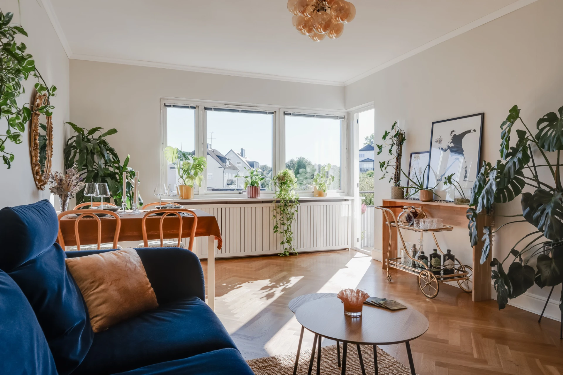Soldränkt vardagsrum på förmiddagarna, perfekt läge för en härlig TV-kväll när solen gått runt huset. Välbevarad fiskbensparkett och ljust målade väggar. Här får soffa med tillhörande möblemang och ett matsalsbord praktiskt plats. Tacksamt om du flyttar från större eller där två hushåll blir ett.