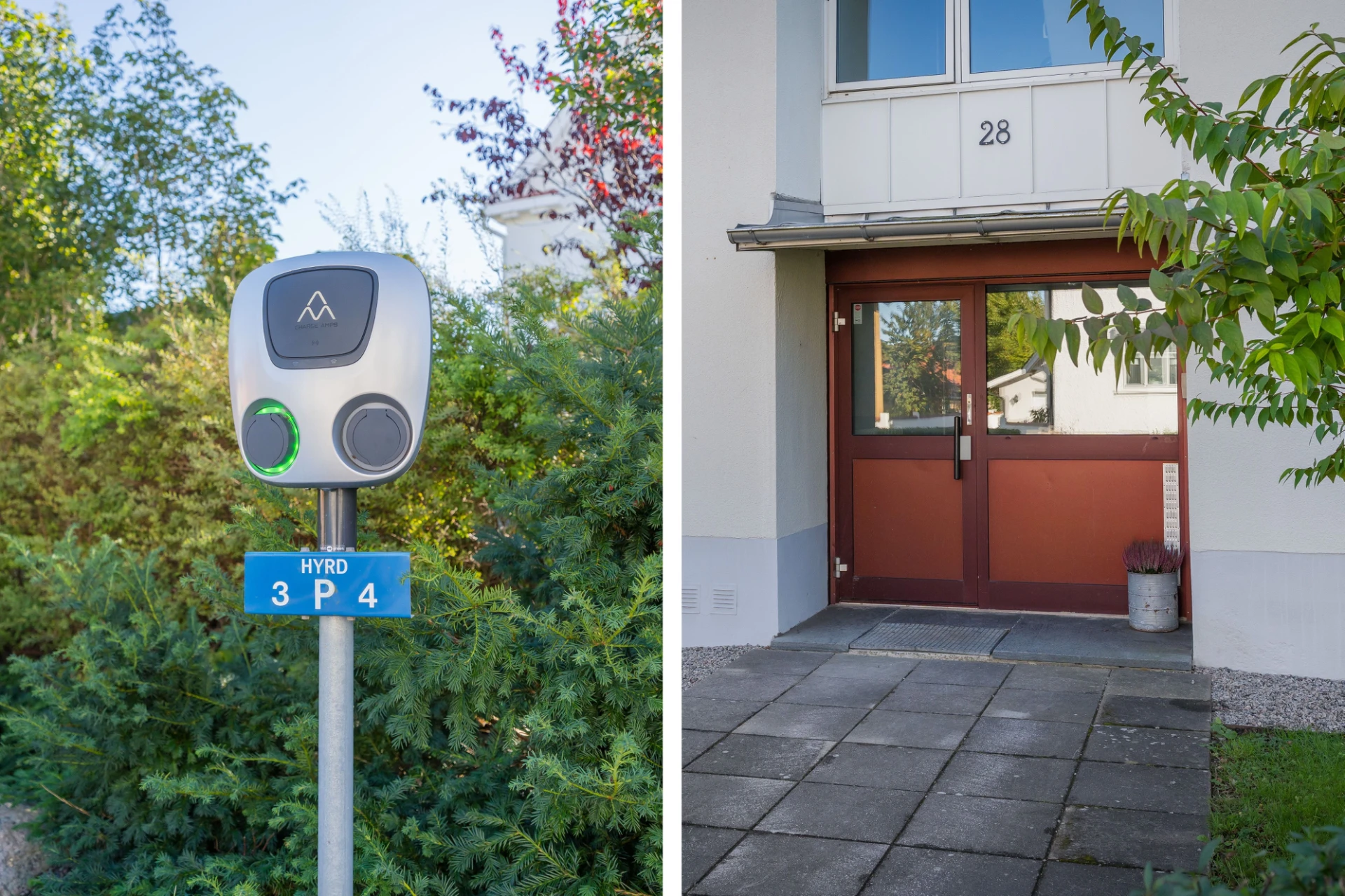Parkering: 7 st garageplatser och 7 st p-platser med elstolpe enligt kösystem. Pris 275 kr/mån för parkering och 525 kr för garage. Samtliga parkerings- och garageplatser har elbilsladdare.