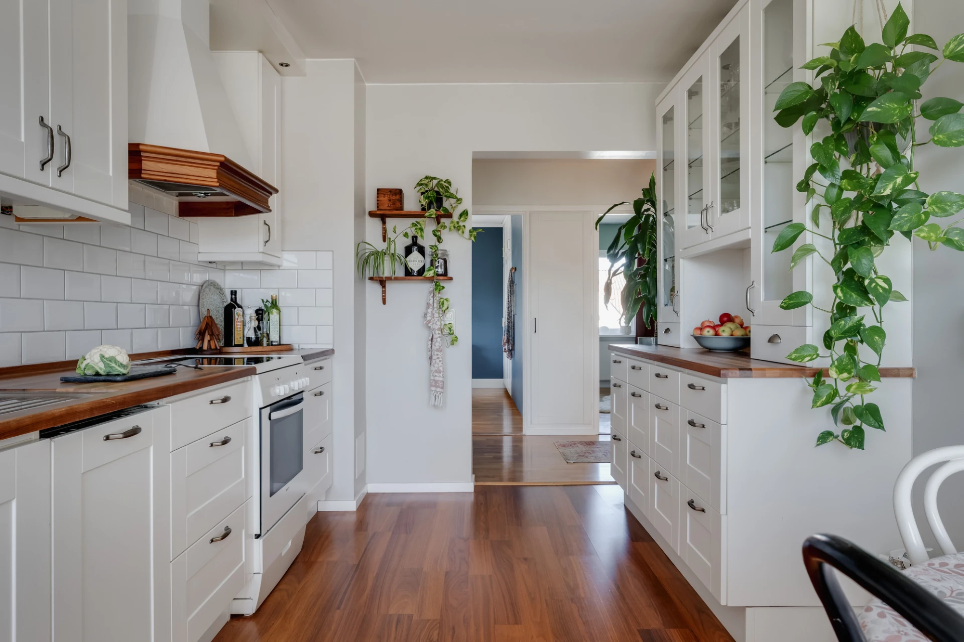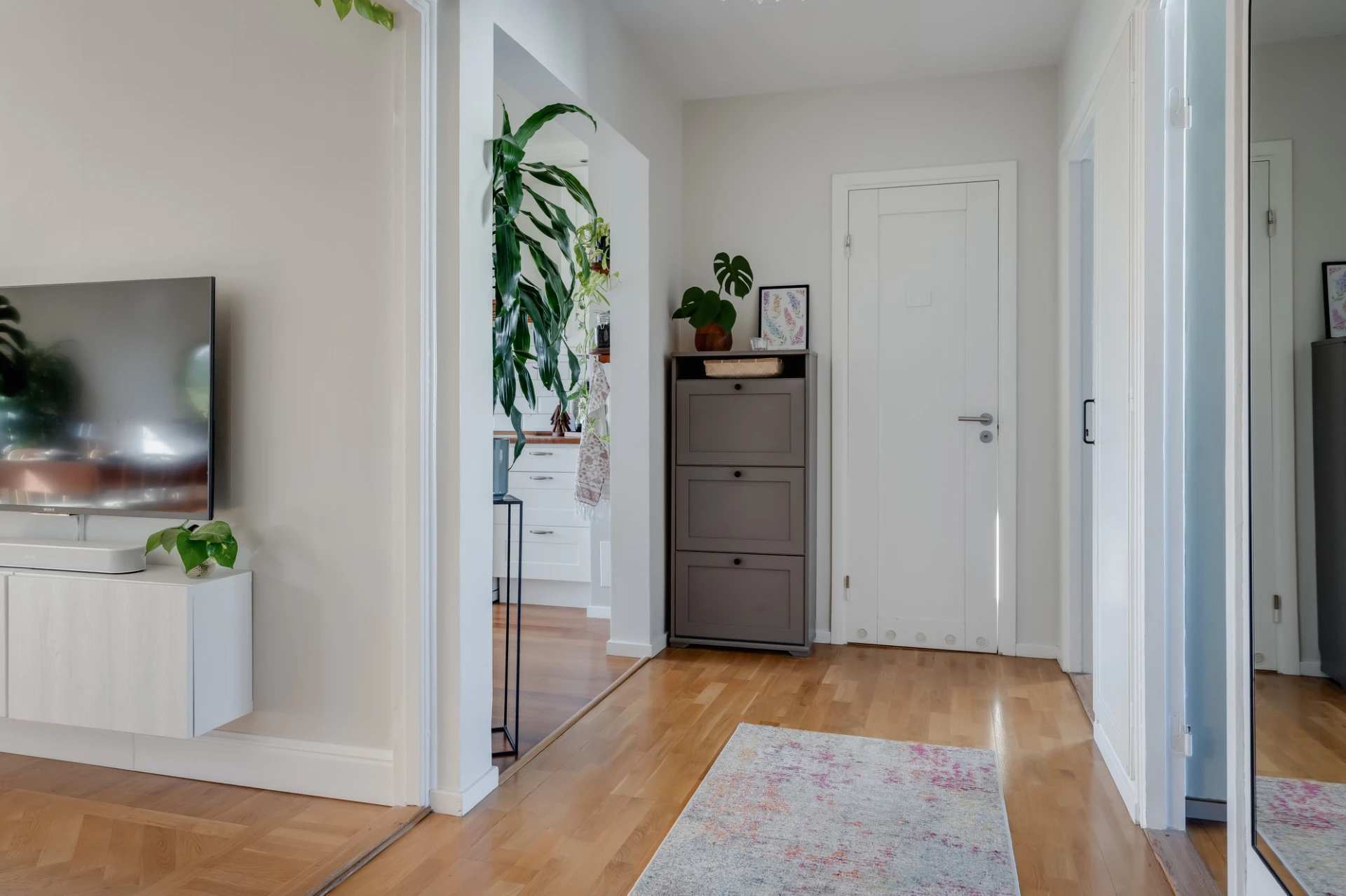 Ljus hall med platsbyggd avhängning i samma kulör som väggen. Fin klinker i hallen som övergår till ekparkett och ljust målade väggar. Här finns en garderob till förvaring.