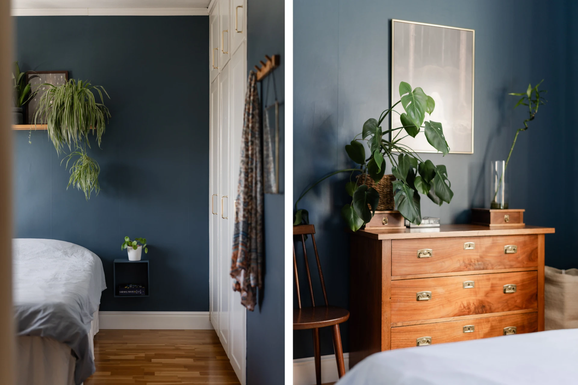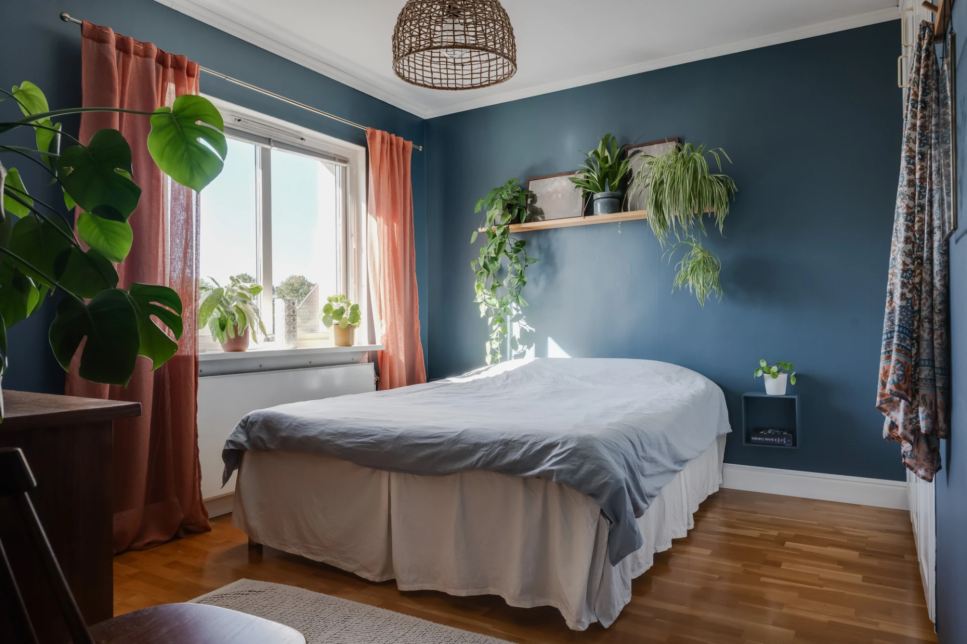 Bostadens ena sovrum är målat i en härlig mörkblå nyans. Här får dubbelsäng med tillhörande sängbord enkelt plats. Idag även inrett med byrå och inbyggda garderober finns till förvaring.