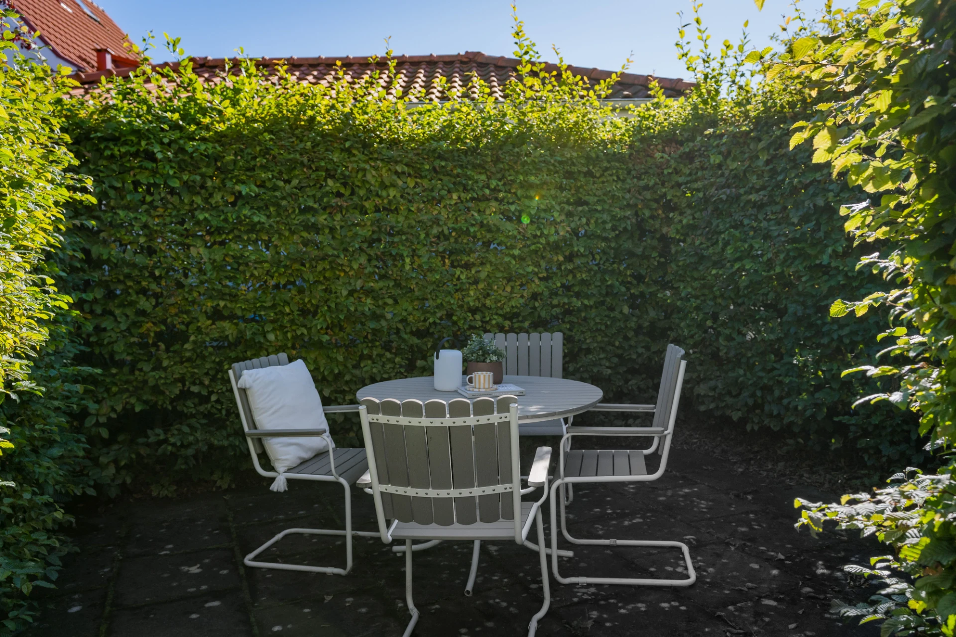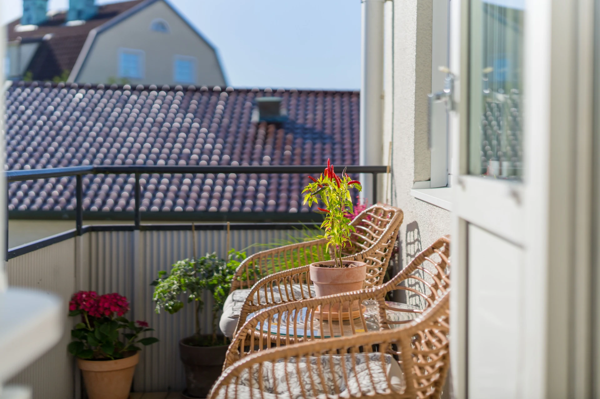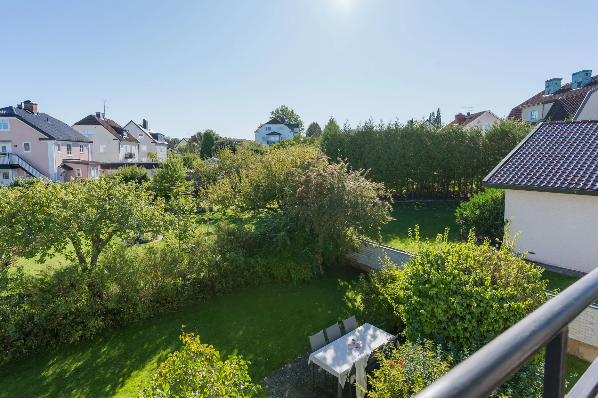 Från vardagsrummet når ni bostadens balkong. Här har du sol från morgon och fram efter lunch. Idag står här två loungestolar och ett bord. Plats för växter finns för den som önskar. Grönskande utsikt över såväl föreningens innergård som fina trädgårdar och salängsvillor.