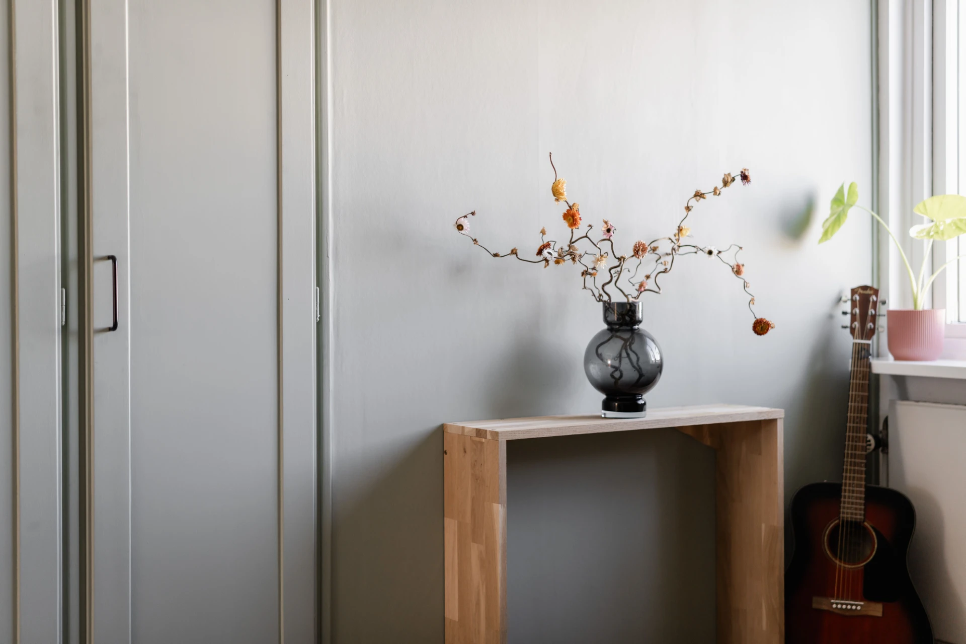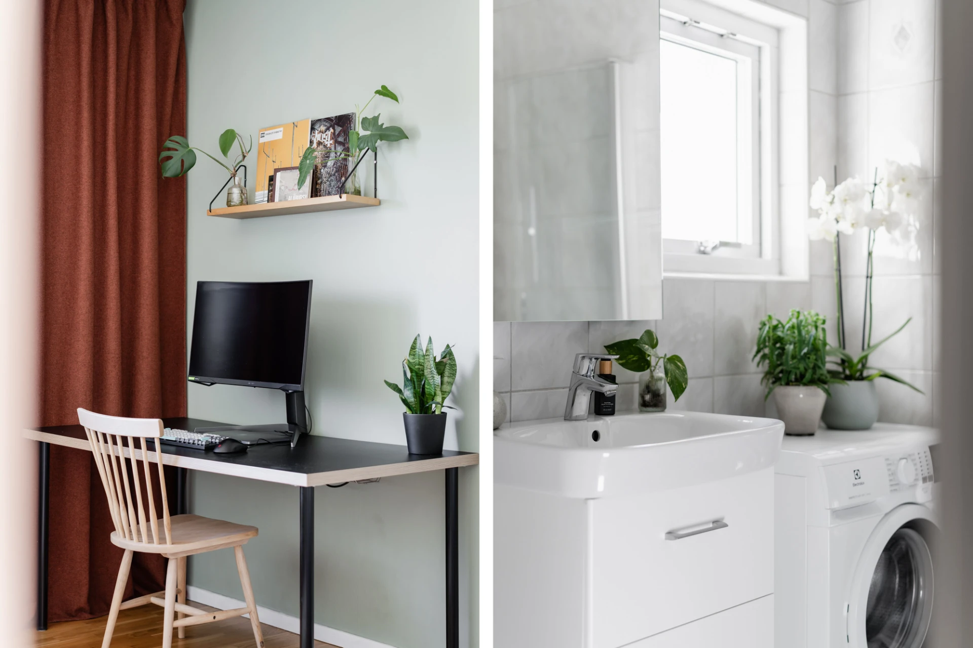 Bostadens andra sovrum går i ljusgrönt. Även detta rum går att inreda med dubbelsäng. Idag inrett med bäddsoffa och skrivbord. Inred efter eget önskemål. Även här erbjuds inbyggda garderober till förvaring!