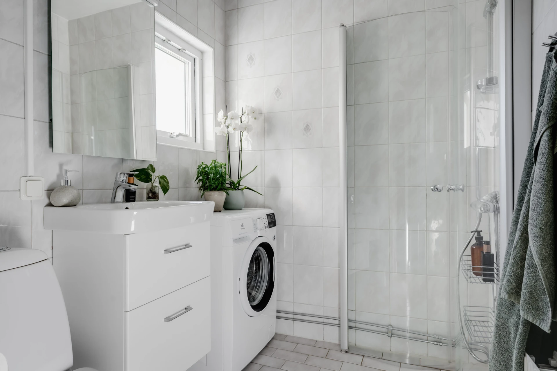 Badrummet är helkaklat i ljusgrå toner och erbjuder dusch bakom glasdörrar, WC, kommod, spegel med belysning och tvättmaskin. Tack vare att det är en gavellägenhet erbjuds man härligt dagsljus från fönster.