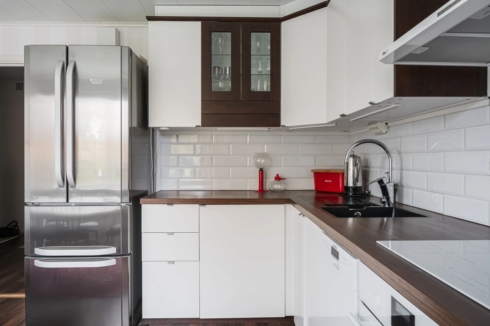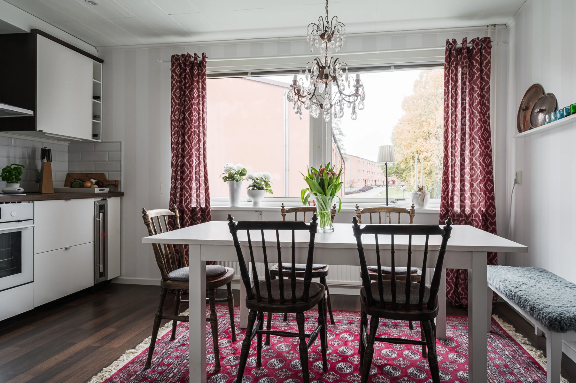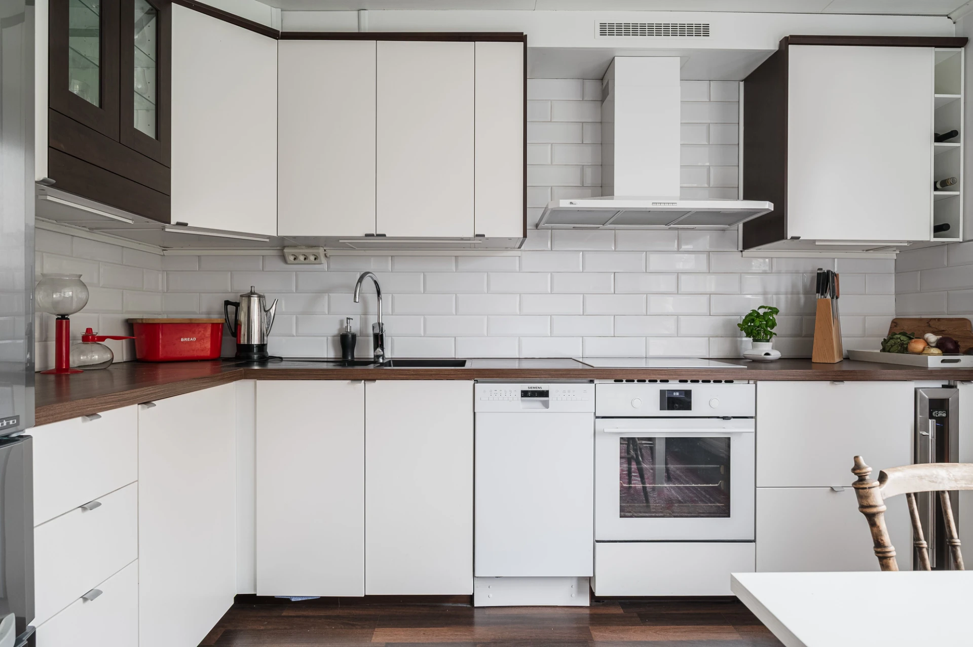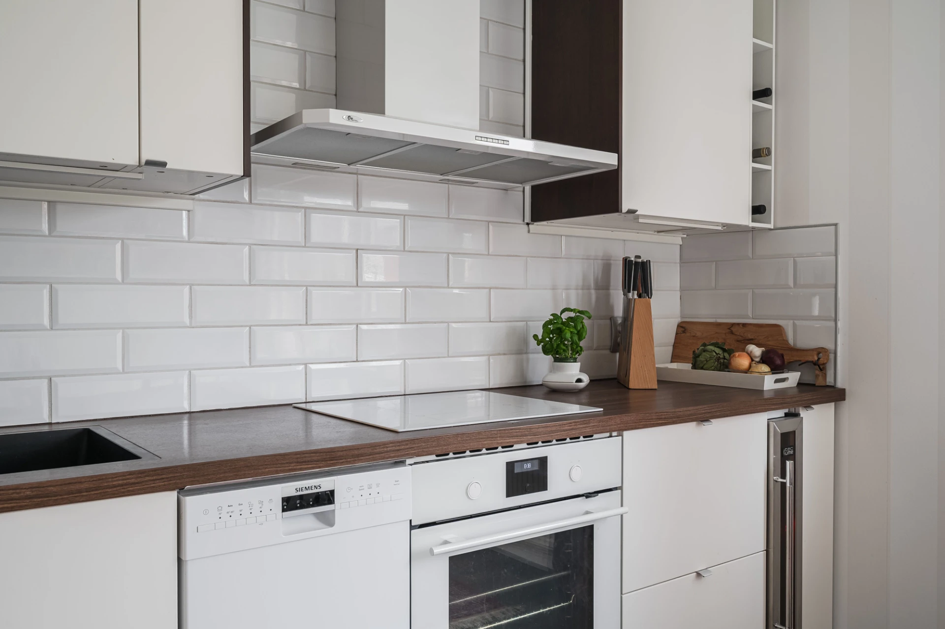 Köket är modernt och fullt utrustat med kyl/frys, spishäll, ugn, diskmaskin, fläkt och vinkyl. Ljusa skåpsluckor, mörkare bänkskiva och spotlights i taket skapar en elegant helhet, och från köket har du fin utsikt mot innergården.