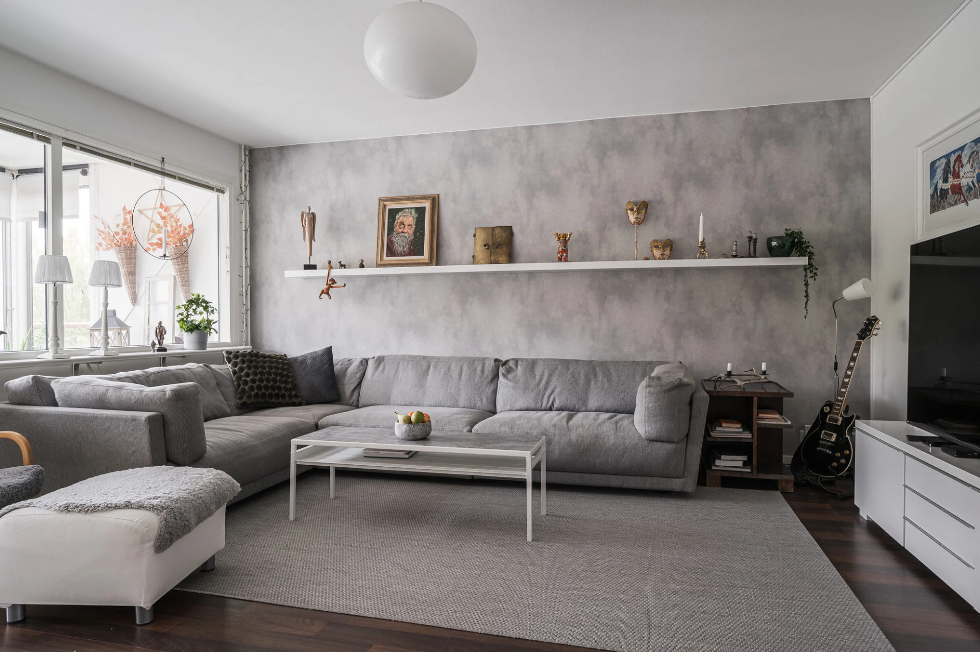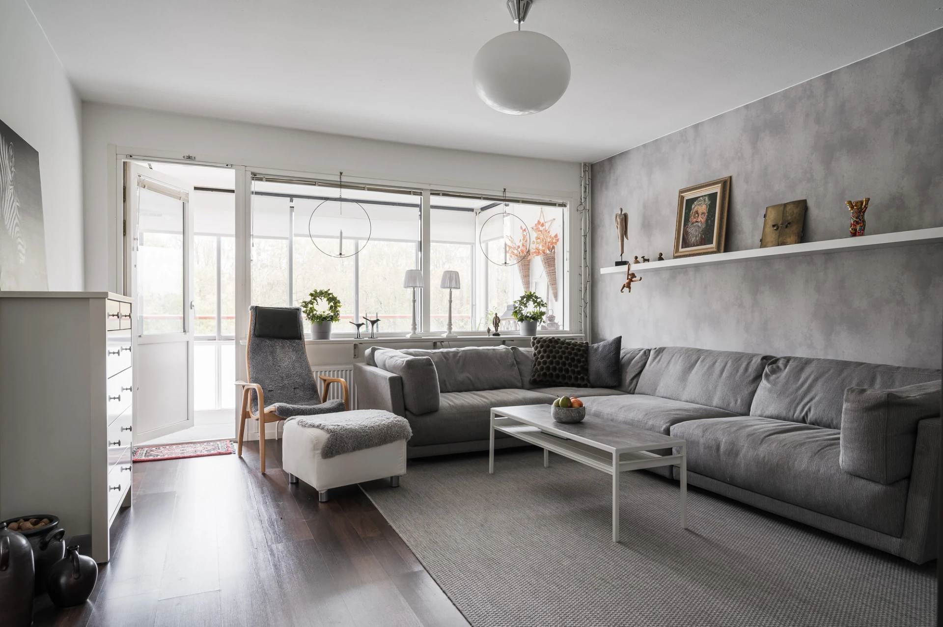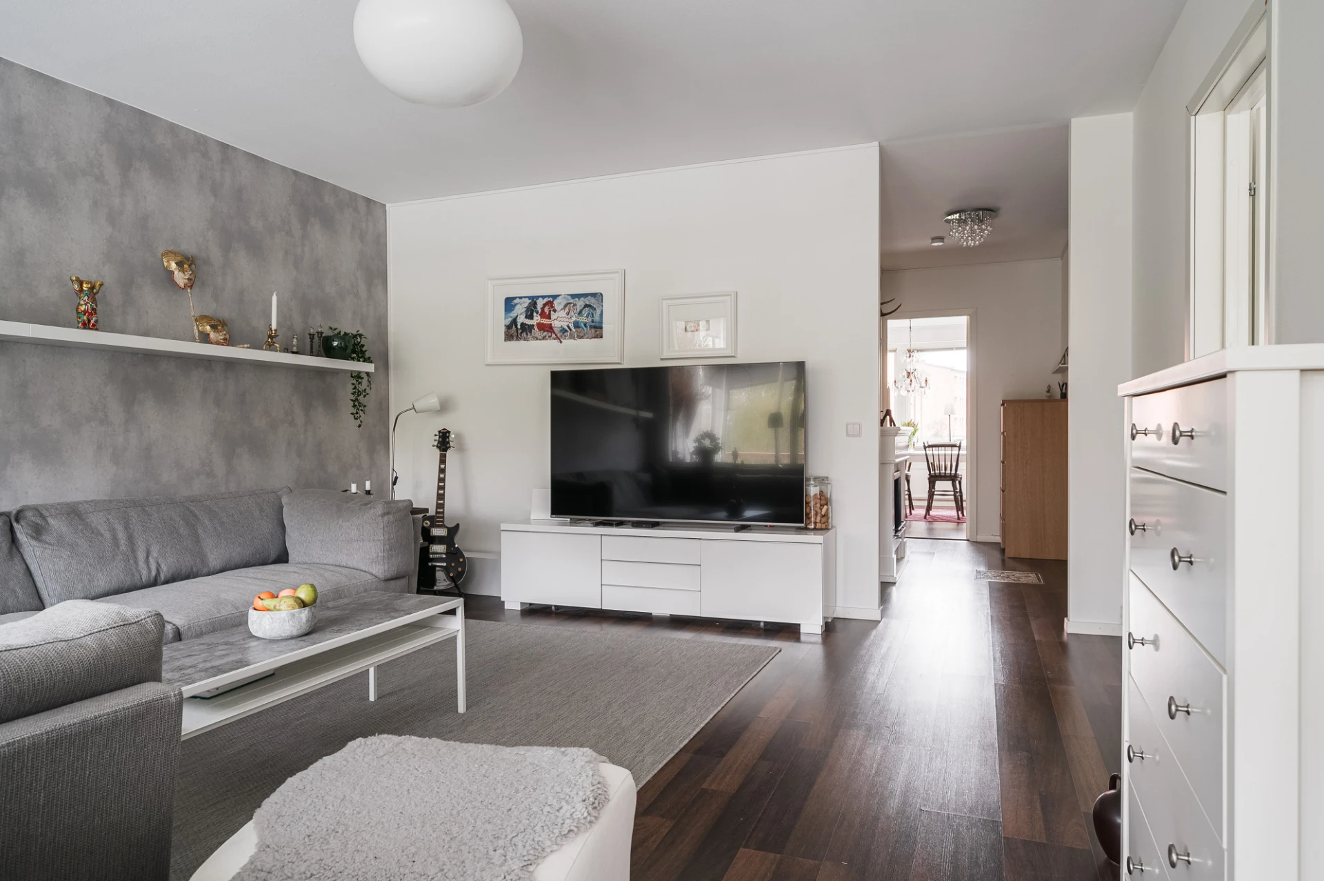 Vardagsrummet är ljust och rymligt med laminatgolv i träton, ljusa väggar och en smakfull fondvägg i putsad tapet. Härifrån når du balkongen som ger bostaden en härlig rymd och extra trivsel.