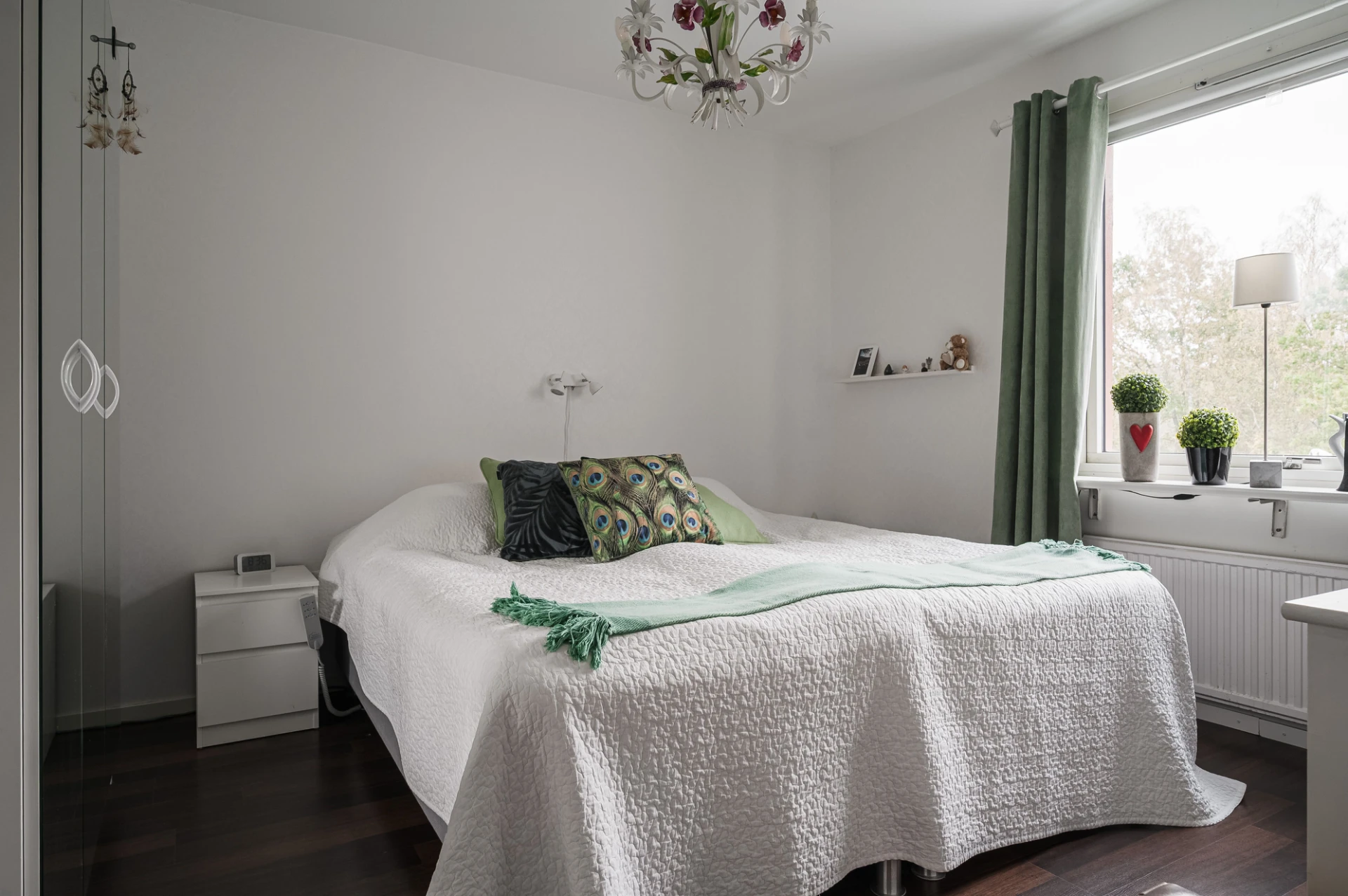 Sovrummet har mörkare laminatgolv, ljusa väggar och gott om förvaring i tre garderober med spegeldörrar.
