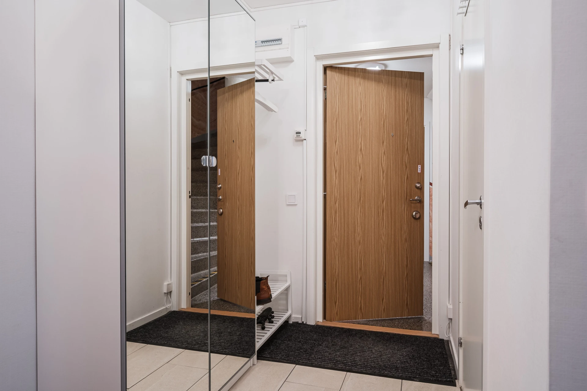 Hall med klinkergolv och golvvärme, hatthylla, garderober samt praktisk klädkammare.