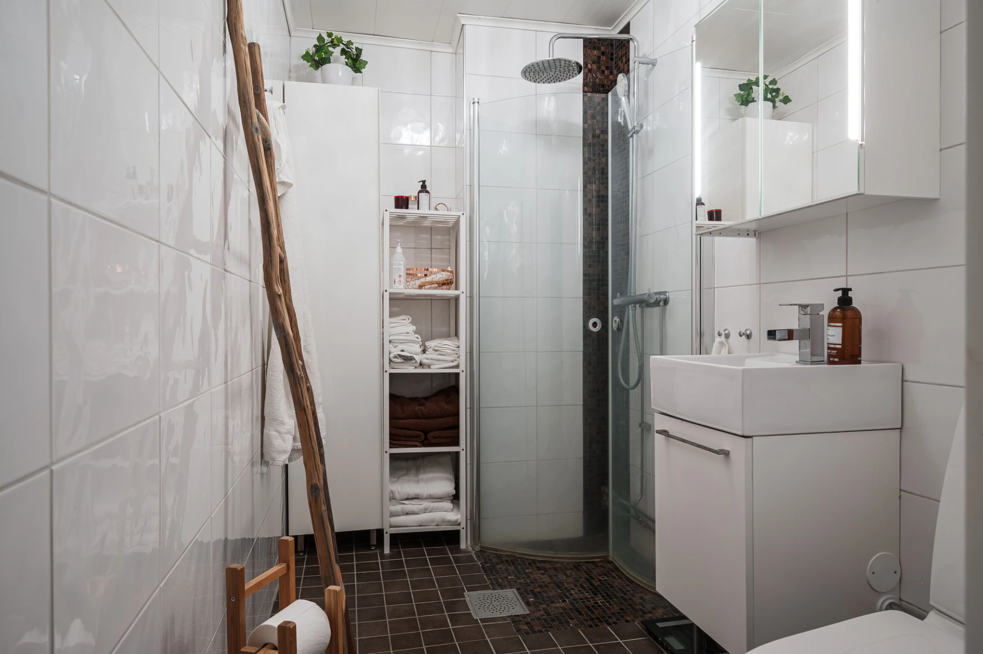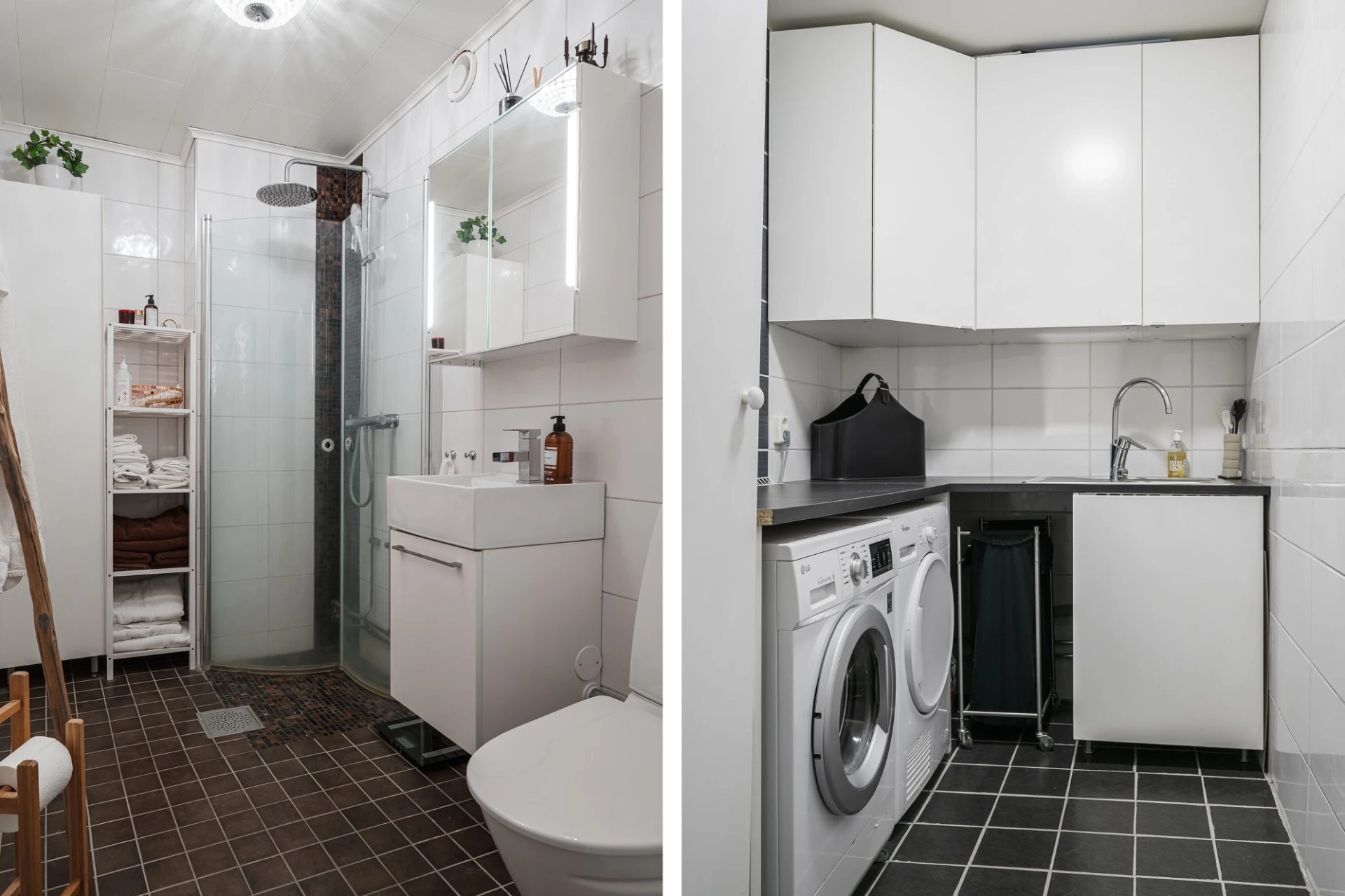 Helkaklat badrum med klinkergolv, golvvärme, wc, handfat och dusch. I lägenheten finns även en snygg, separat tvättstuga med arbetsbänk, skåp, tvättho, tvättmaskin och torktumlare – en riktig vardagslyx!