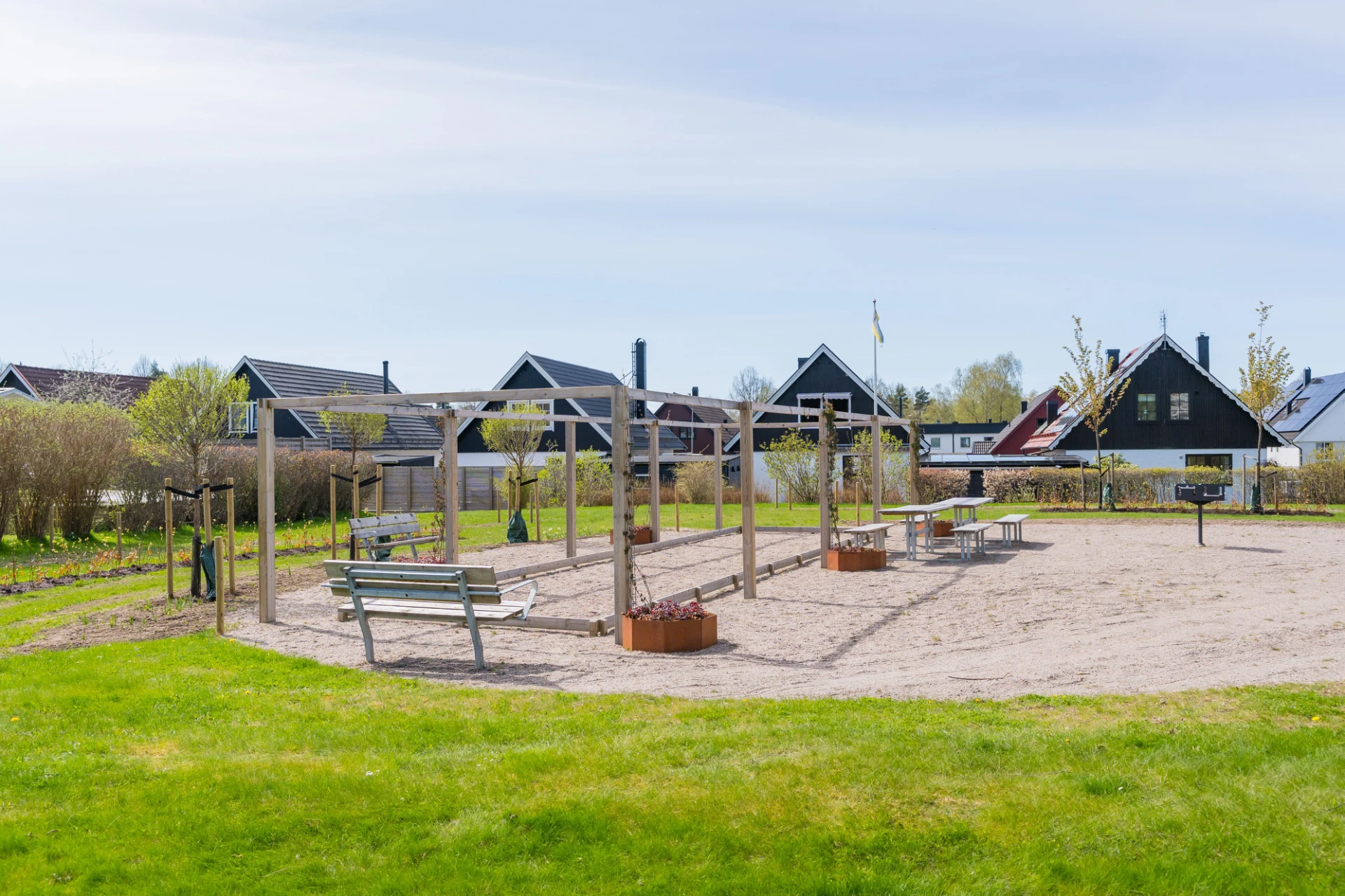 Allrummet har ett mörkare trägolv och är inrett med ljus träpanel och tapet, vilket ger en varm och hemtrevlig känsla. Här finns garderober med skjutdörrar för bra förvaring. Från rummet nås också en balkong med utsikt över den närliggande lekplatsen, en perfekt plats att njuta av omgivningen.