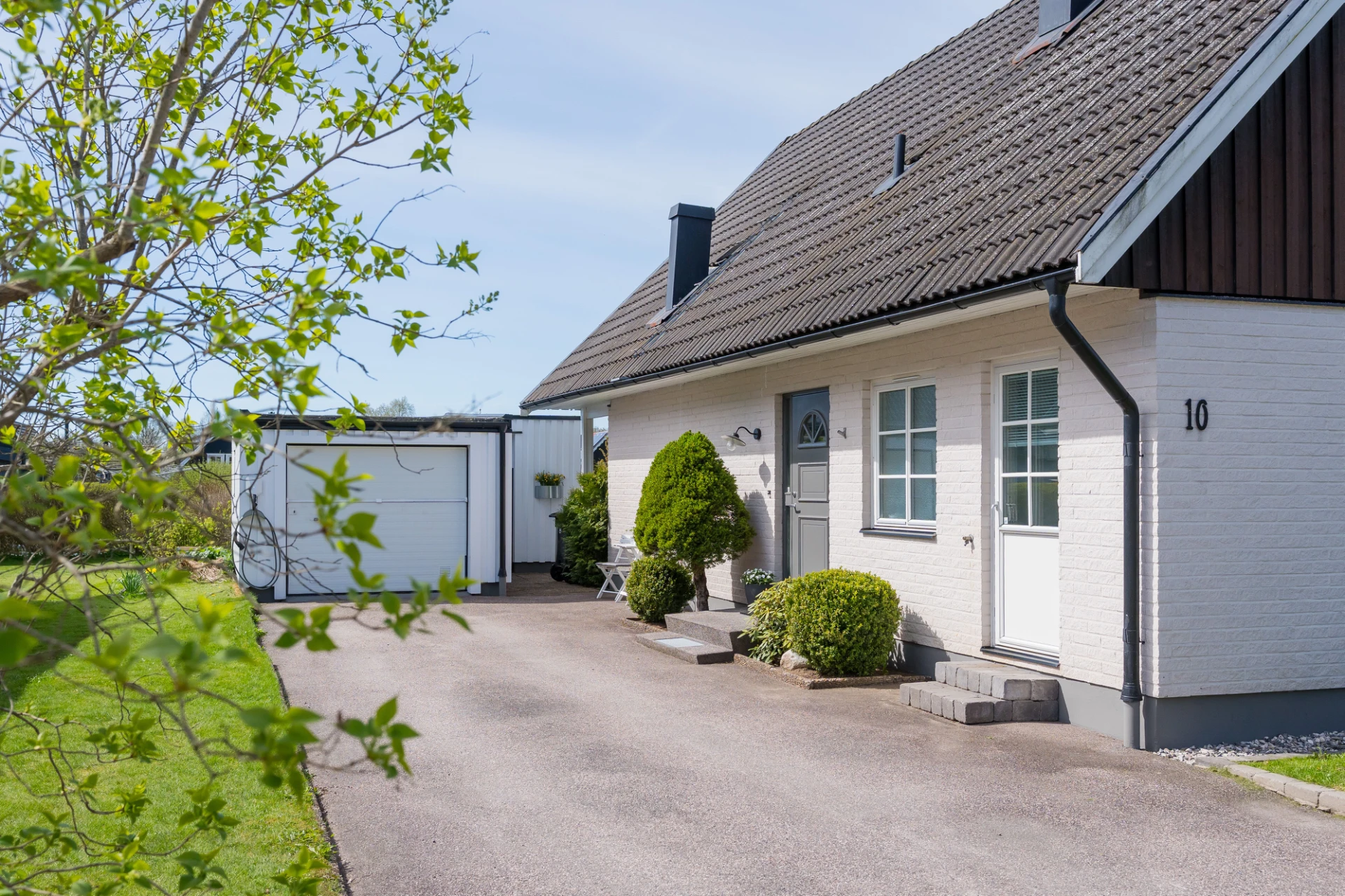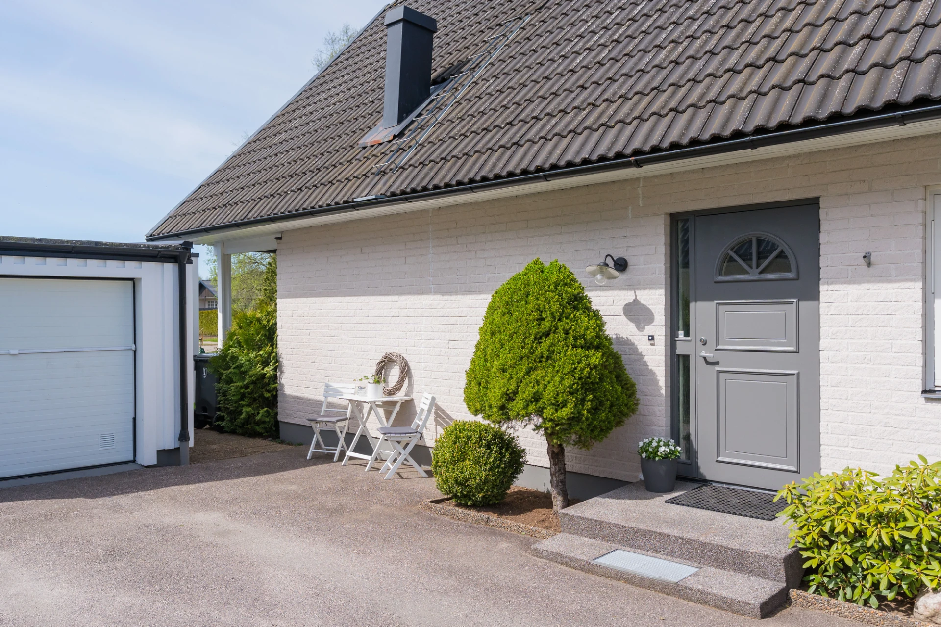 Entrén välkomnar med ett klinkergolv och ljusa väggar, samt plats för avhägning och en garderob. Från entrén går du vidare in i hallen, där ett parkettgolv pryder golvet och de målade grå väggarna skapar en modern och lugn känsla.