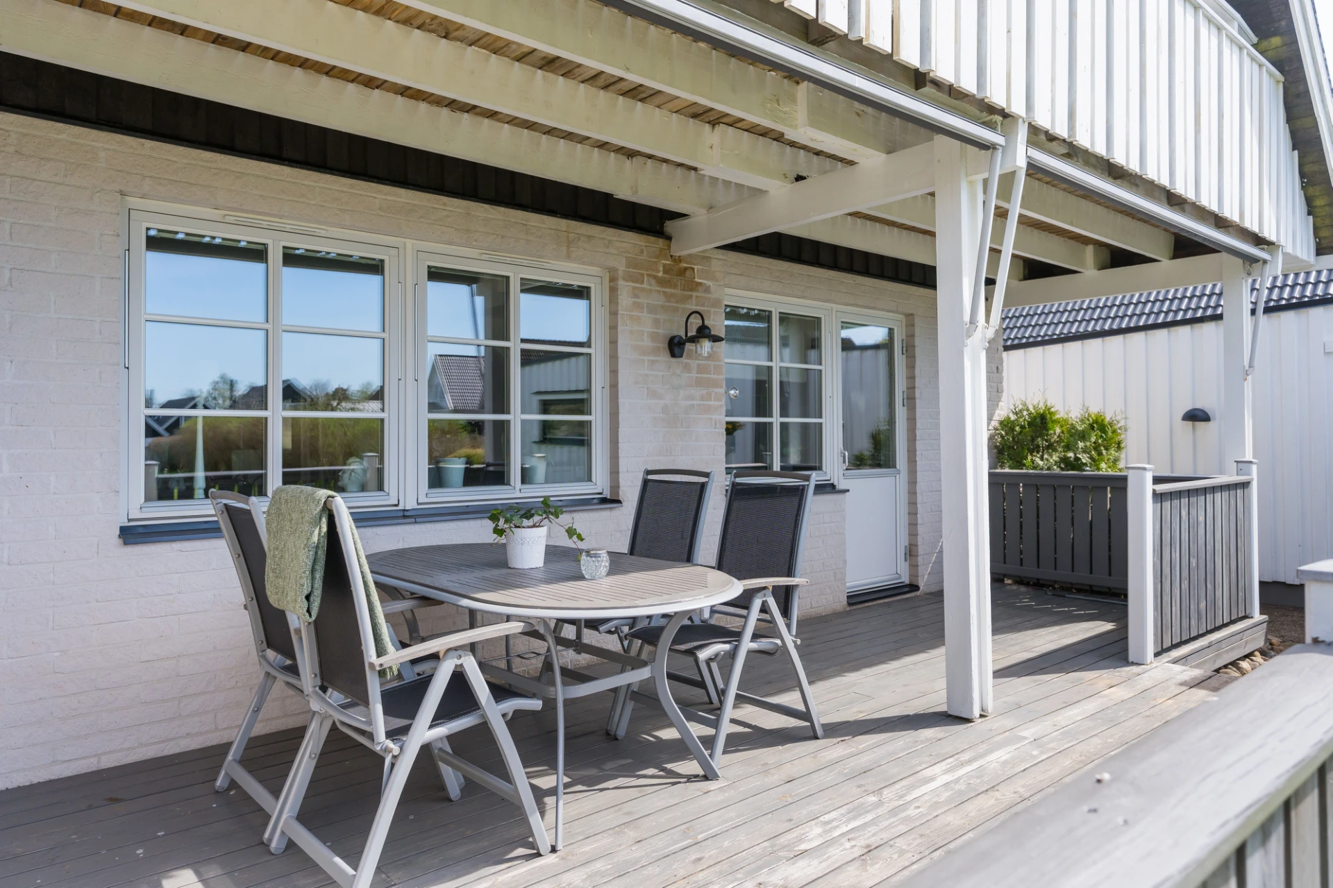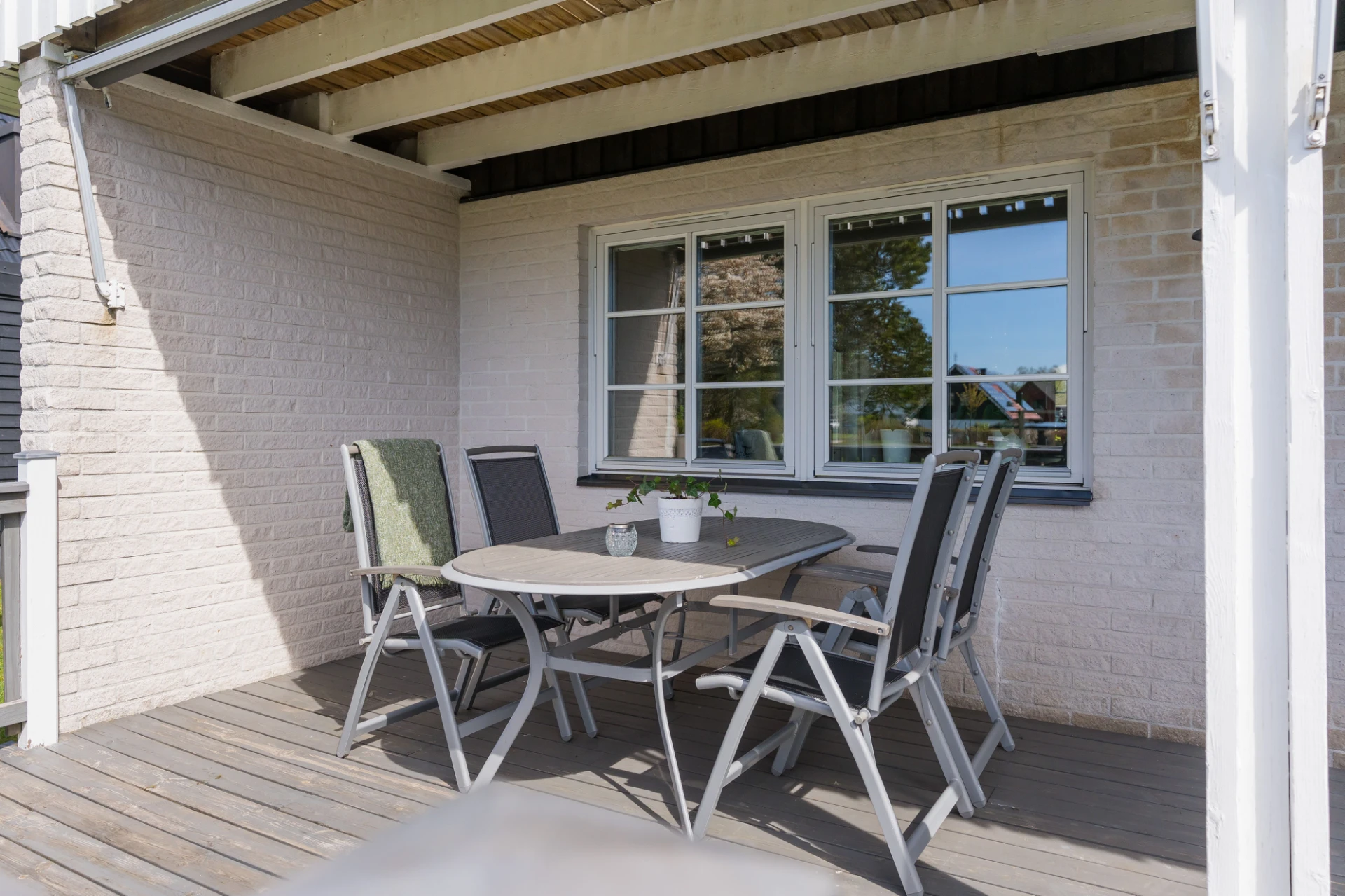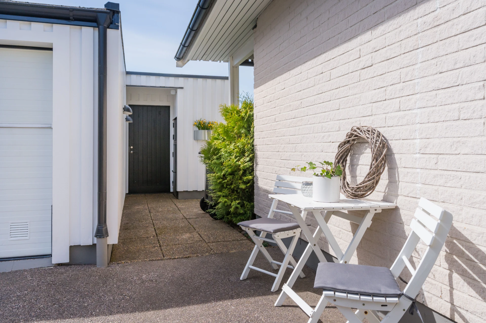 Köket har ett stiligt parkettgolv och ljusa väggar, samt en öppen lösning mot vardagsrummet som ger en härlig rymd. De ljusa köksluckorna och de ljusa kaklade väggarna ger ett fräscht och ljust intryck, medan den mörkare bänkskivan ger en fin kontrast. Köket är fullt utrustat med kyl, frys, diskmaskin, spis, ugn och mikro. Härifrån nås också altanen, perfekt för att njuta av utomhusmiljön. Spotlights i taket bidrar till ett stiligt och funktionellt ljus.