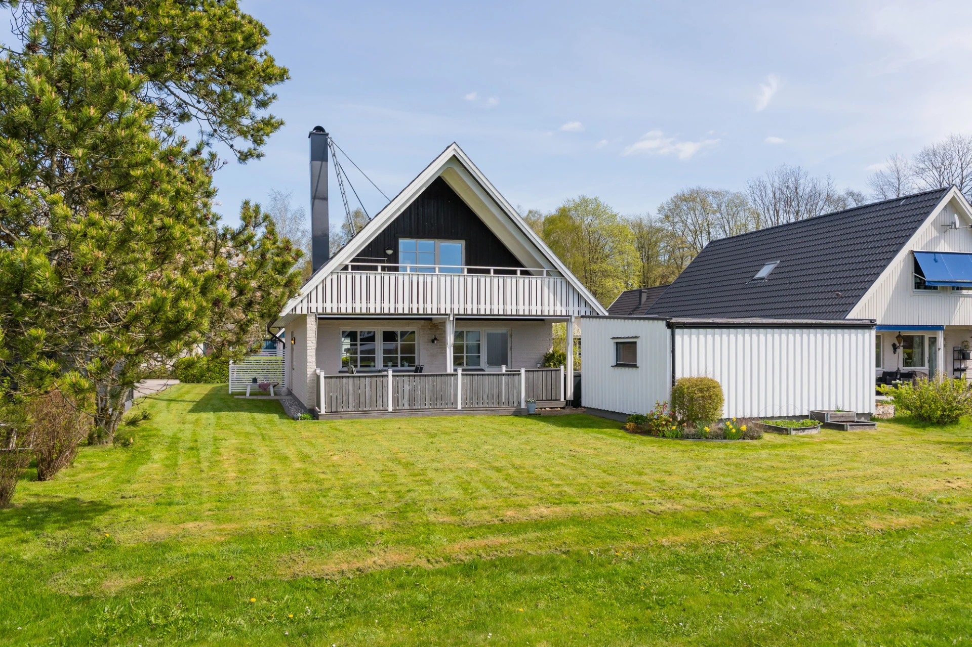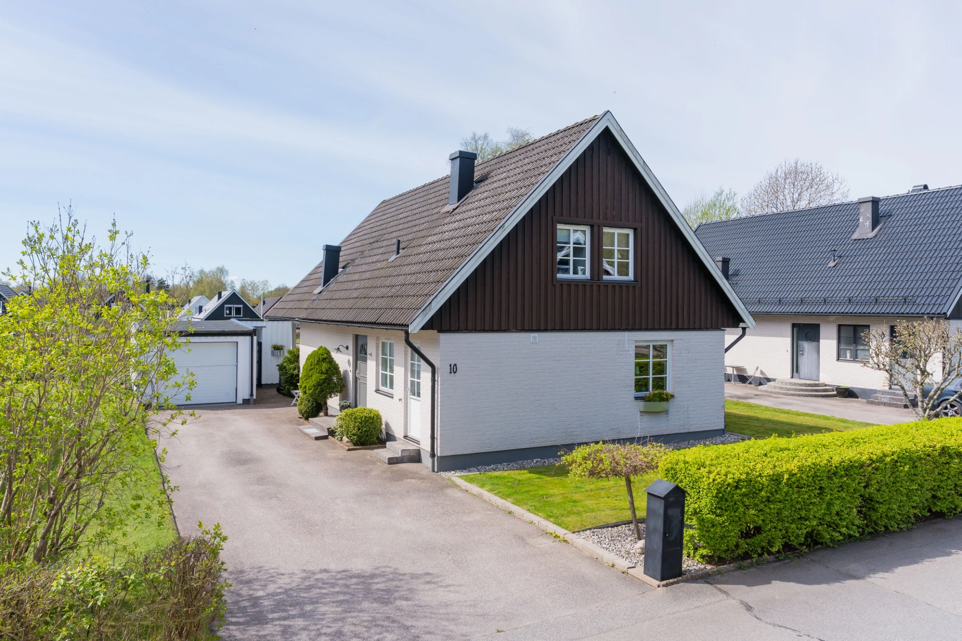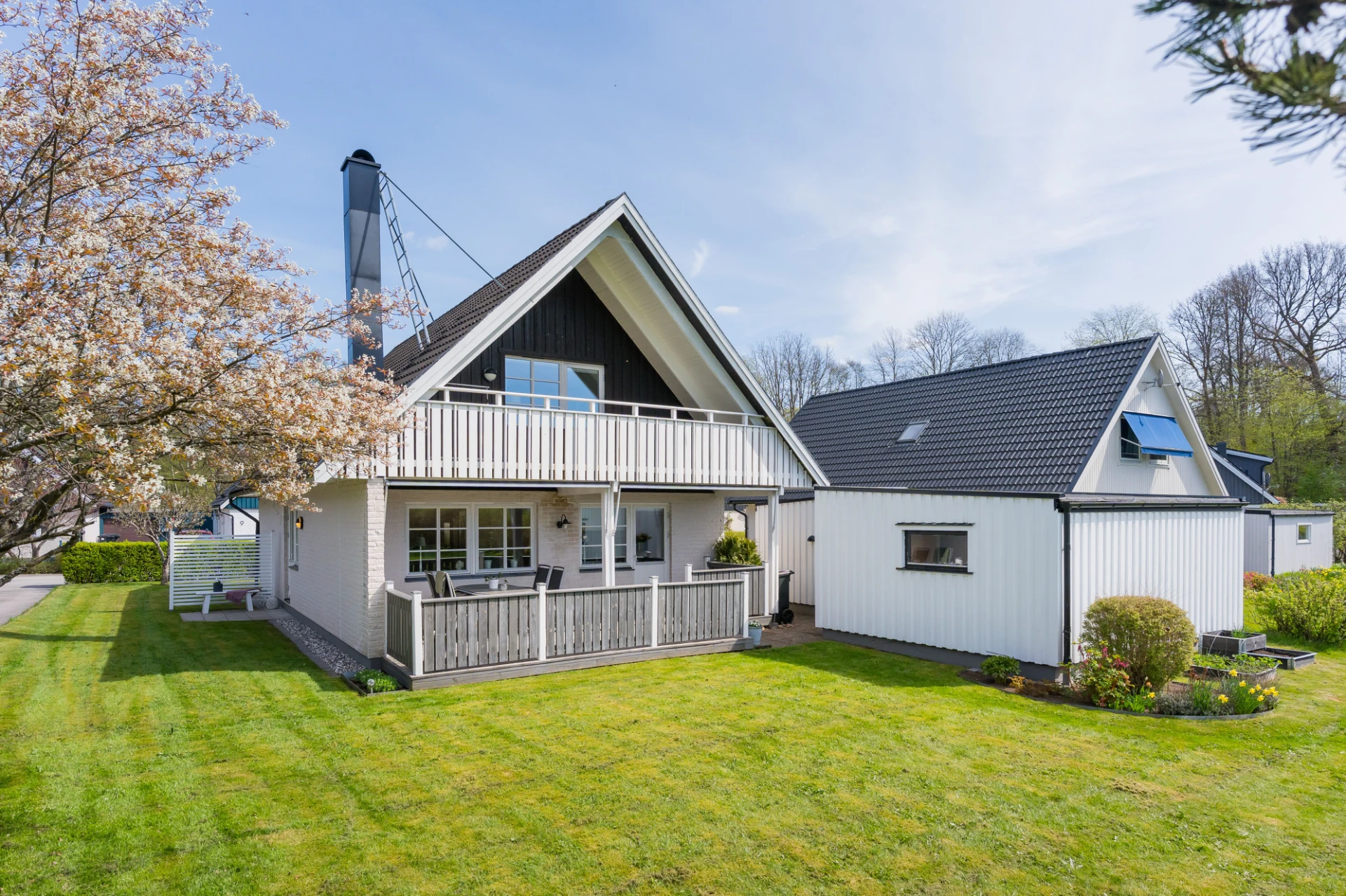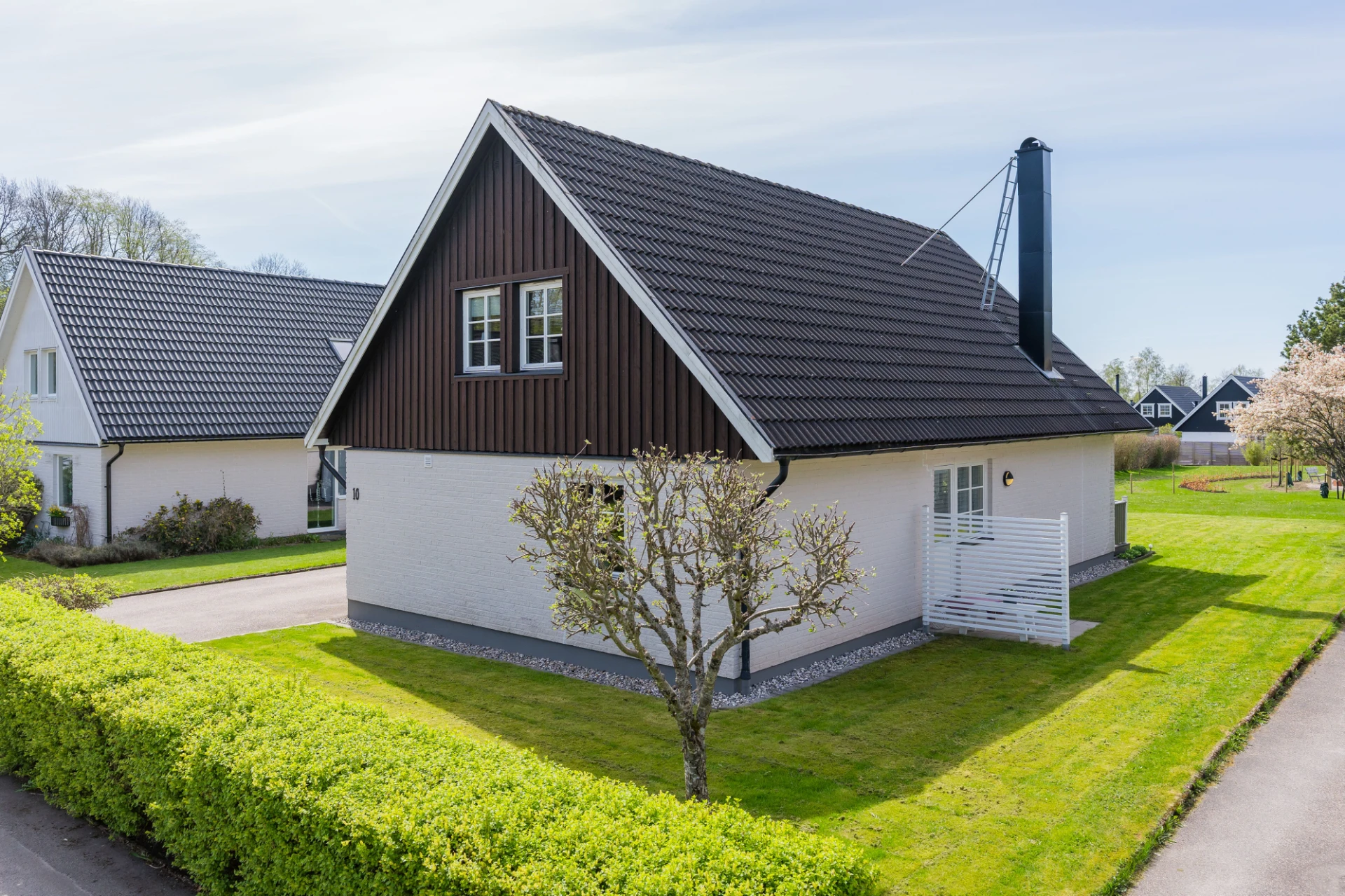 Det stora, härliga vardagsrummet bjuder på en mysig braskamin och gott om plats för både soffgrupp och övrig inredning. Golvet är klätt i ett stilrent fiskbensmönstrat parkettgolv, och de ljusa väggarna skapar en ljus och luftig atmosfär. Innan fanns det ett sovrum på nedre plan.